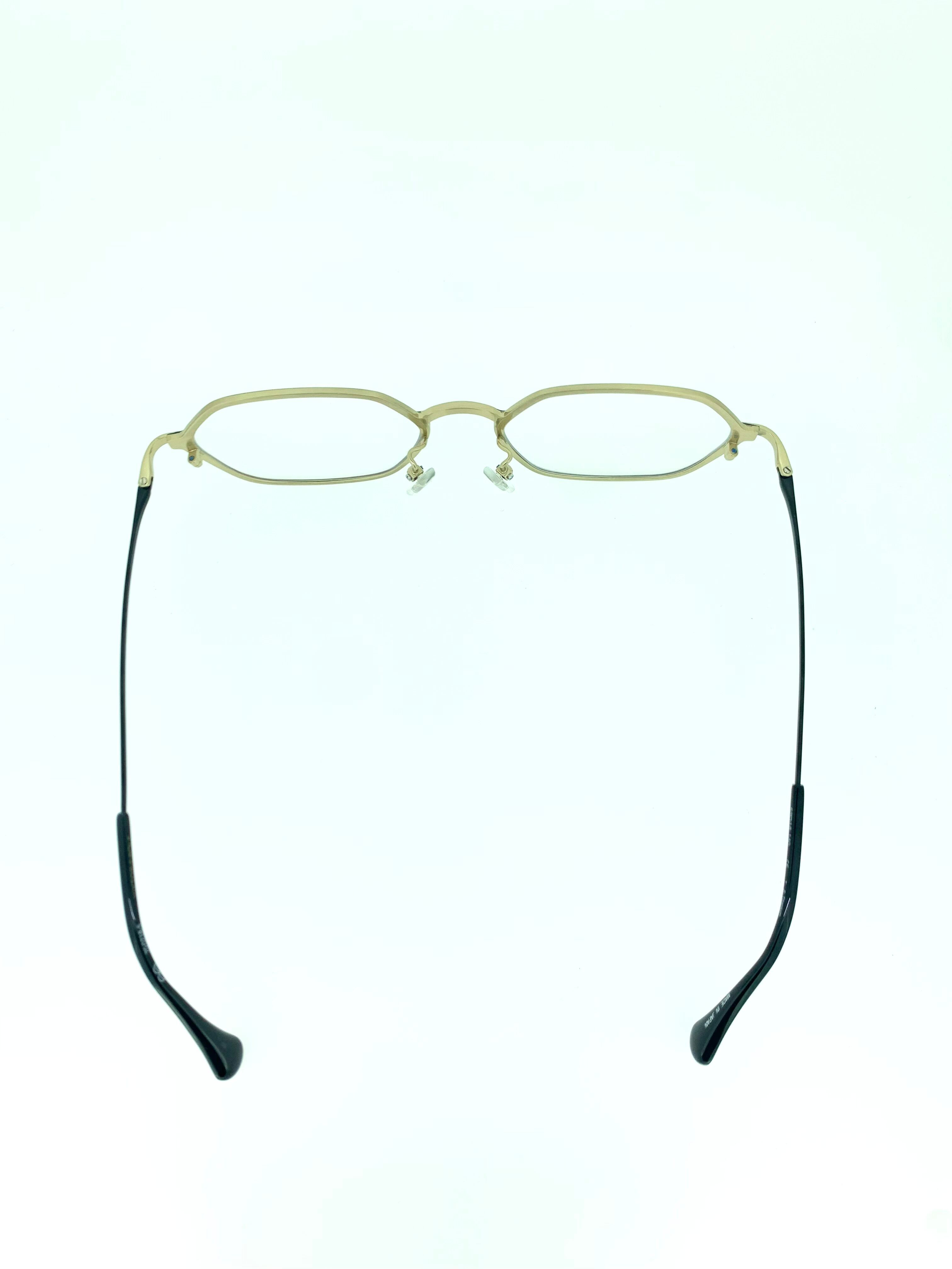 ヘキサゴンシェイプにブラック×ゴールドのバイカラーのメタル地が格好良いメタルフレーム。科学式のようなヘキサゴンシェイプの無機質さとブラック単色でメリハリをつけたカラーリングがクールな作品です。先セル(耳あて)先端にはシーリングスタンプのようなロゴマークがデザインされているのもポイントです。