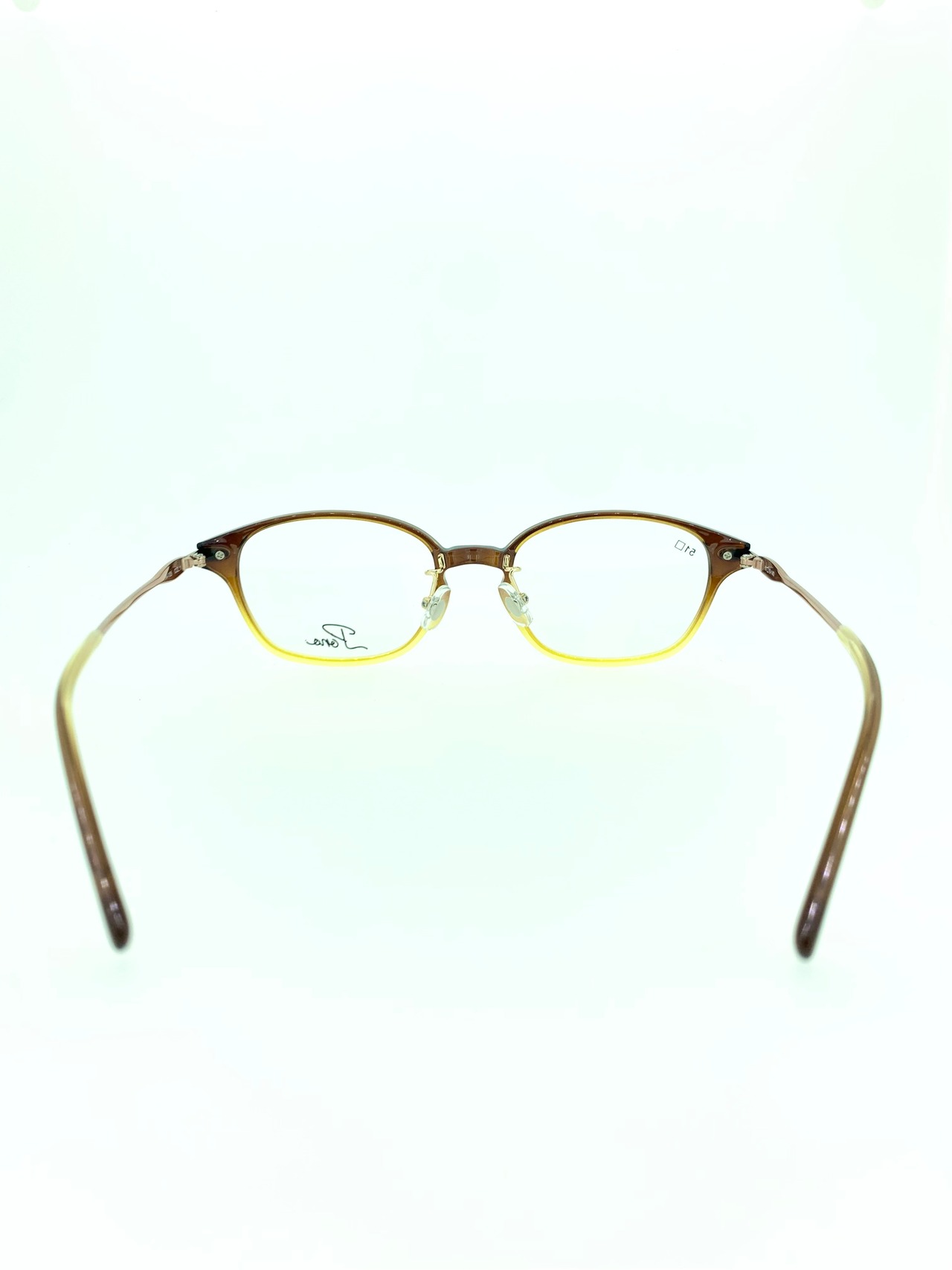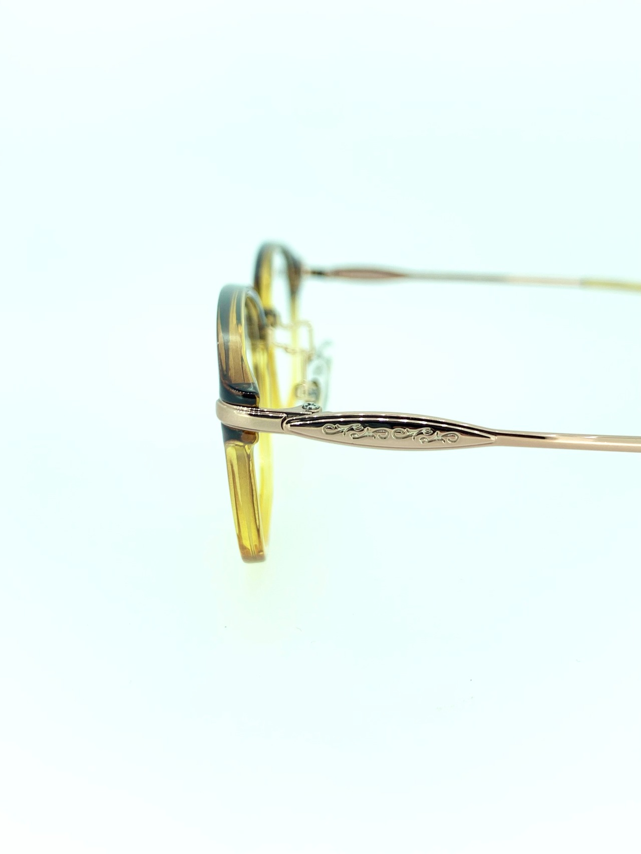 天地浅めなウェリントンシェイプのセルフロントは、樹木から流れ落ちる樹液のような美しいクリアセルが特徴的なコンビネーションフレーム。暖色系のグラデーションと透き通るようなクリア感がたまりません。テンプルのメタルは雰囲気を合わせたブラウンゴールドを採用し、アースカラーに統一した上でスタイリングを引き締めています。