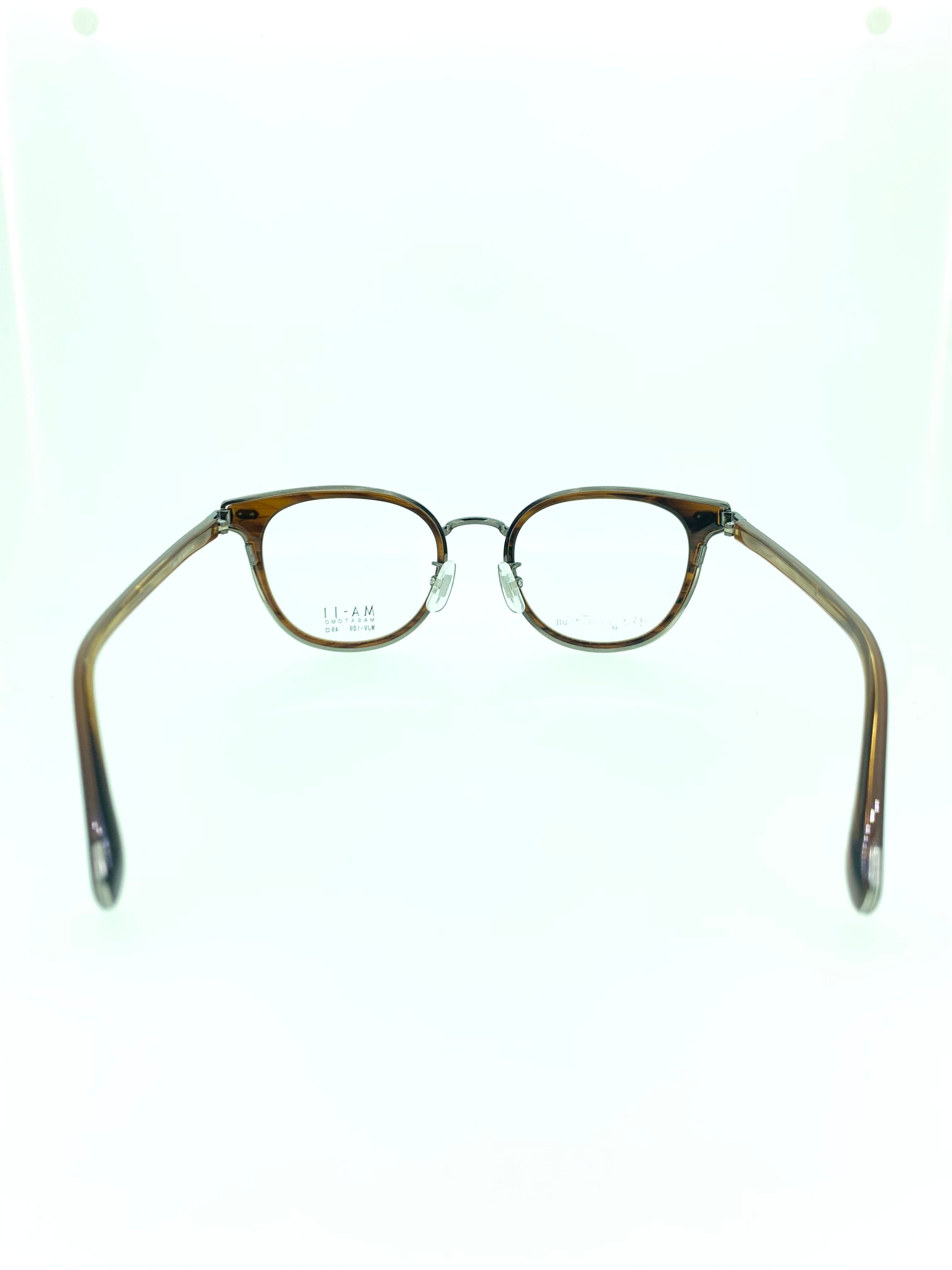 アンバーカラーのセルを重厚感のあるシルバーメタルを包み込むデザインがお洒落なコンビネーションフレーム。ヨロイ部分が強調されたボストンシェイプのフロントは、蝶の羽のような特徴的なフォルムに仕上がっています。エッジの効いたデザインなのにどこか奥ゆかしさも感じる個性的なデザインがオススメの作品となっています。