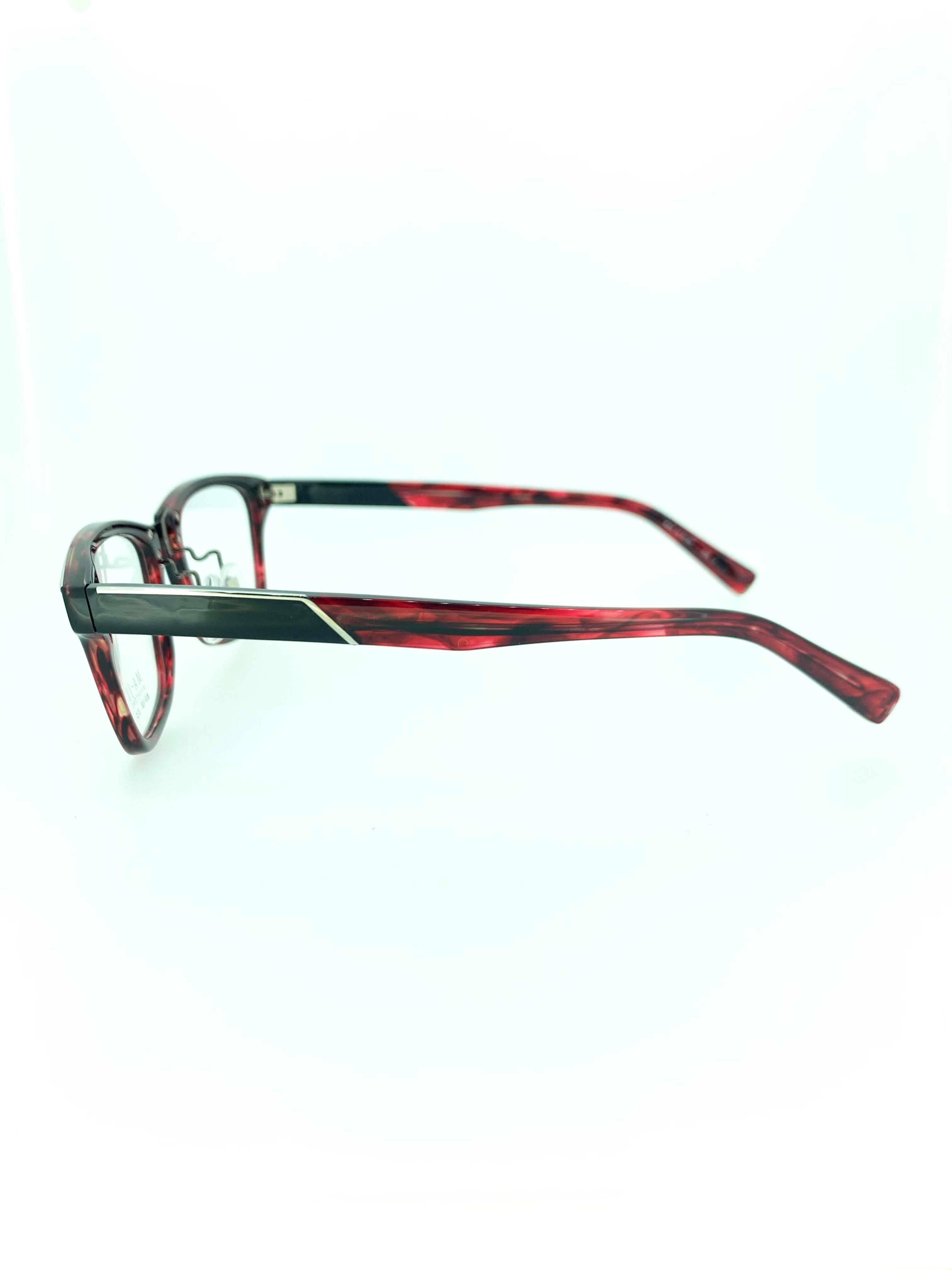 ブラック×ワインレッドのコントラストに混ざり合った模様がアートのように綺麗なコンビネーションフレーム。ワイルドで深みもあるバイカラーのデザインにウェリントンシェイプの大人の色気が抜群にマッチしたお洒落な作品です。ブリッジをシルバーメタルにすることでクールで上品な印象も上乗せされていて良い味を出していますね。
