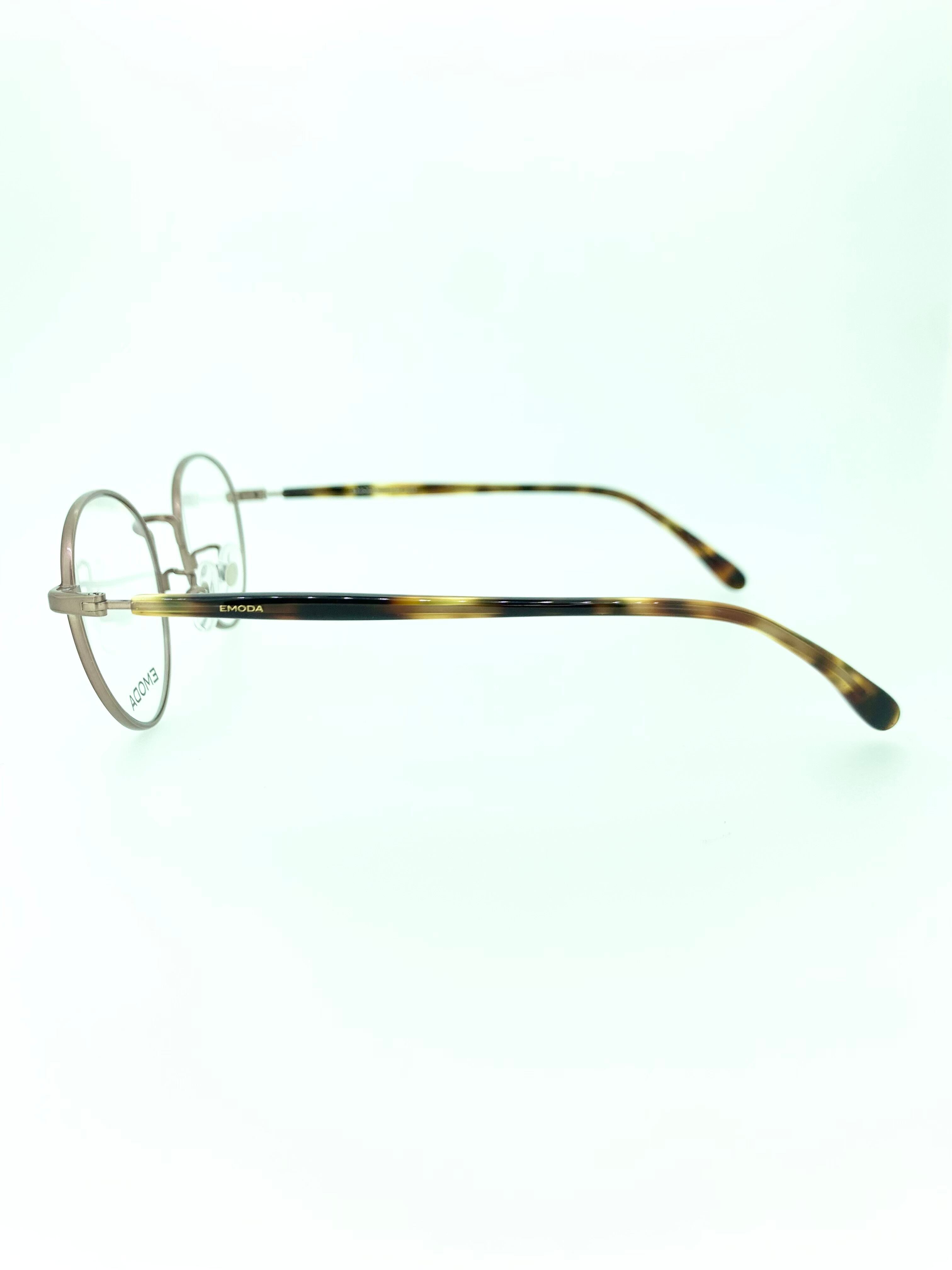 やや小玉で主張しないボストンシェイプにレトロな雰囲気のあるアンバーカラーが相性抜群のコンビネーションフレーム。丸セルテンプルに定番のデミ柄を採用したりブリッジデザインをクラシカルなスタイルで統一したことで、レトロ感を維持しながら扱いやすいモダンなデザインへと昇華させています。丁寧な加工技術やシンプルで魅せるお洒落感はワンランク上の1本に仕上がりました。
