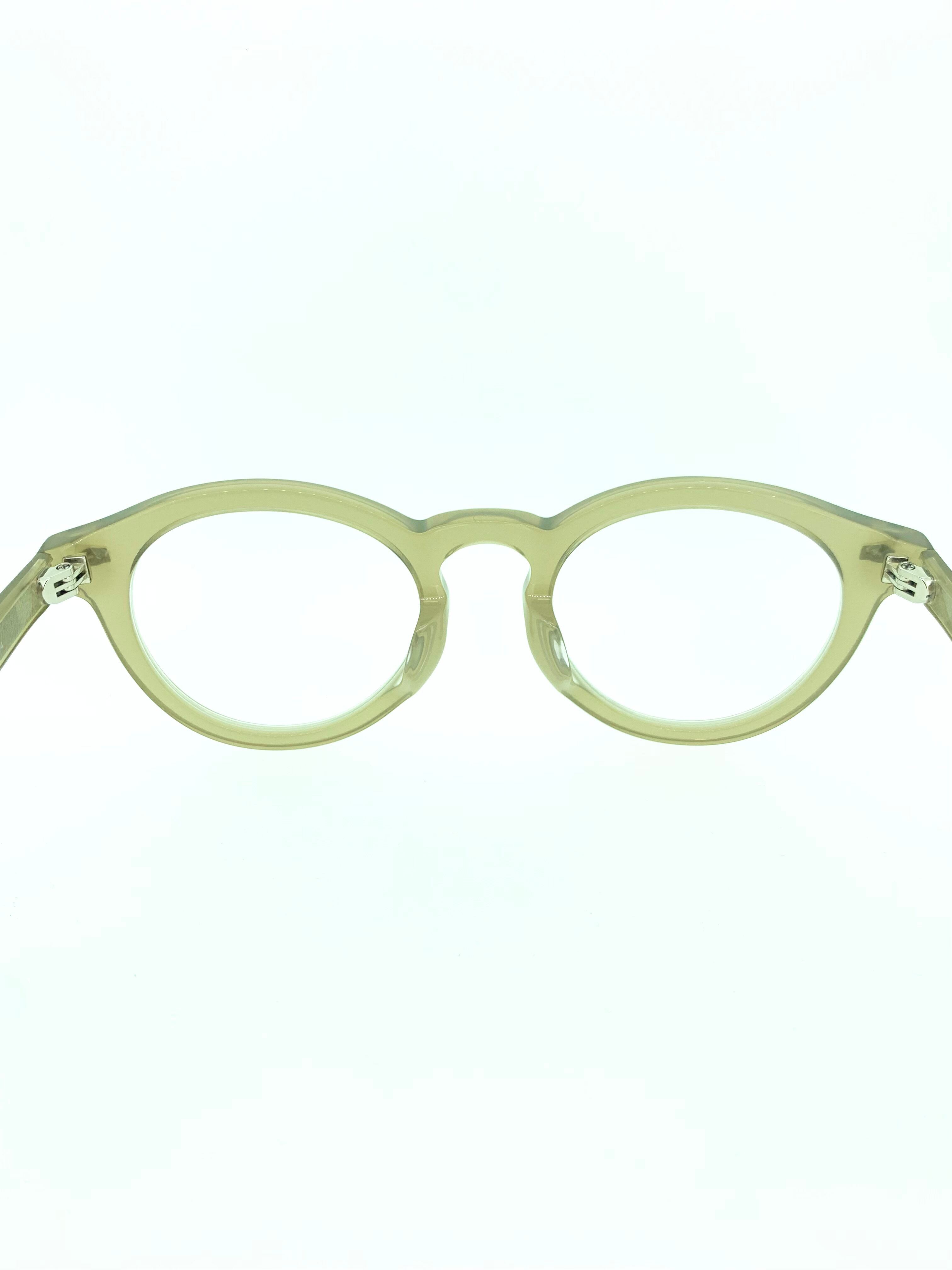 太セルのボストンシェイプにクリアカーキの色味が刺さるお洒落なセルフレーム。ブラックやブラウンデミ・スケルトンには無い独特な色味で、肉厚のセルフレームながら淡いカラーリングでカジュアルにかけられるデザインになっています。ブリッジはクラシカルなキーホールブリッジを採用し、シンプルなデザインながらも丁寧なセル加工やシルエットで魅せるオススメの作品です。