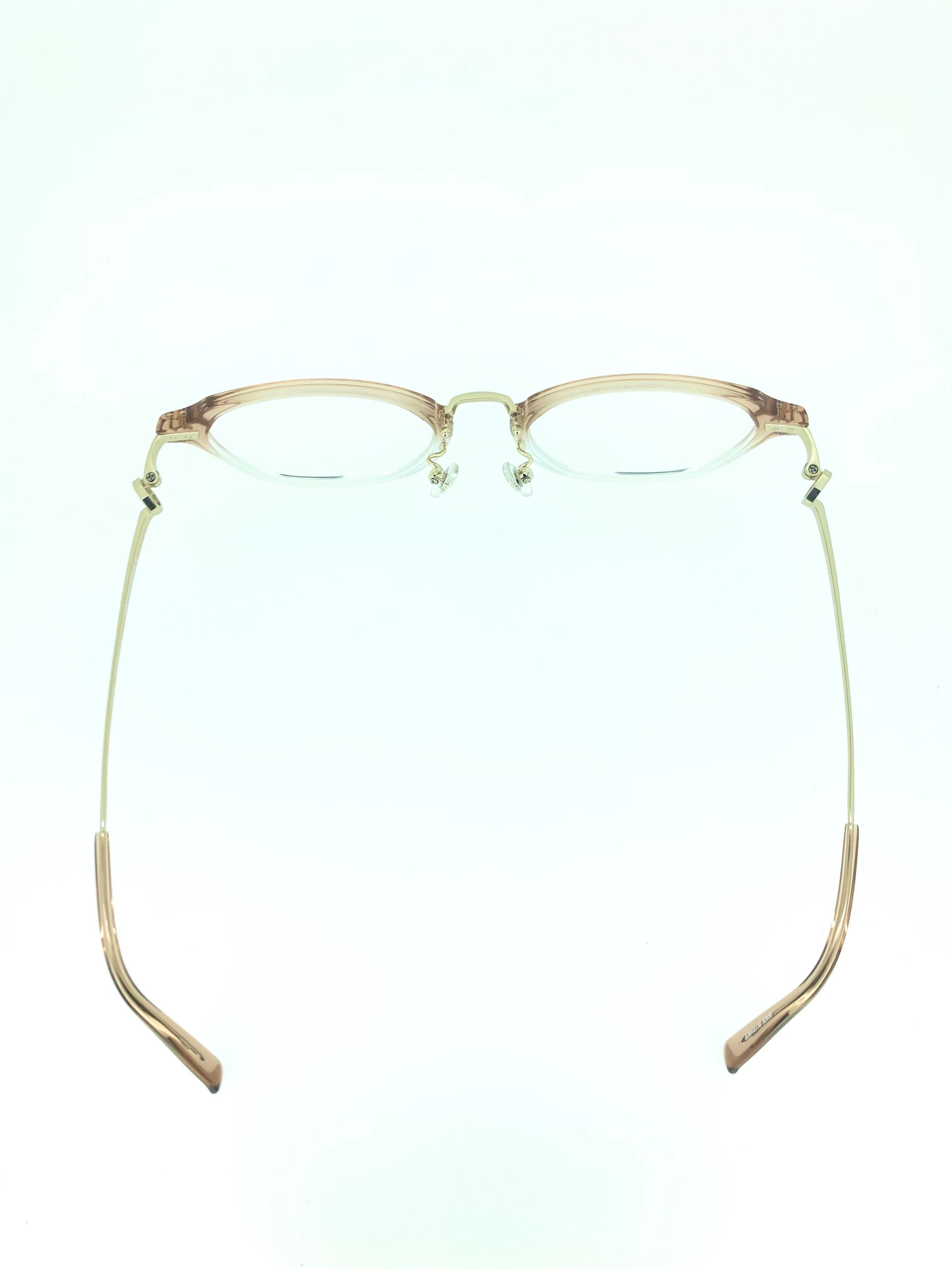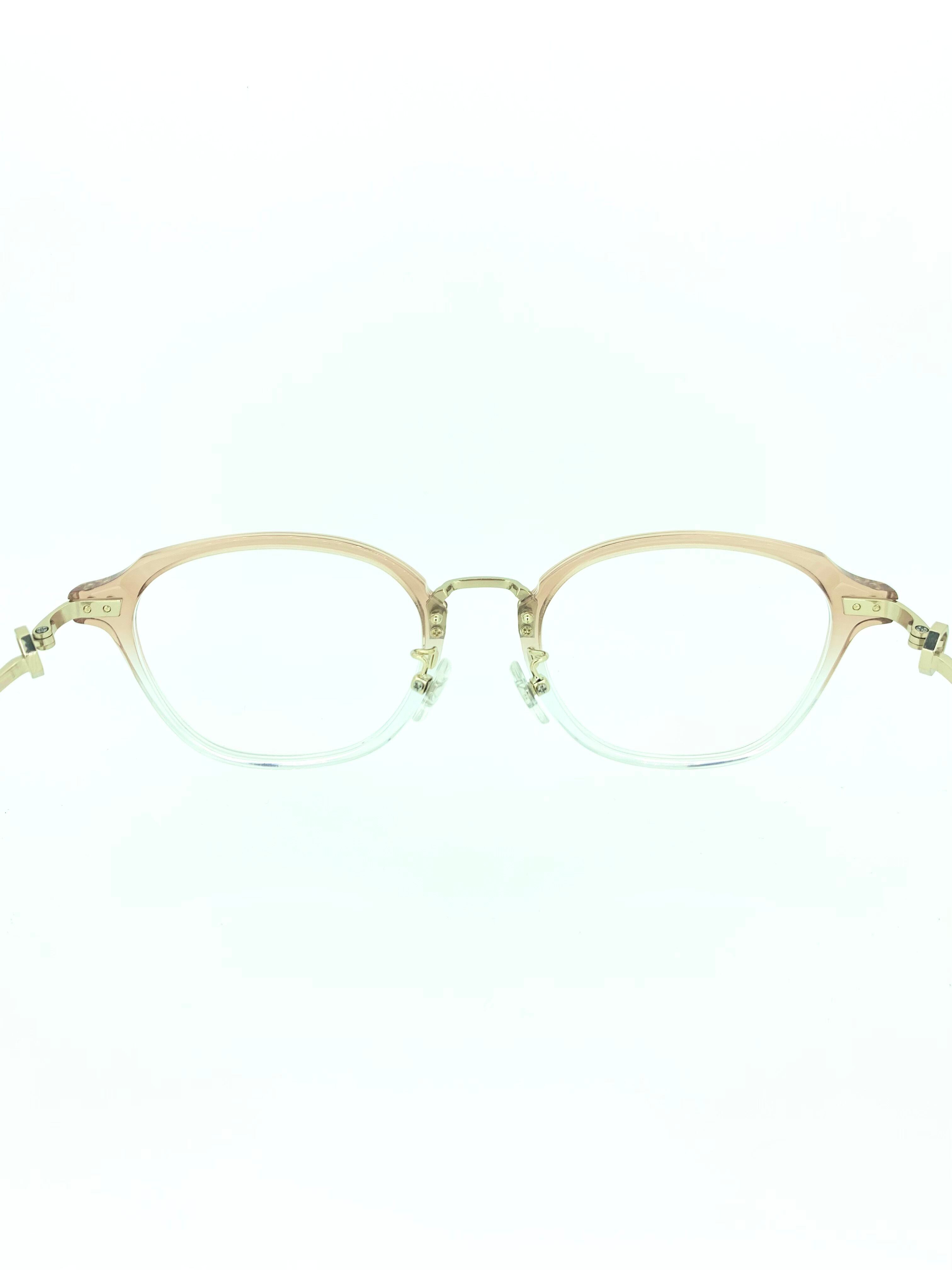 赤みがかったブラウンカラーに淡いグラデーションのセル生地がお洒落なウェリントンシェイプのコンビネーションフレーム。包み込むような暖かみと清楚さを感じさせるデザインはクリアセルの良さが詰まった作品となっています。テンプルに施されたオクタゴンカットのデザインもポイントにアクセントを効かせたセンスが光る秀逸な1本です。