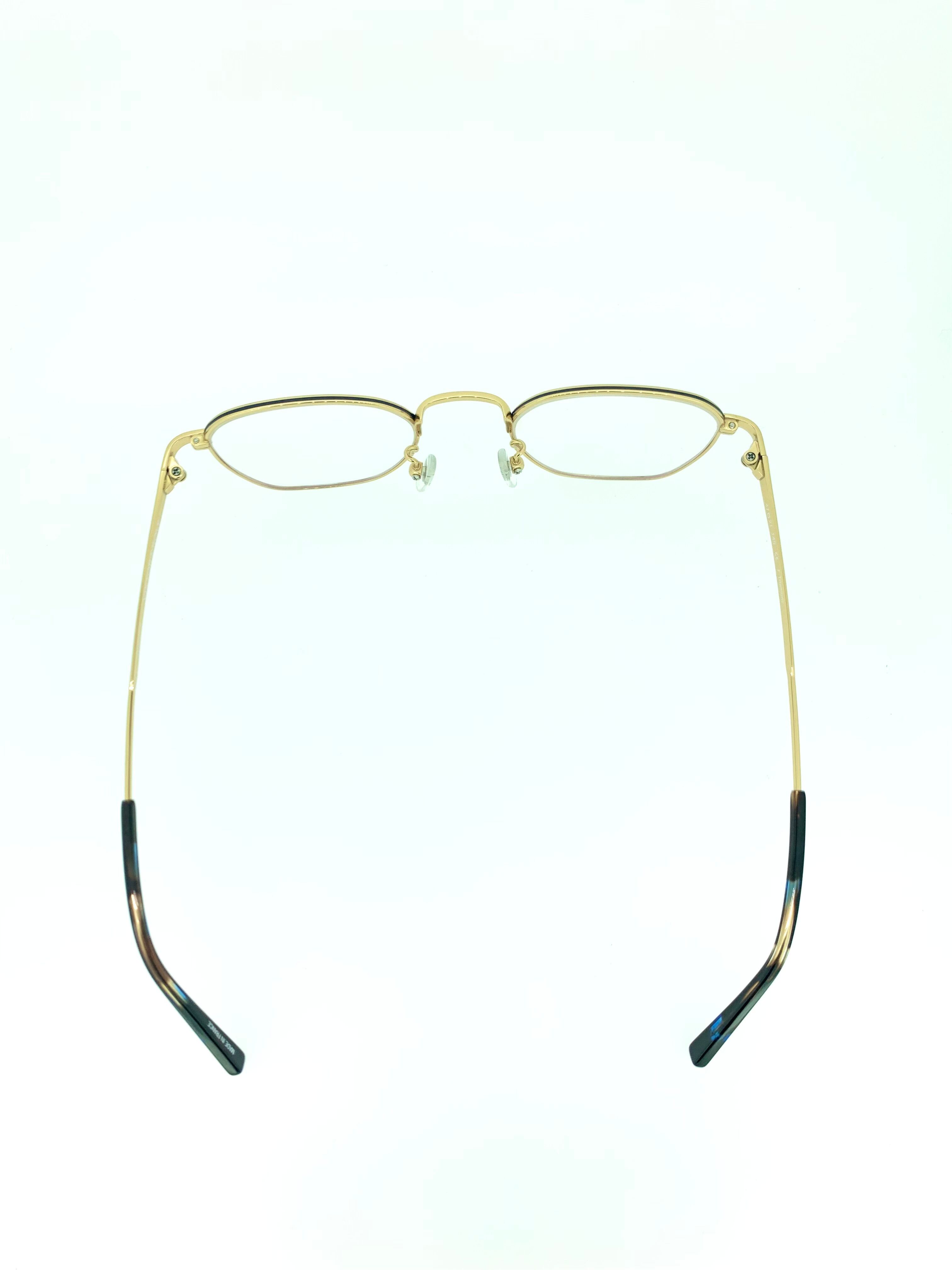 海の底のようなミッドナイトブルーのフロントリムカラーに台形のようなオクタゴンシェイプが独特な雰囲気を醸し出すメタルフレーム。先セル(耳当て)にはフロントより明るめなクリアブルーが混ざった揺らぎを感じるマーブル柄が綺麗な作品です。深みのある色味を活かすような明るいイエローゴールドの細身メタルでスッキリと引き締めた華やかなアイテムとなっています。