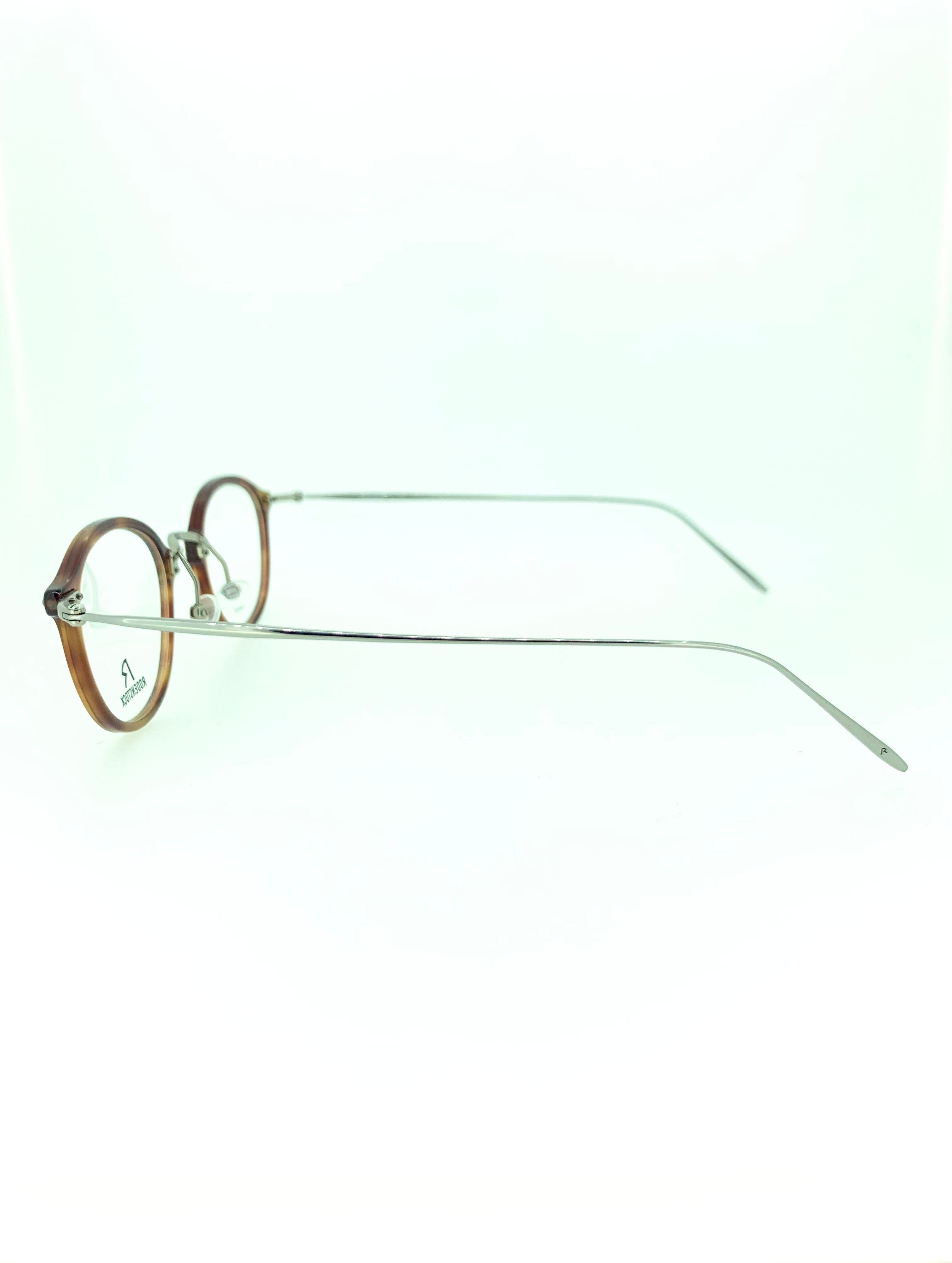 レトロ感のあるブラウンデミのセルリムに清潔感のあるシルバーメタルを合わせたボストンシェイプのコンビネーションフレーム。テンプルは先セル(耳当て)の無いフルメタル仕様になっているため、クラシカルの中にもスタイリッシュな雰囲気を忘れない大人な作品に仕上がりました。鼻パッドも丸型を採用するなど細部までこだわったセンスの光るアイテムです。