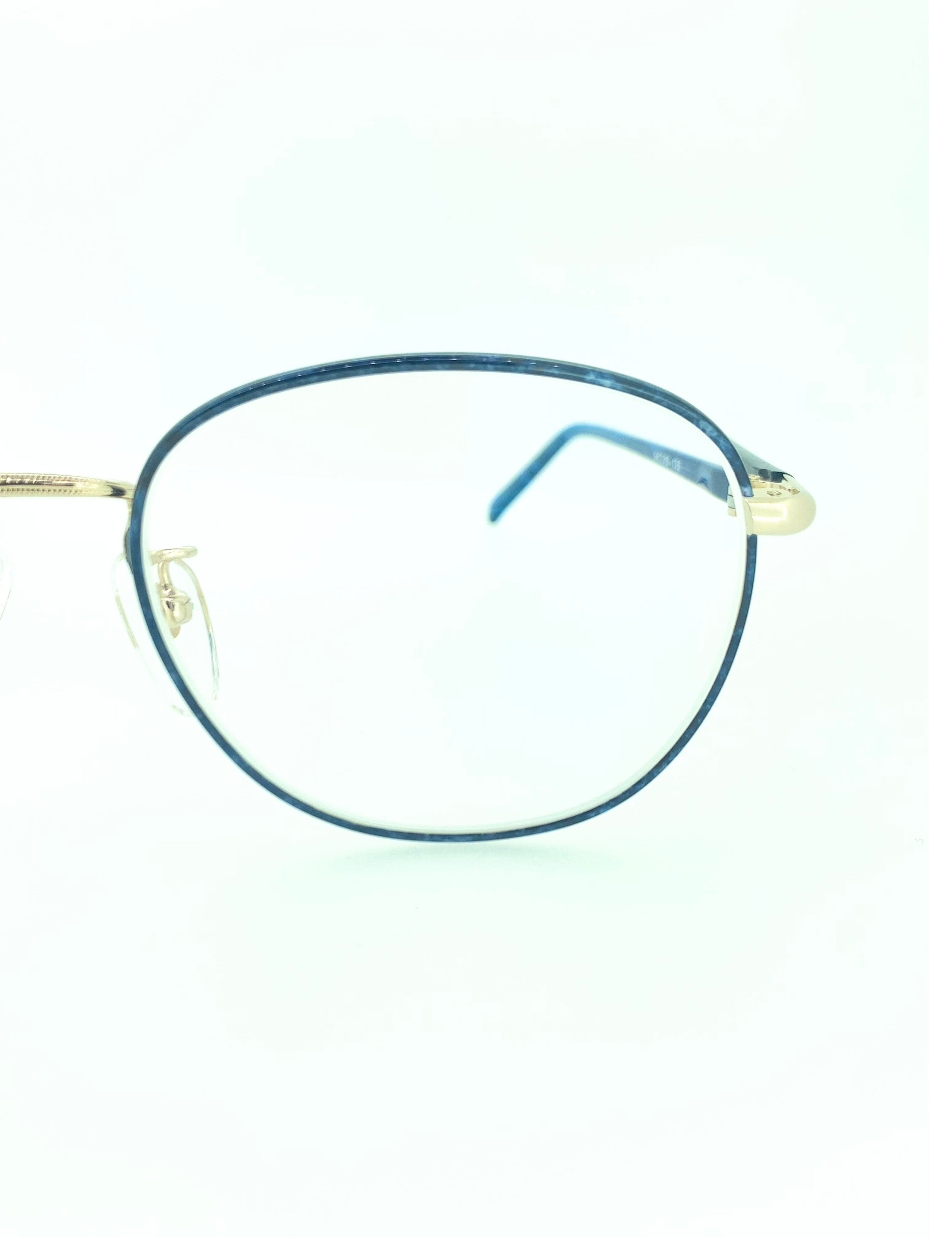 華やかさのあるゴールドメタルにラピスラズリのようなアイアンブルーのマーブルカラーが綺麗なメタルフレーム。フロントは二重リムとモダンなデザインでレトロ感のあるボスリントンシェイプと調和しています。時代と逆行した深みのあるデザインはヴィンテージの良さといった作品となっています。細身のメタルなので顔馴染みが良いのもポイントです。