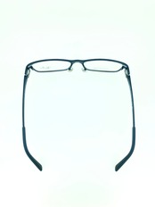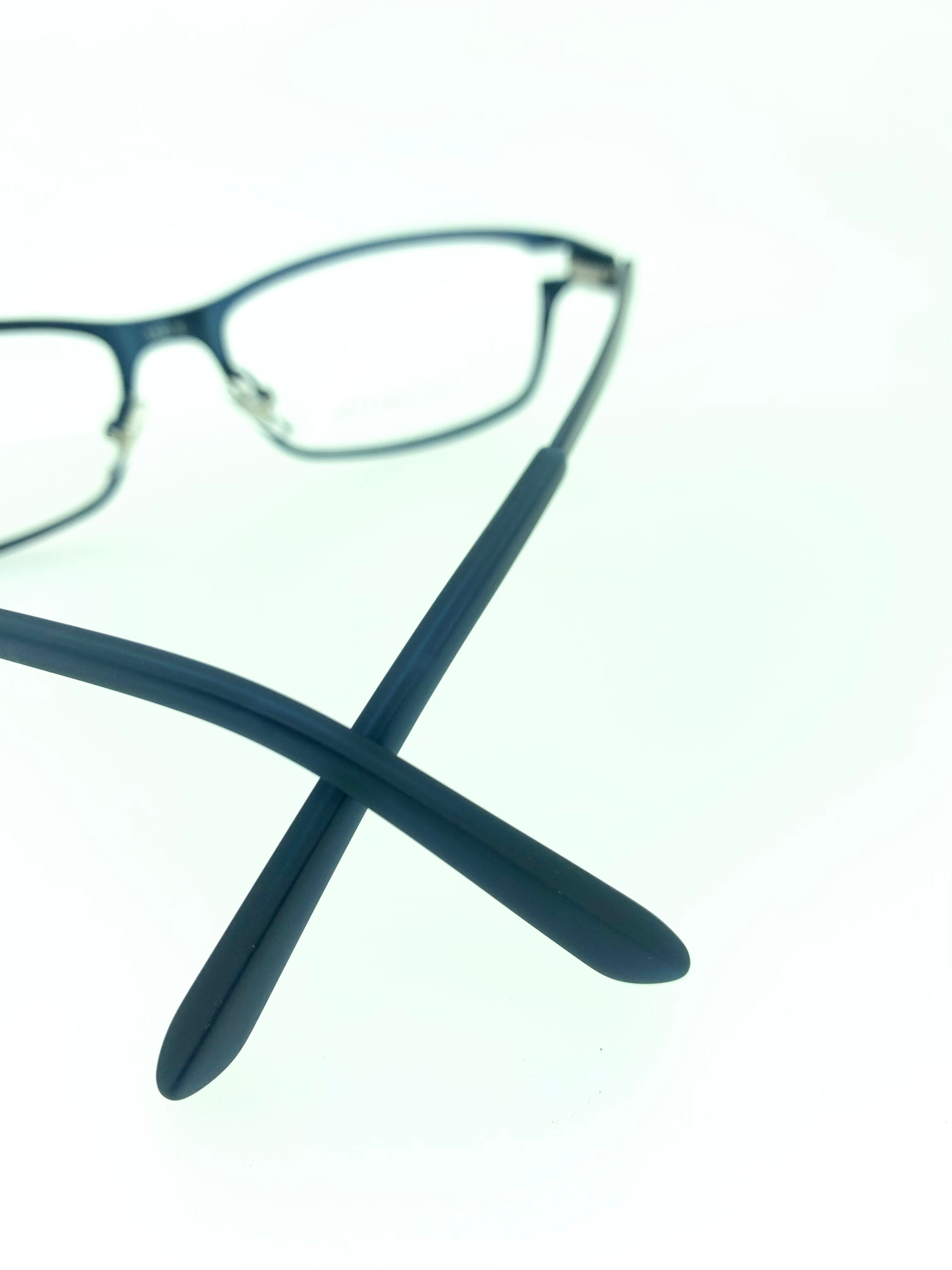 メタリックネイビーのチタン生地にスクエアシェイプのキリッとしたシルエットが映えるメタルフレーム。ヨロイ部分の一部はリムレスデザインとなっていて、スッキリとした印象と遊びの効いたクールな雰囲気を醸し出しています。サラっとした塗装の肌ざわりの良い質感とスプリング丁番の柔軟にフィットする機能性にも優れた作品となっています。