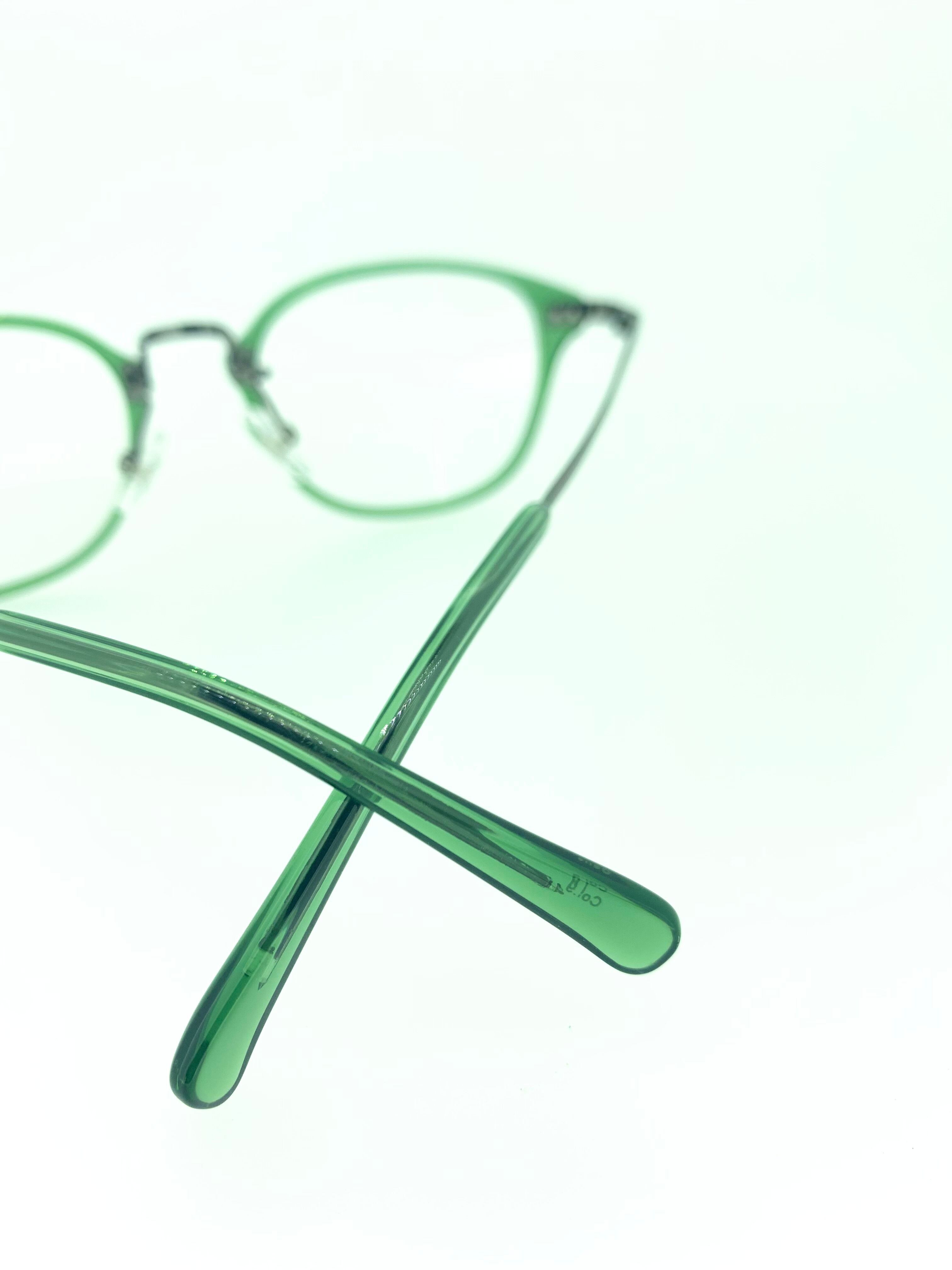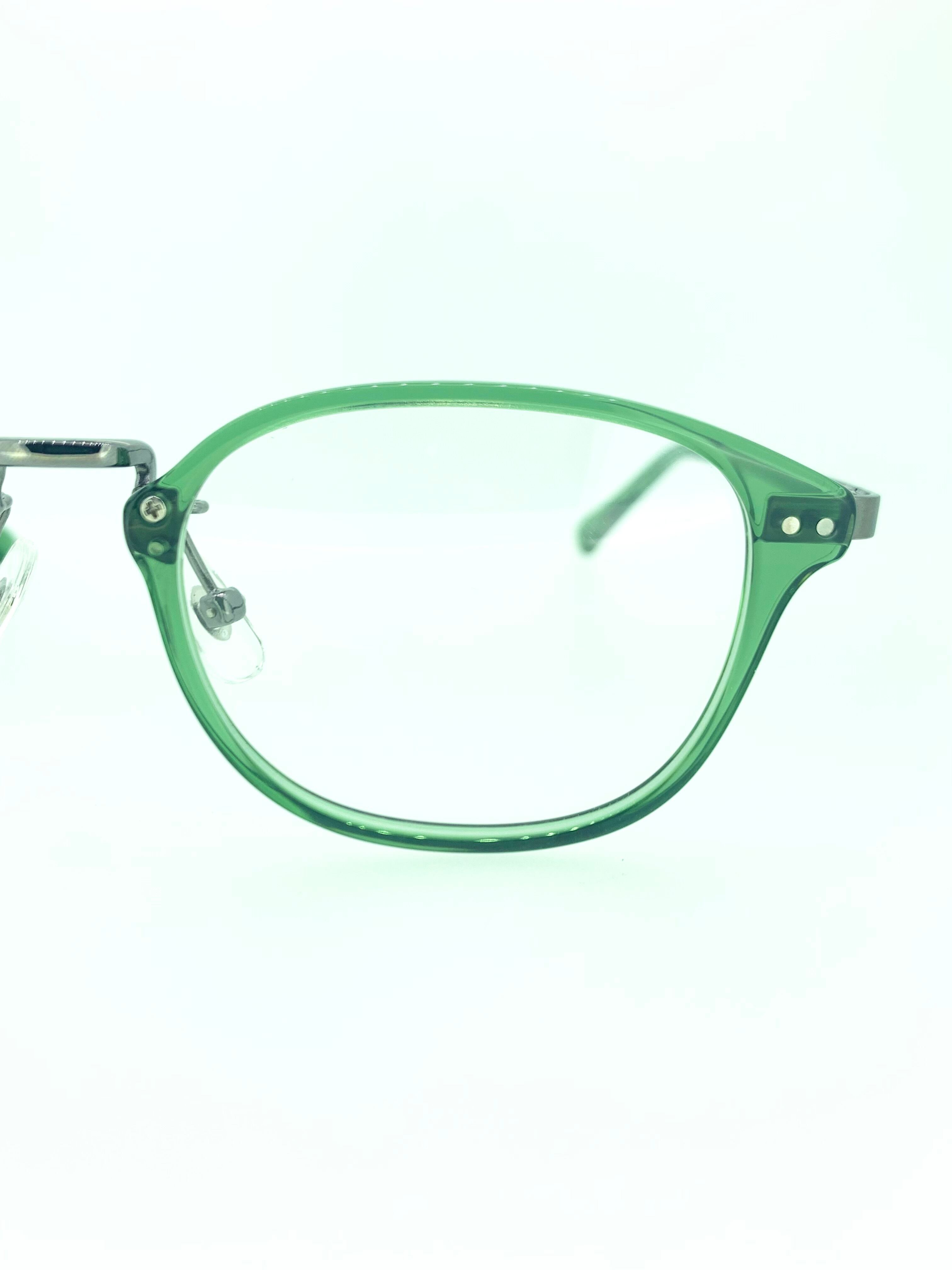 クリアグリーンのセル生地とアイアンメタルを合わせたカジュアルながらも個性溢れるコンビネーションフレーム。ブリッジの接続部分にネジをあえて見せたり、メタルを重厚感のあるアイアンカラーにすることでシックにまとめたデザインとなっています。余計なデザインを加えずにカラーリングと質感で綺麗にまとめられた秀逸な1本です。