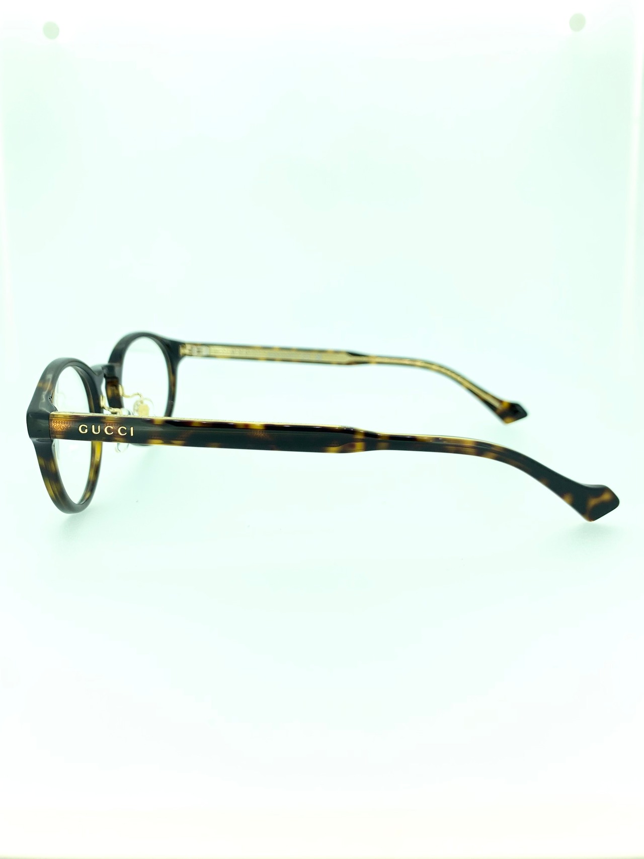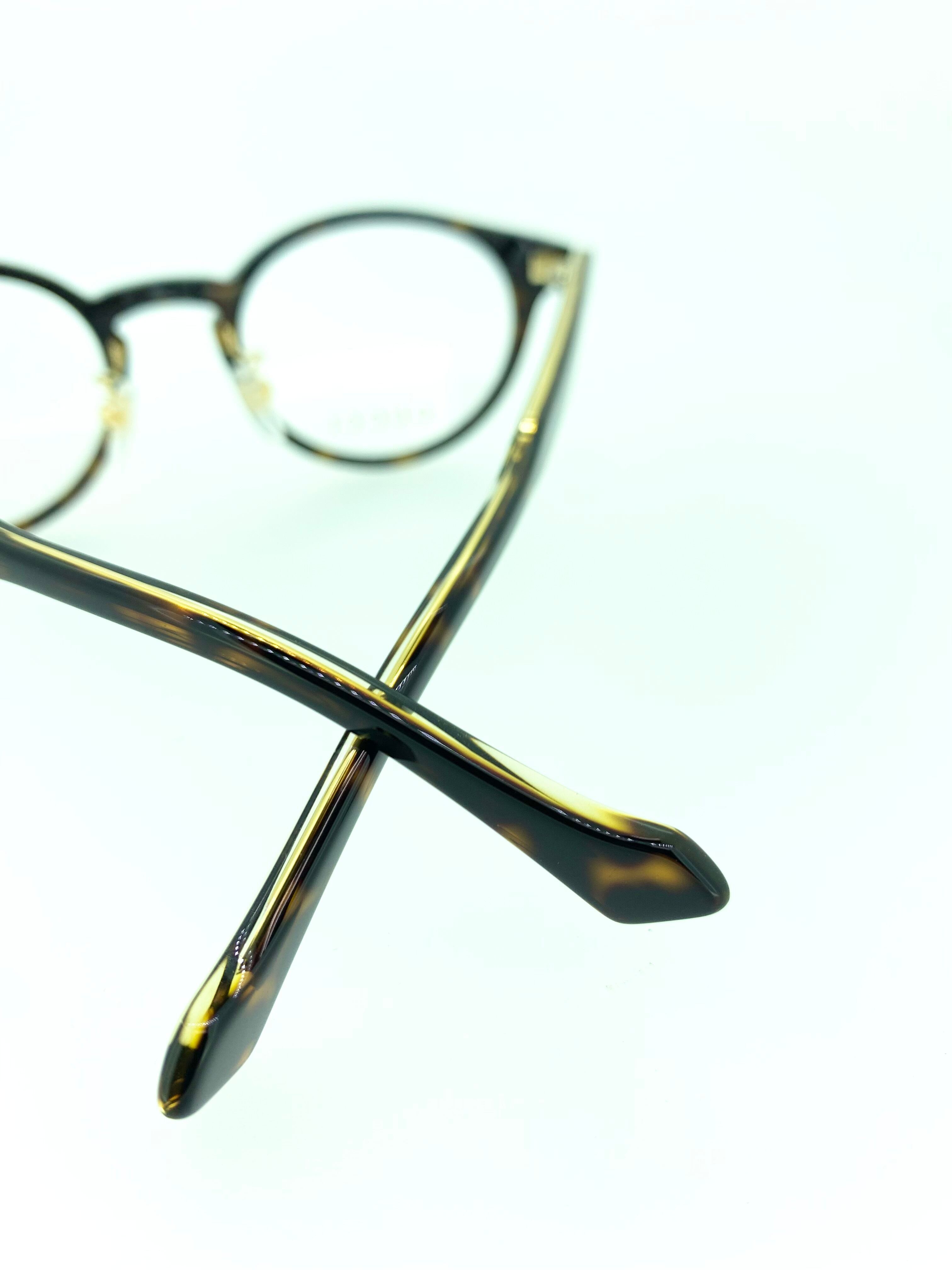 ラウンドのような綺麗な曲線が魅力的なボストンシェイプのセルフレーム。ヨロイ部分が少しツンっとしたデザインになっているので、中性的なシルエットで万人にマッチする優秀な作品となっています。テンプルのインナーはスケルトンカラーを採用することで、細やかな装飾を施したゴールドメタルの中芯が見えるデザインになっていて、煌びやかな高級感がGUCCIらしい作品にまとまりました。