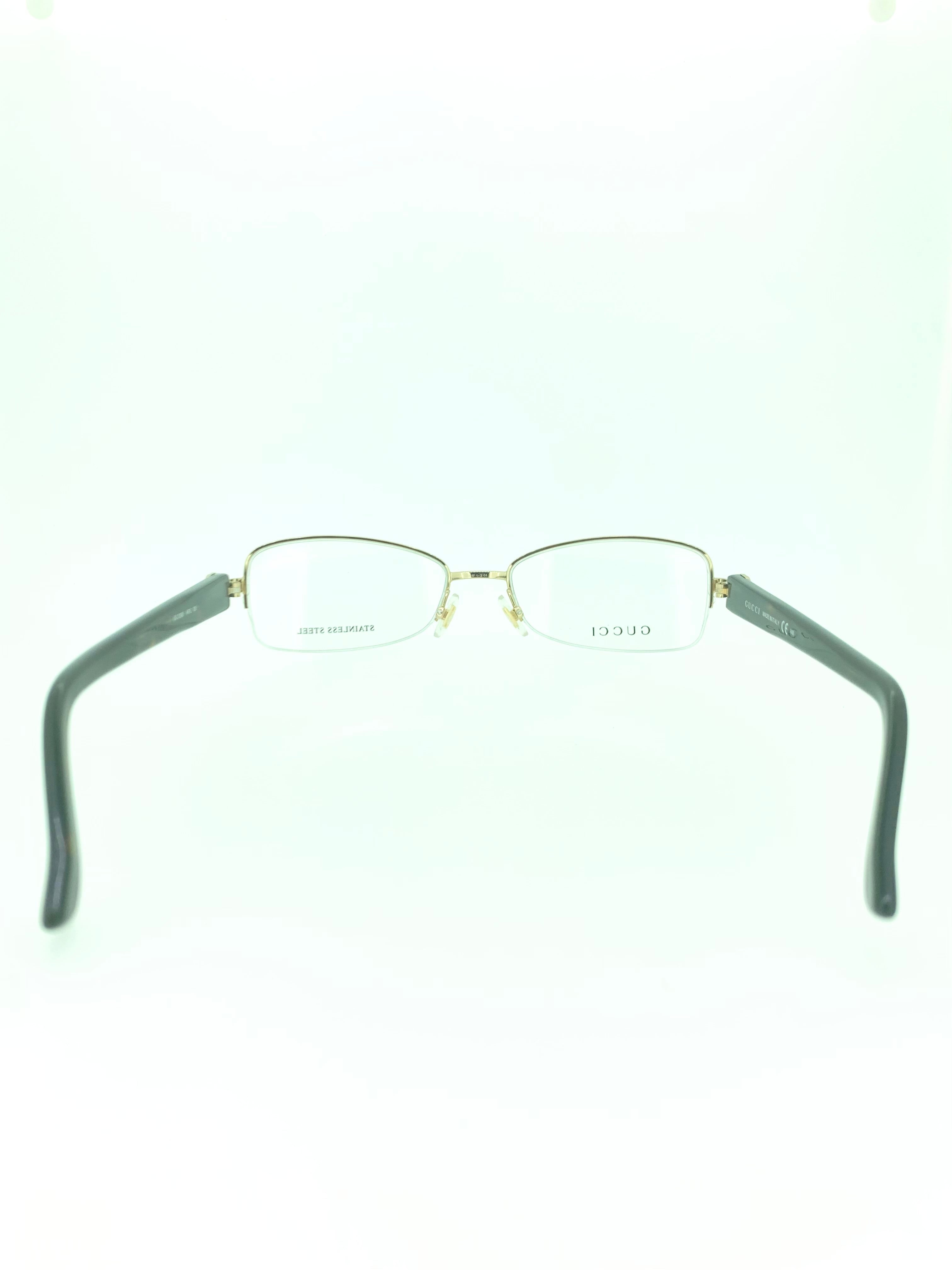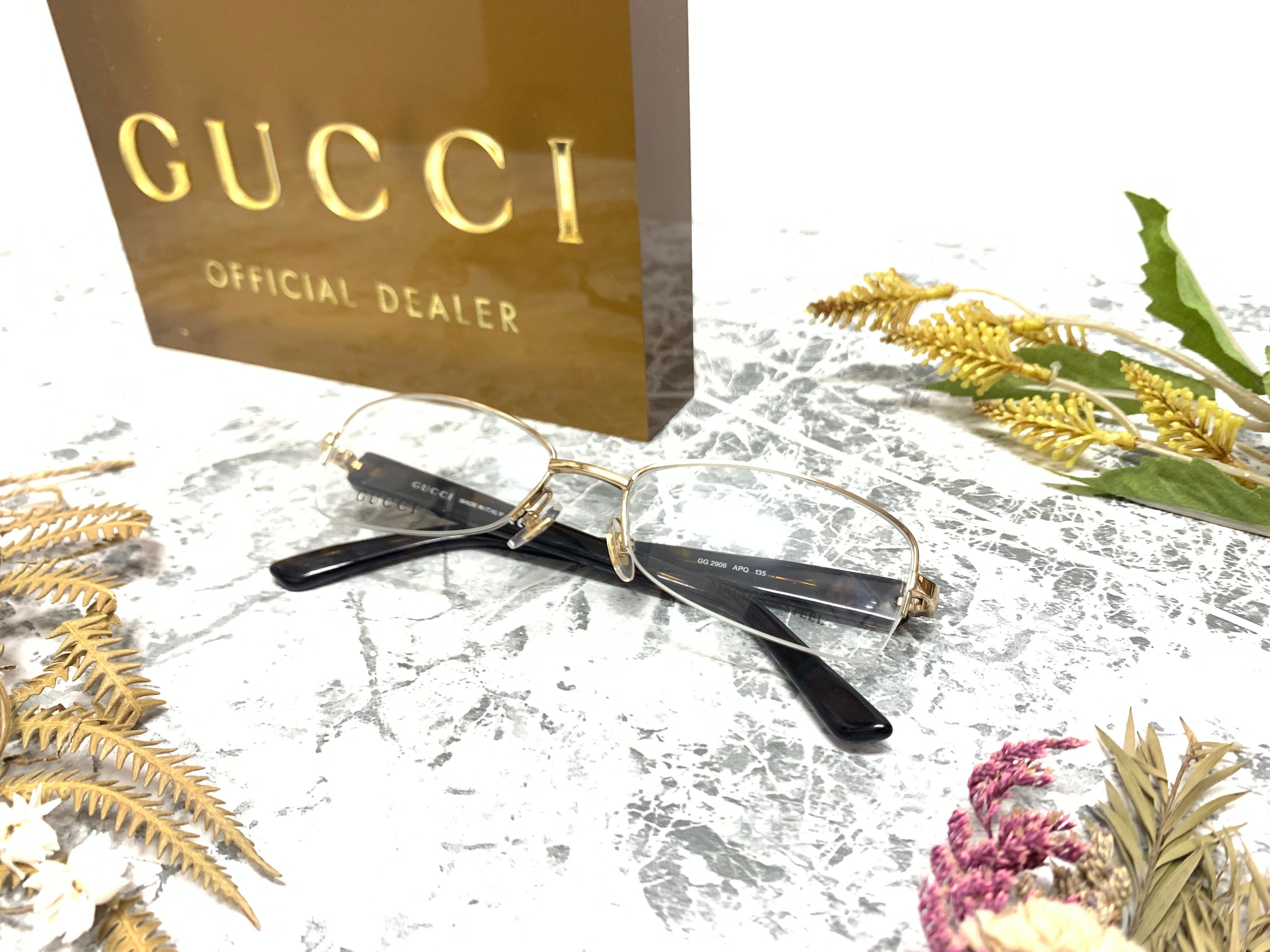 目尻に幅を持たせたスクエアシェイプがバタフライデザインのように個性的でお洒落なナイロールフレーム。スッキリとしたゴールドメタルのフロントに対して、幅を持たせたセルテンプルでバランスが取れた高級感のある作品です。セルテンプルにワンポイントで施されたGUCCIのロゴマークは立体的で洗練された雰囲気で、一流ブランドらしくシンプルにまとめられた綺麗な作品です。