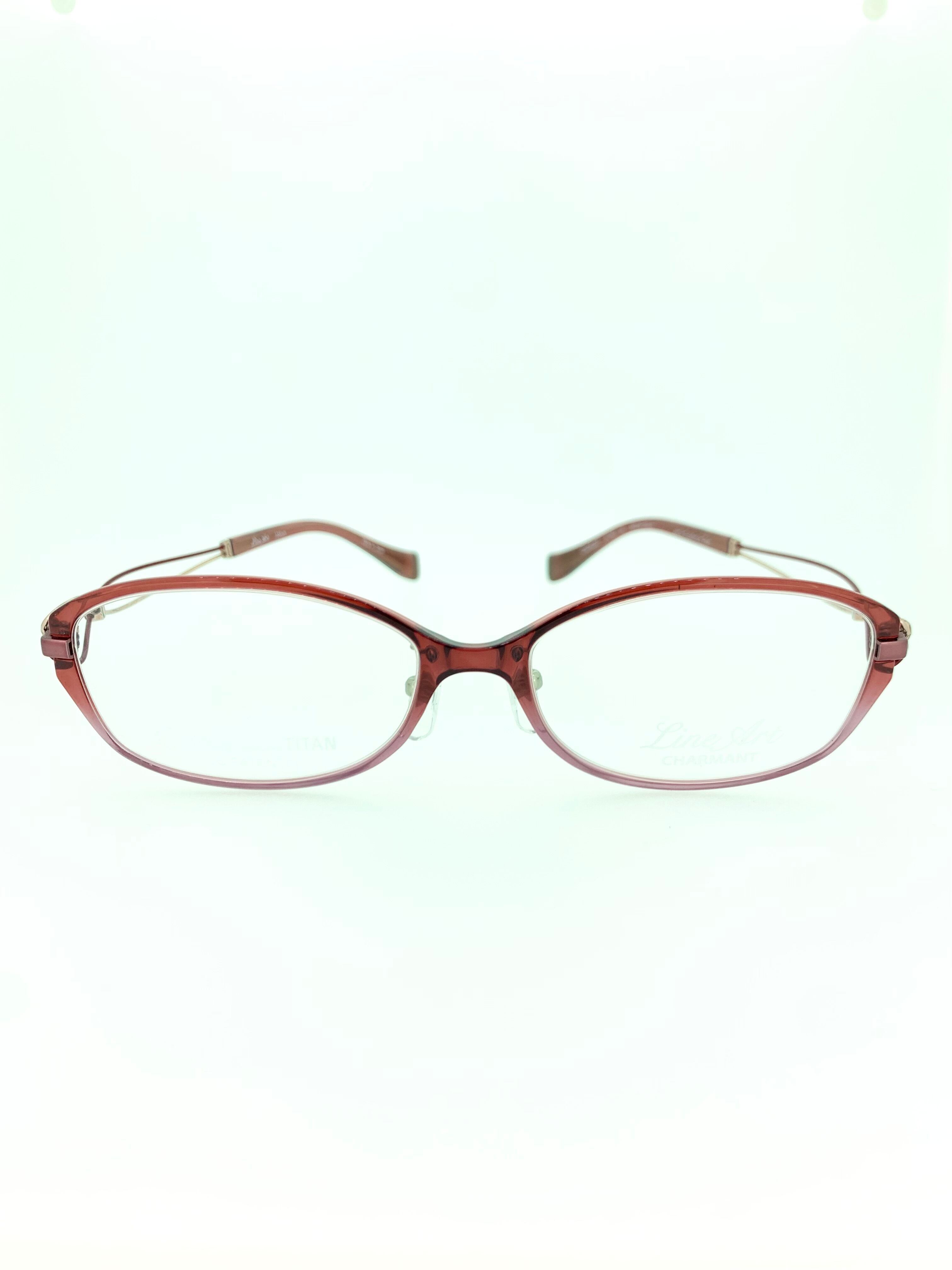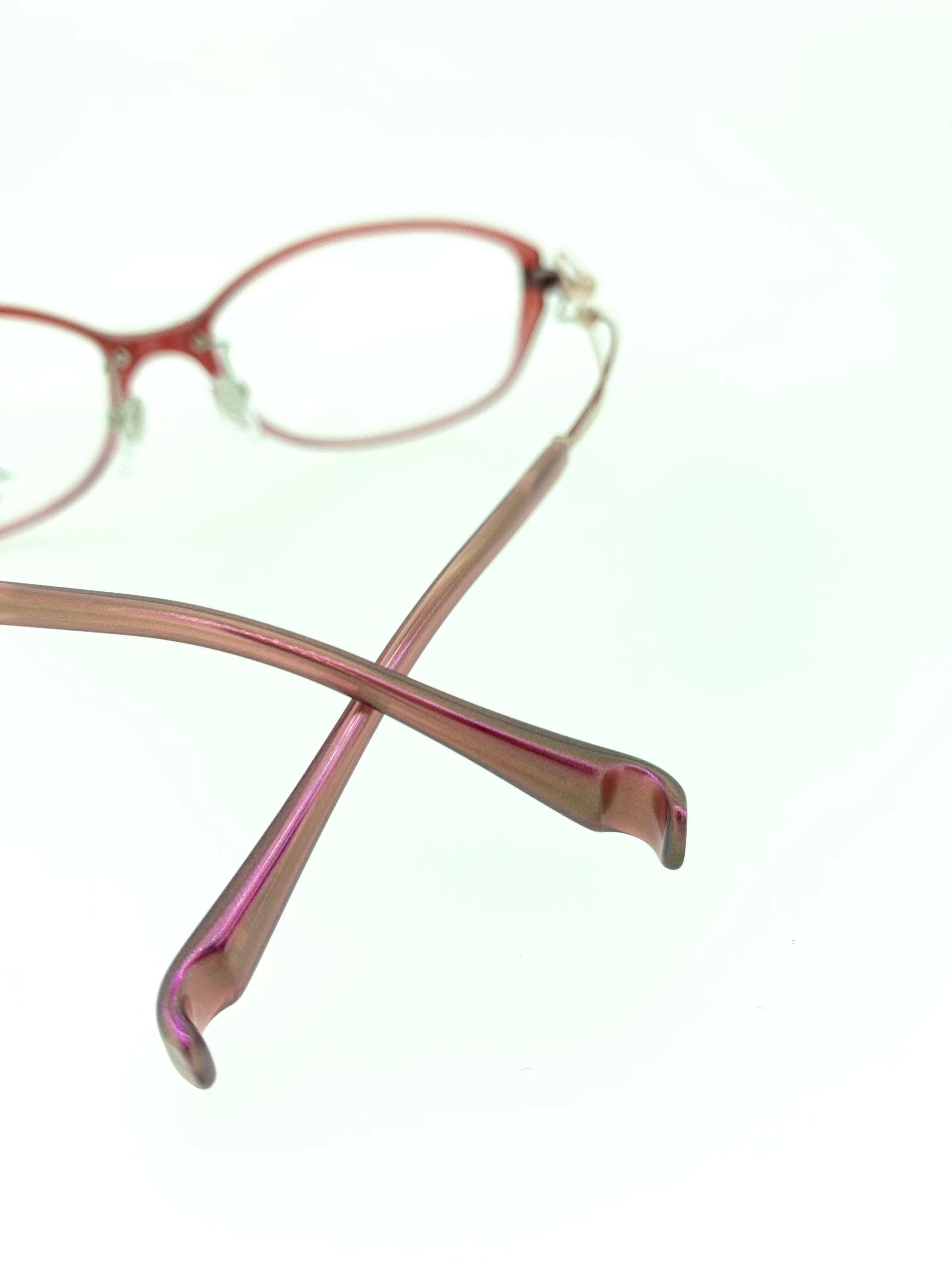 LineArtには珍しいセルフロントとチタンテンプルを組み合わせたコンビネーションフレーム。目尻にアクセントのあるバタフライシェイプのようなラインが女性の強さと可憐さを表現しています。フロントセルもポピーレッドからピンクへグラデーションになっていて、明るく柔らかに表情を彩ります。極細の2本のテンプルラインが織りなす上品な印象が魅力的な作品です。