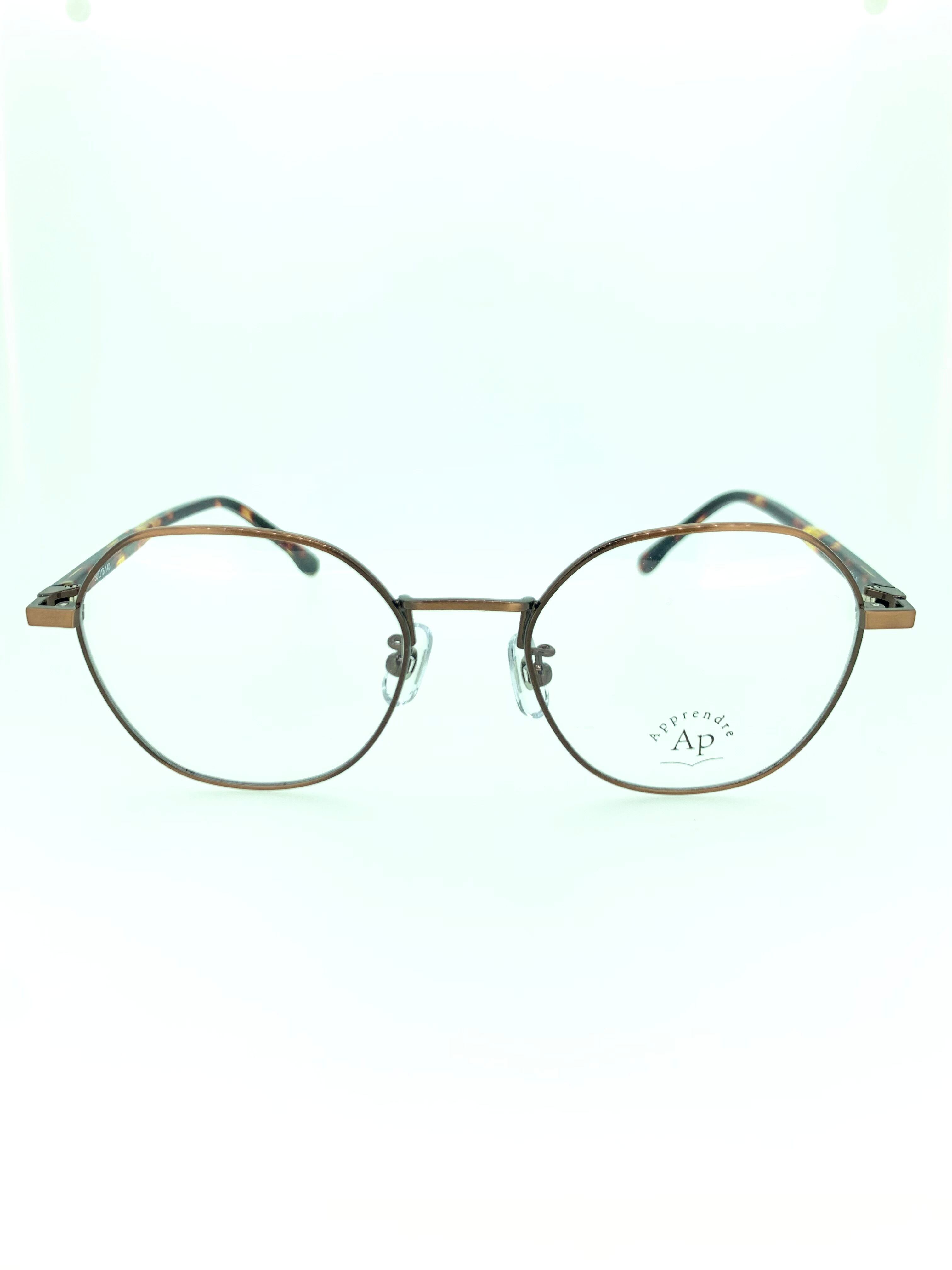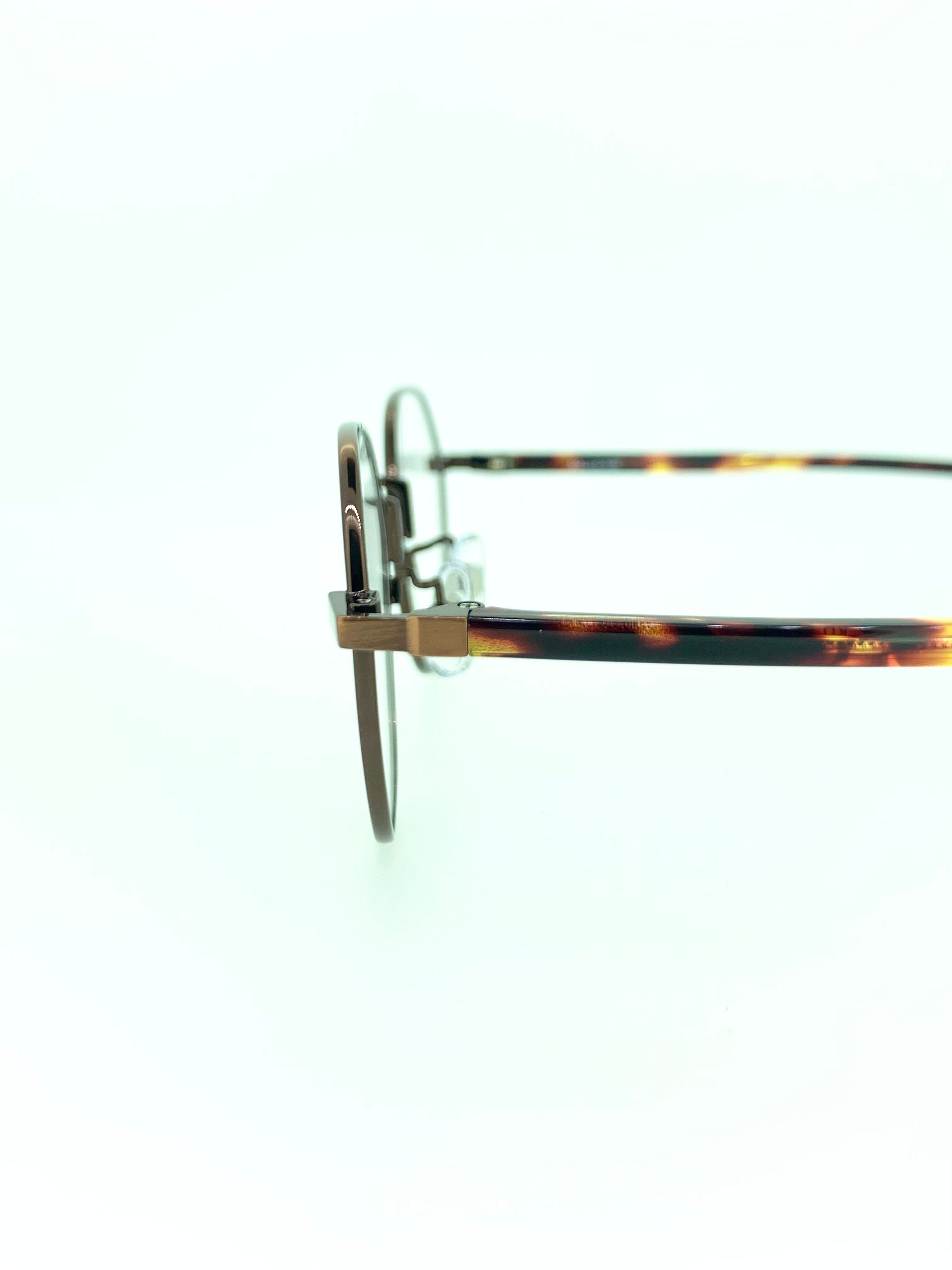 かけるだけで個性的な雰囲気を作れる人気のオクタゴンシェイプのコンビネーションフレーム。メリハリをつけすぎない滑らかなシェイプデザインにレトロ感のあるメタル生地のカラーリングが絶妙で「モダンなのにどこか古臭い」バランス感が秀逸な作品となっています。メタル地の褪せたカラーリングに世界観を合わせたブラウンデミを先セル(耳当て)を採用したお洒落な1本です。