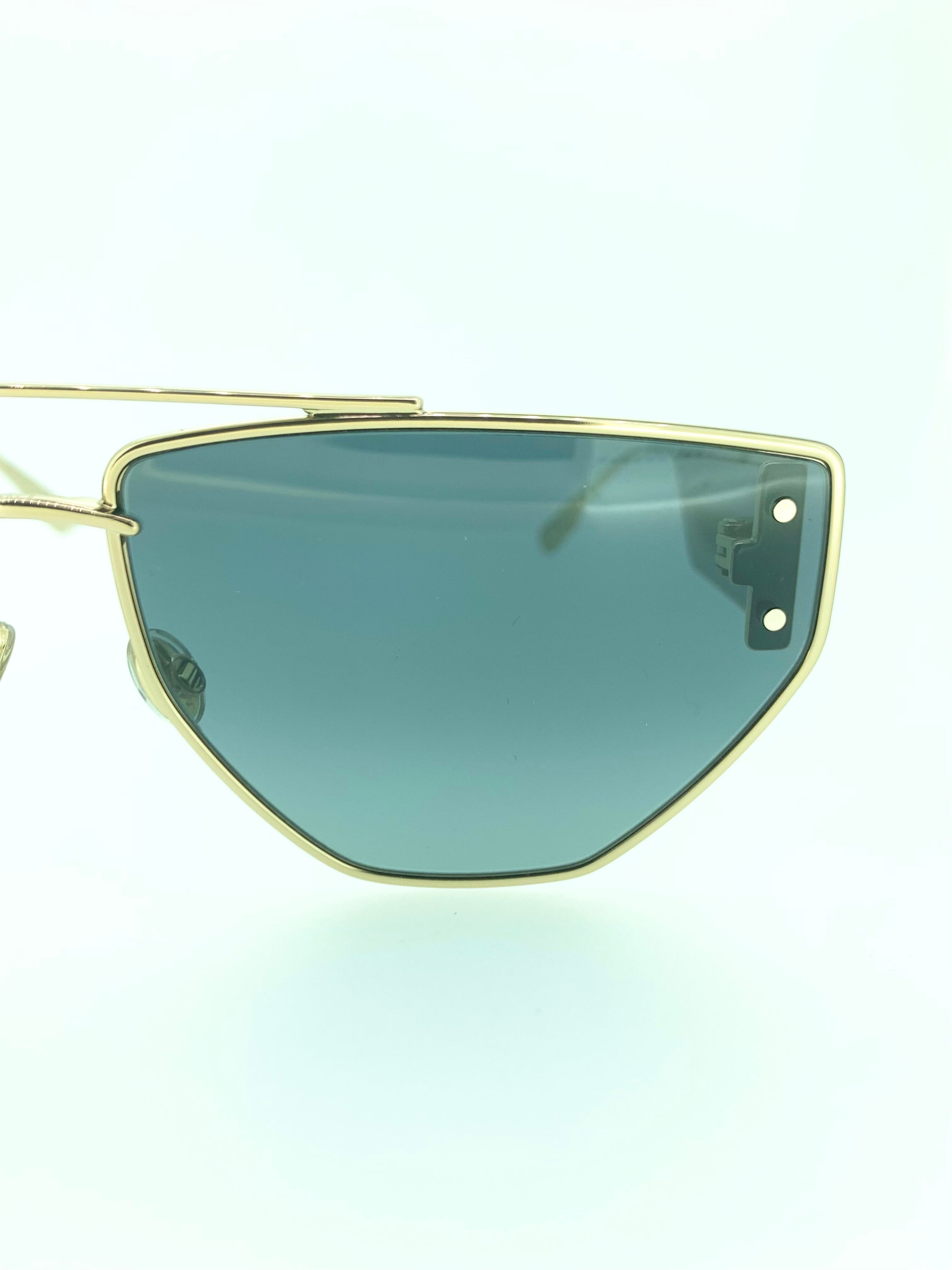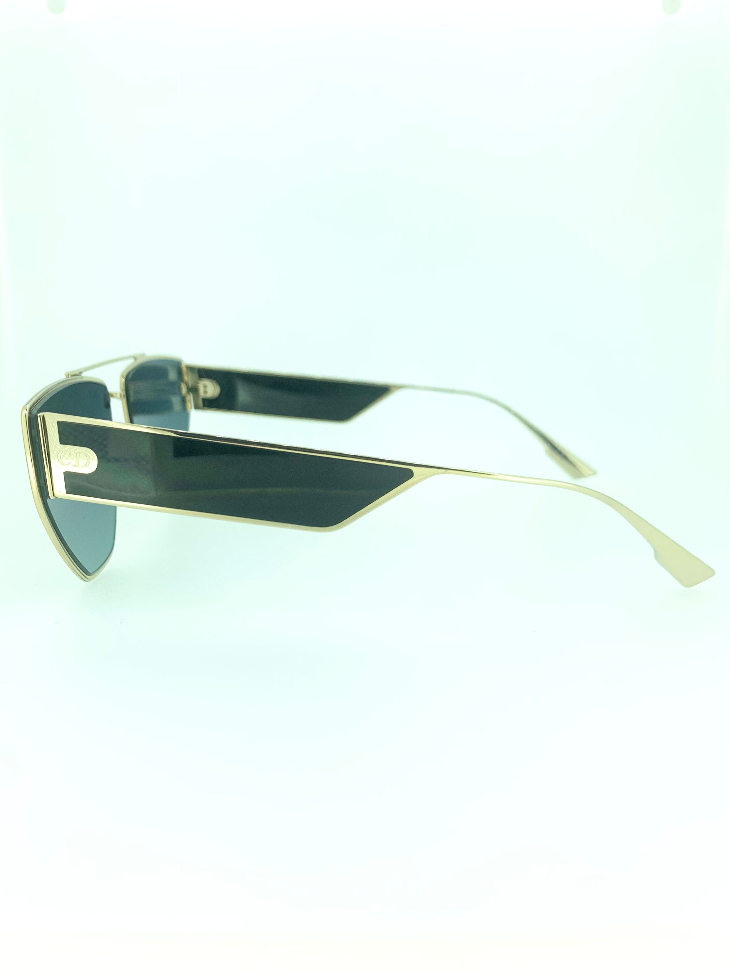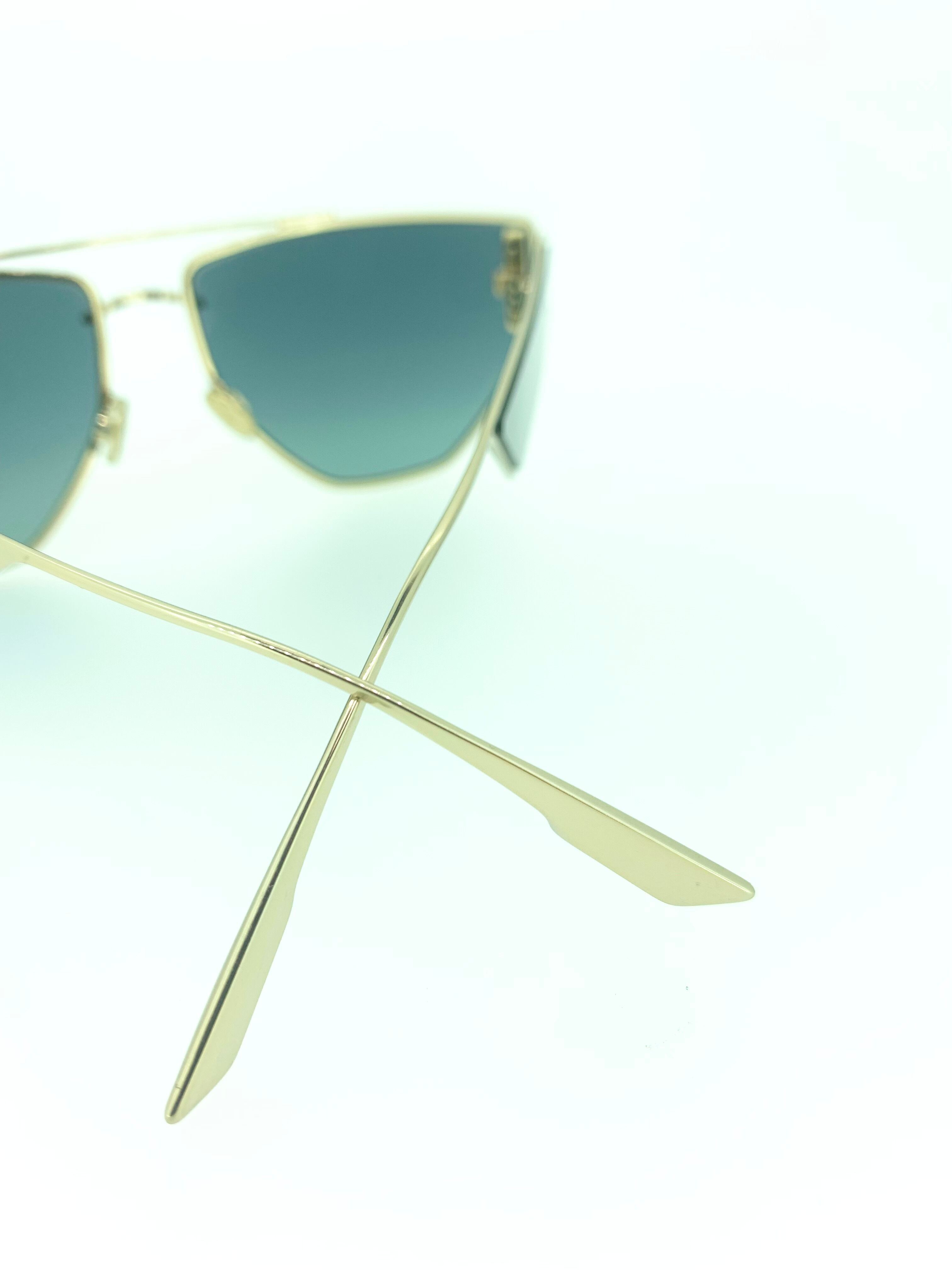 上部リムのスパッとしたストレートラインにエッジを効かせたオクタゴンシェイプがモード感溢れるツーブリッジフレーム。ベースカラーに華やかさのあるイエローゴールドを採用し、ブラックカラーのコントラストで引き締めるクールなカラーバランスとなっています。テンプルのガラスのような素材で挟み込んだ特殊なデザインやレンズに直接カシメを打ち込むなどの奇抜な発想が痺れる作品です。型破りをデザインとしてまとめたDiorらしいエレガントな仕上がりとなりました。