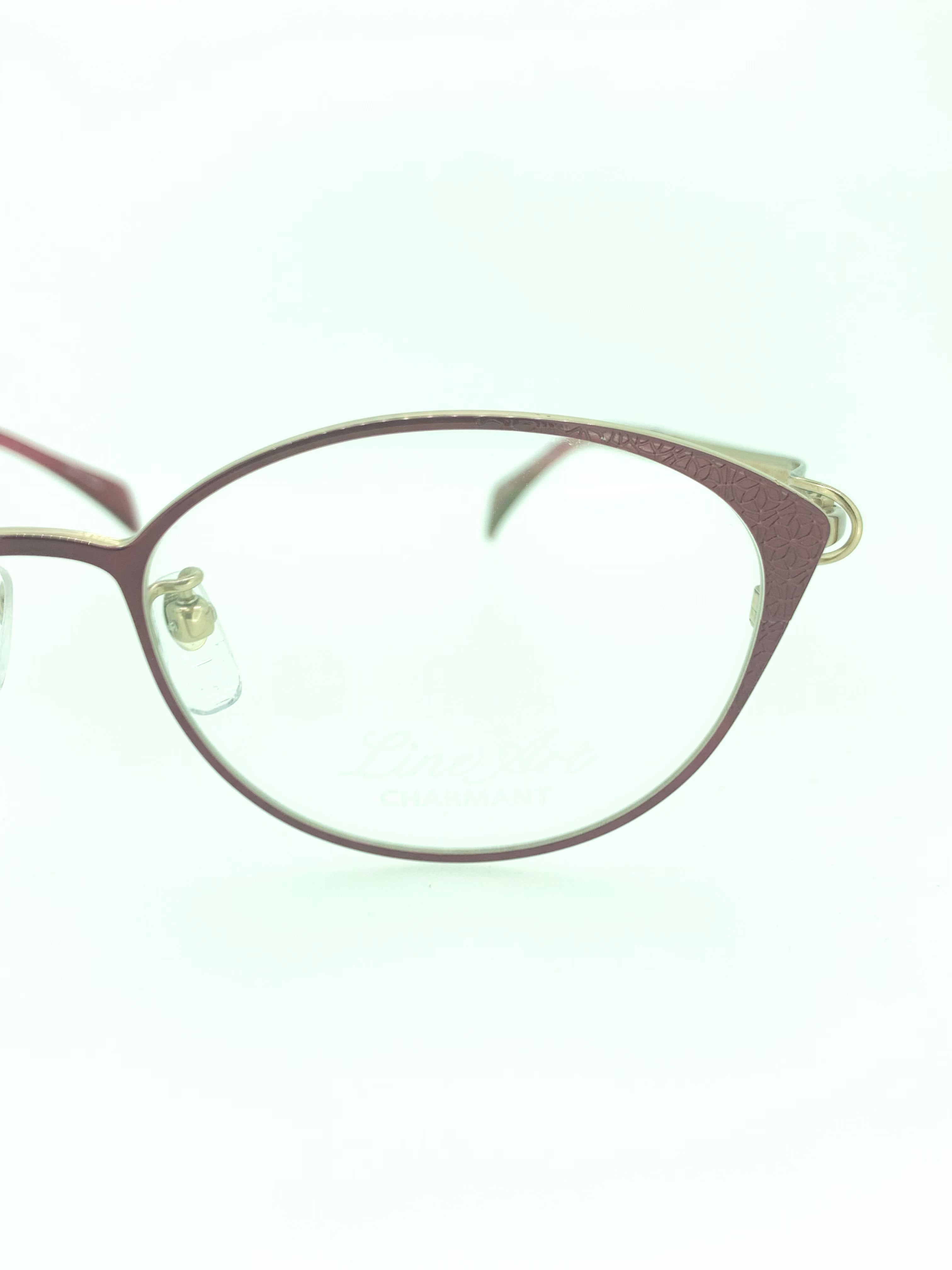 アイラインのように目尻に印象を持たせたキャッツアイ風のリムデザインと深みのあるカラーリングがお洒落なメタルフレーム。ボストンシェイプと女性らしさのあるリムデザインが良くマッチしていて、力強さと可愛らしさのあるバランスのとれたデザインとなっています。さらにリム表面やテンプルに施された繊細で美しい模様はまさにアートのようで、見ているだけでもうっとりしてしまう作品に仕上がりました。