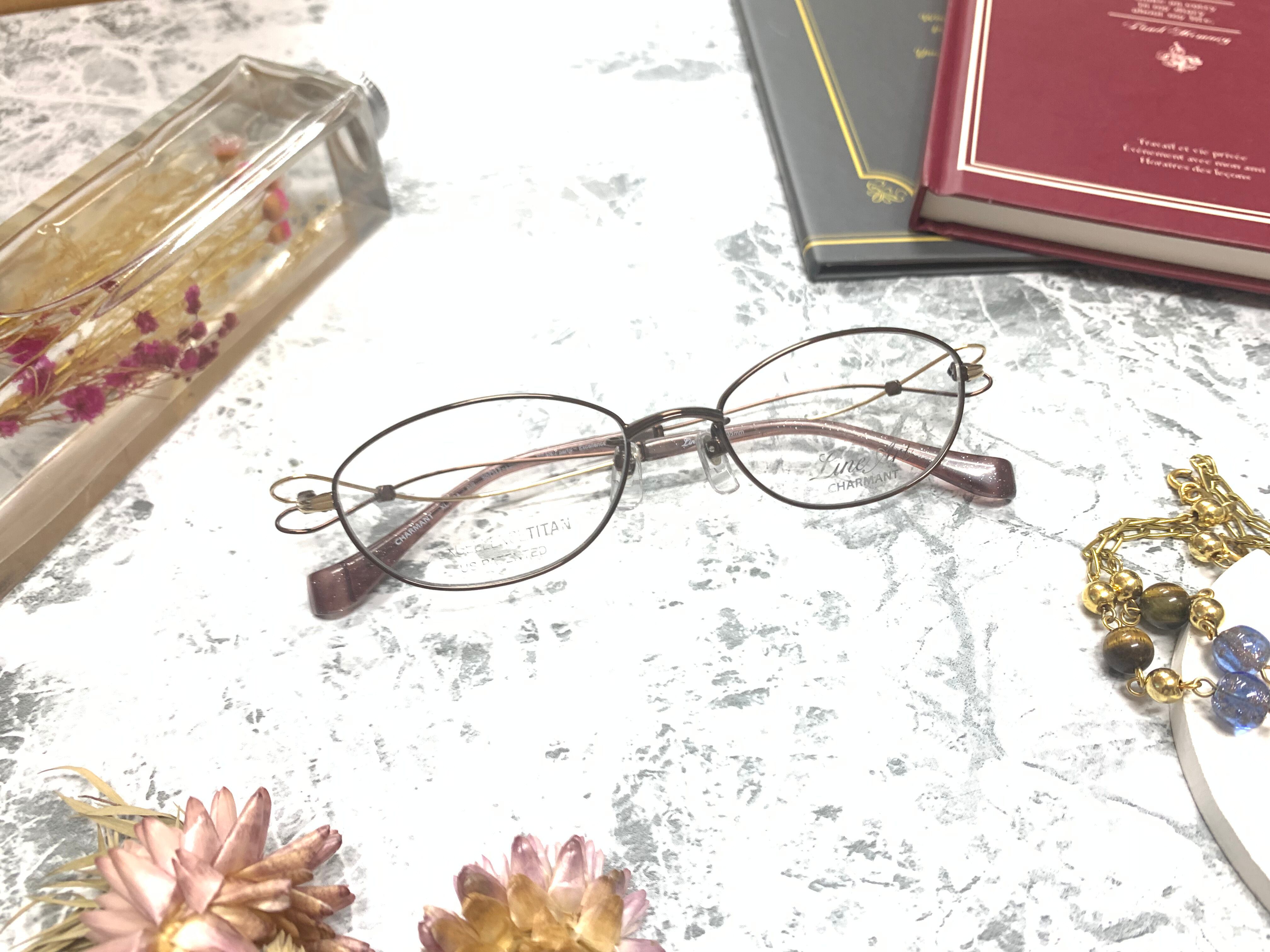 天地狭めなボストンのような緩やかな曲線を描くオーバルシェイプが落ち着いた雰囲気のあるメタルフレーム。ブラウンカラーをメインにゴールドをアクセントにした上品なカラーリングにまとまりました。チタンの高い耐久性と柔軟性を活かした、2本の細身テンプルが織りなすアートのような造形の美しいテンプルデザインとなっています。先セル(耳当て)にはラメを散りばめ、上品さの中にも少しの可愛らしさを取り入れたのもポイントですね。