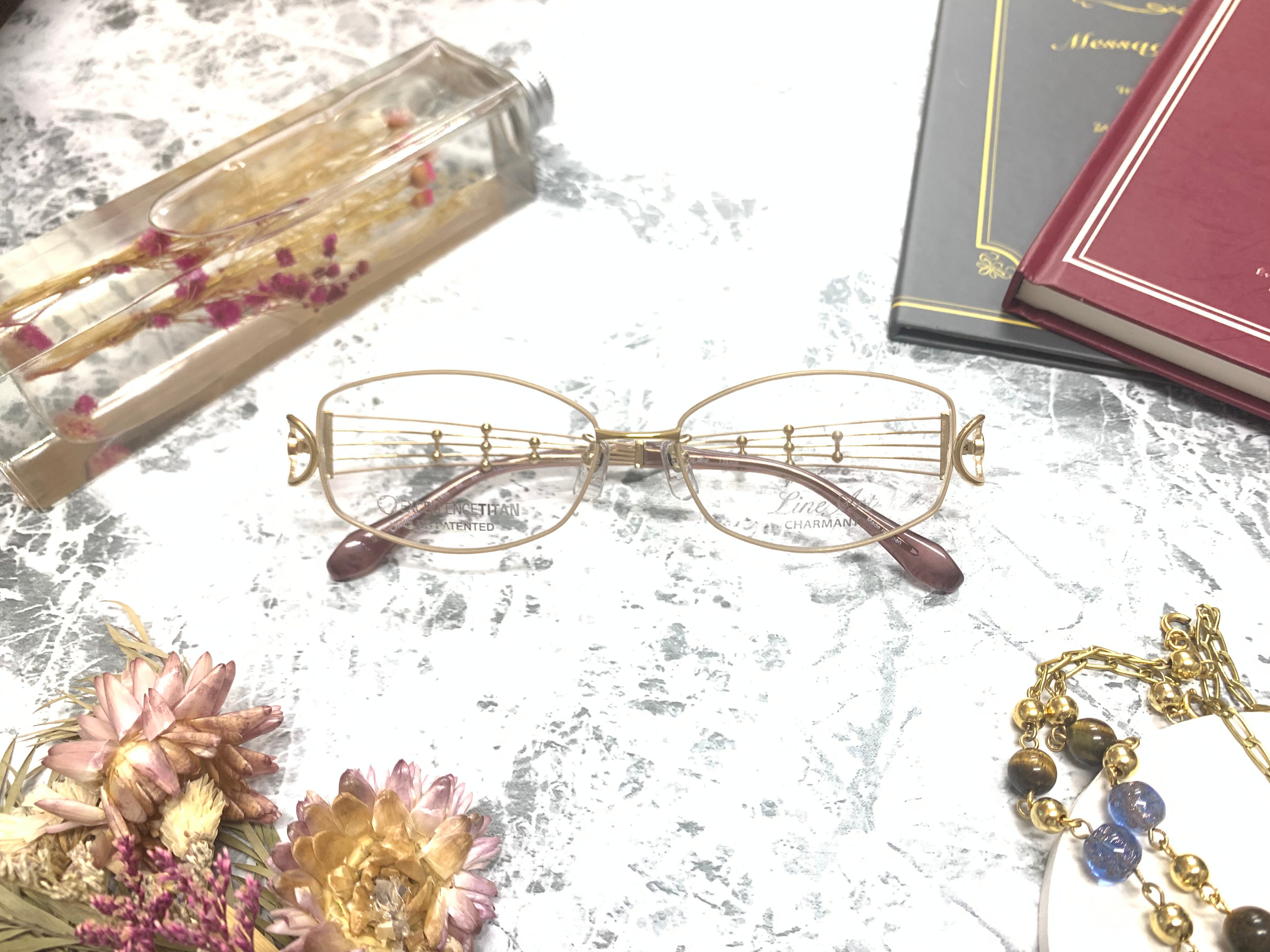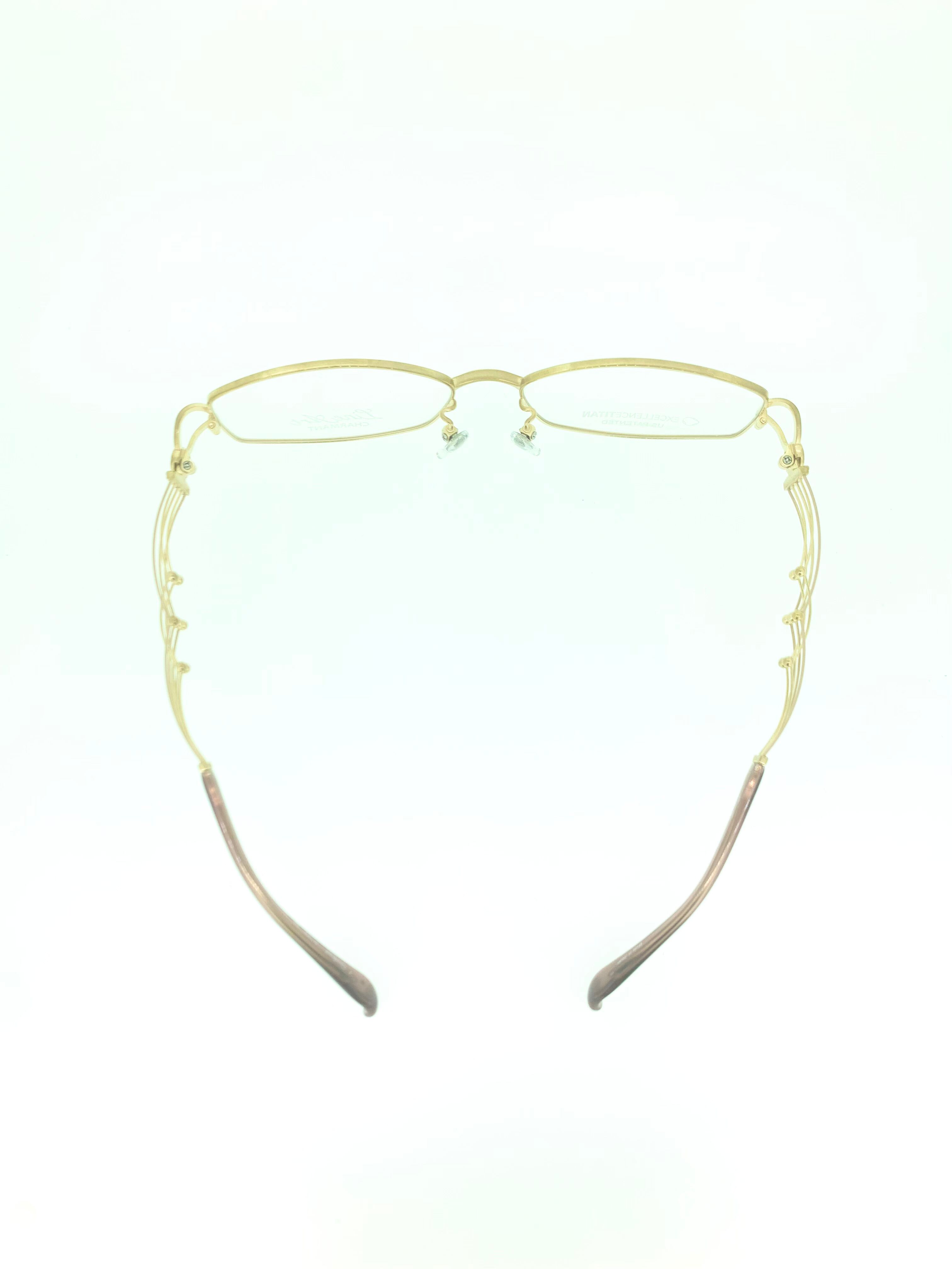 天地浅めな変則ボスリントンシェイプに高級感のあるイエローゴールドを合わせたメタルフレーム。ヨロイ部分のデザインや五線譜のようなテンプルラインの造形美に見惚れてしまうアートのような作品です。イエローゴールドに落ち着きのあるベージュの先セル(耳当て)を合わせることで、いやらしさが無く清廉にまとめあげた上品な仕上がりになりました。