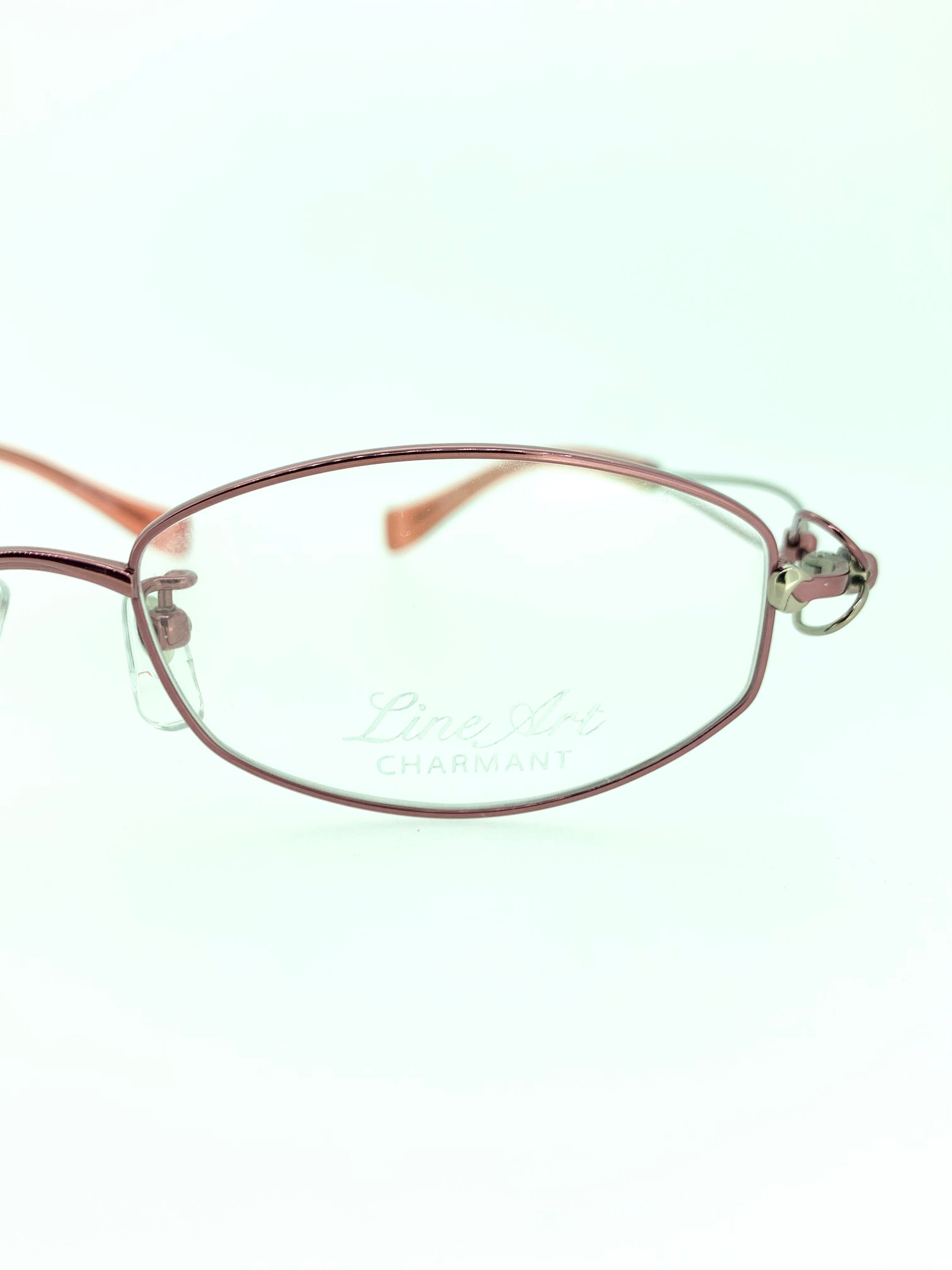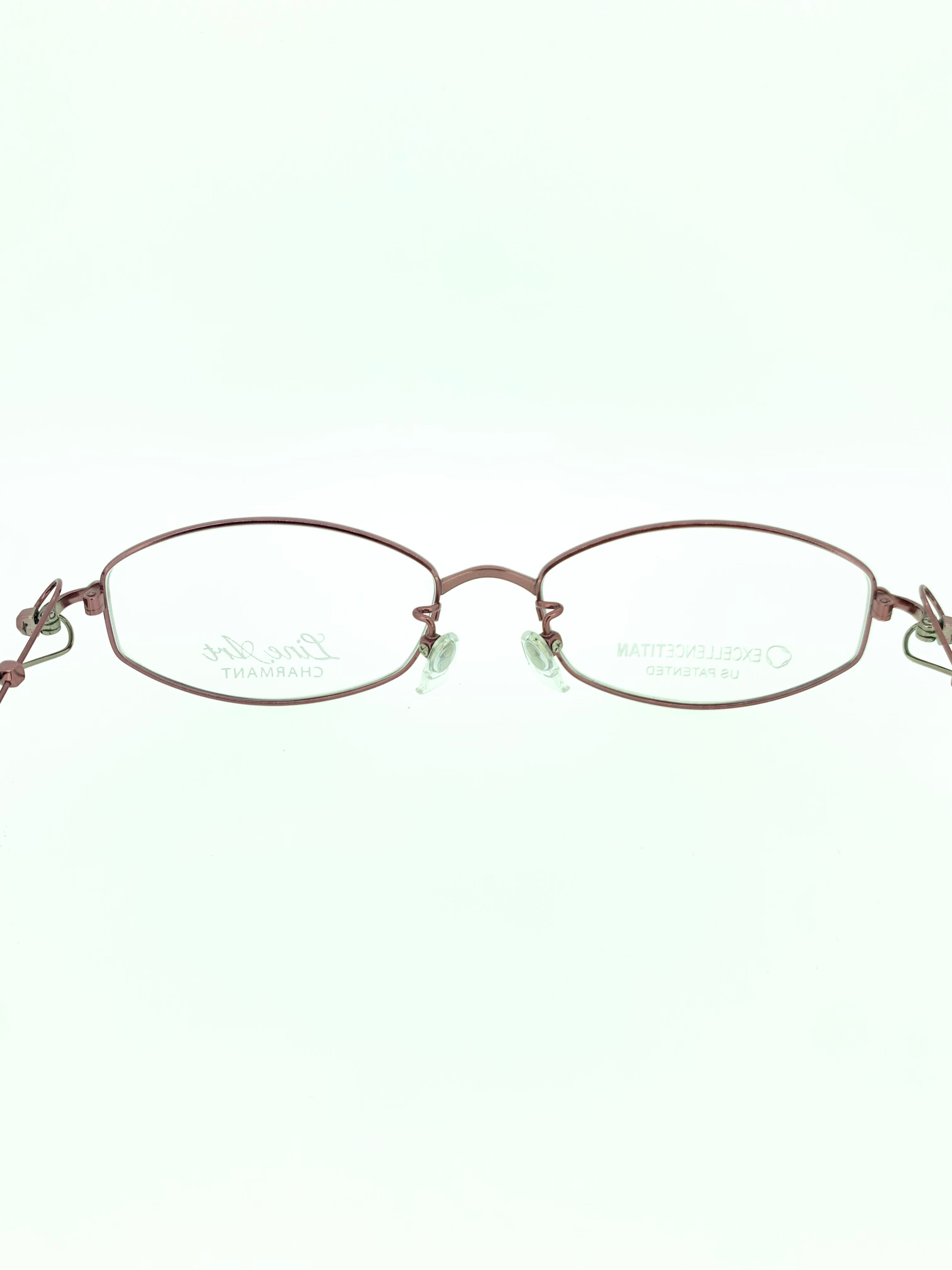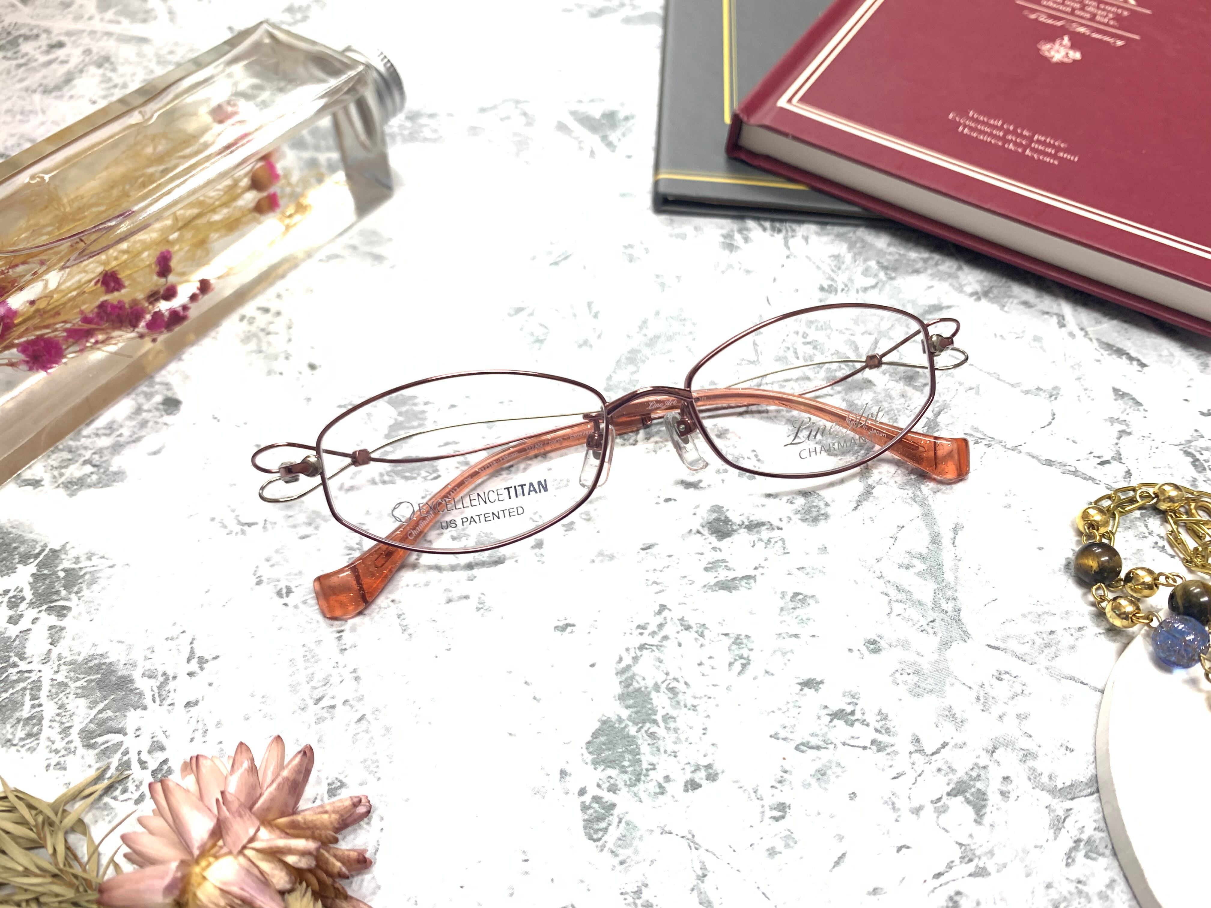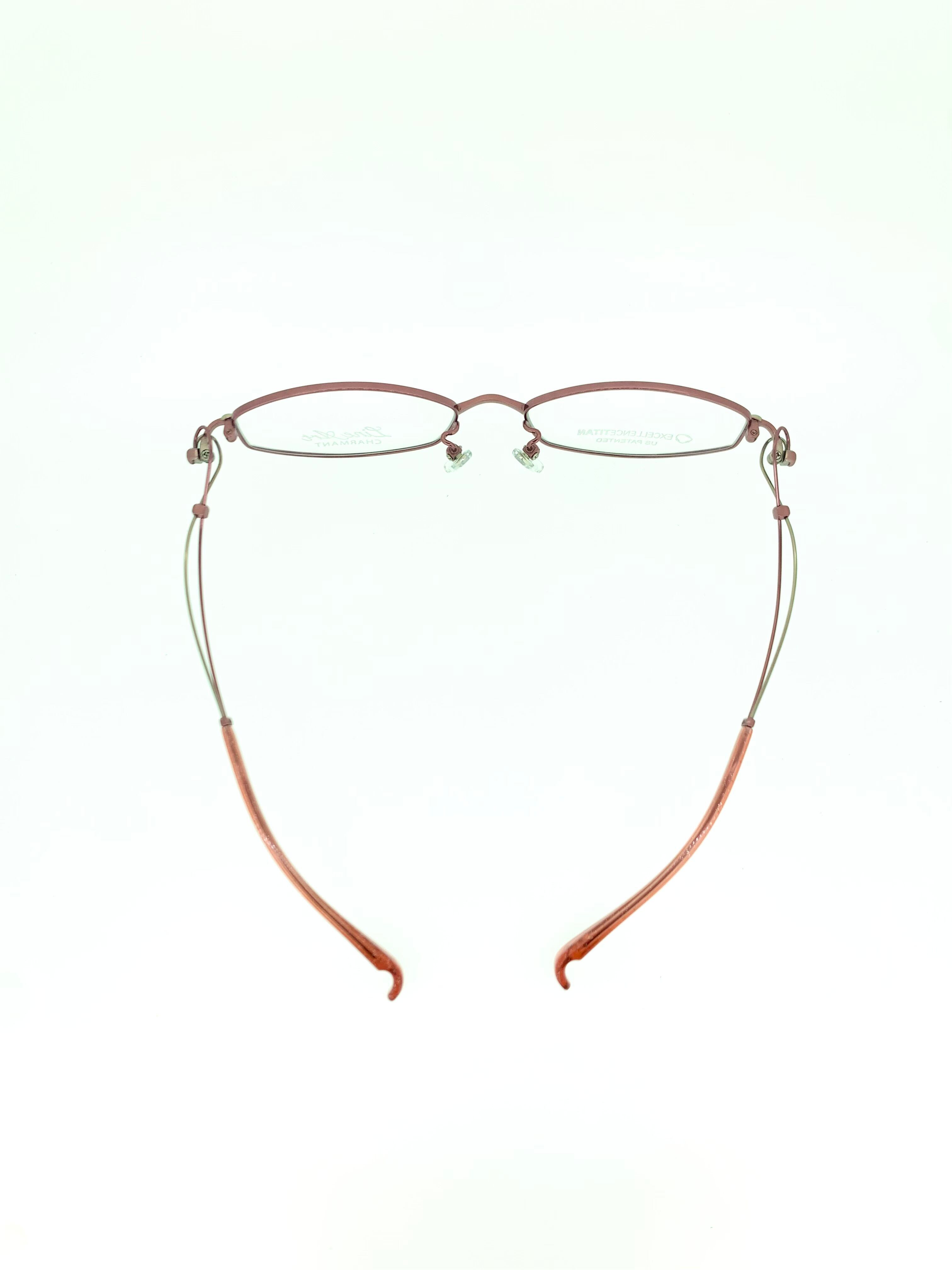 落ち着きのあるオールドローズカラーの色味が特徴的な変則オーバルシェイプのメタルフレーム。目頭と目尻にエッジを効かせたシェイプデザインは、柔らかさの中にも凛々しさを秘めたバランス感の良いフレームワークとなっています。テンプルはカラーの異なる2本のラインが、ハートを描くように交差する女性らしいデザインになっています。チタン特有のしなやかさを活かした、まさにアートのような造形が美しい作品に仕上がりました。