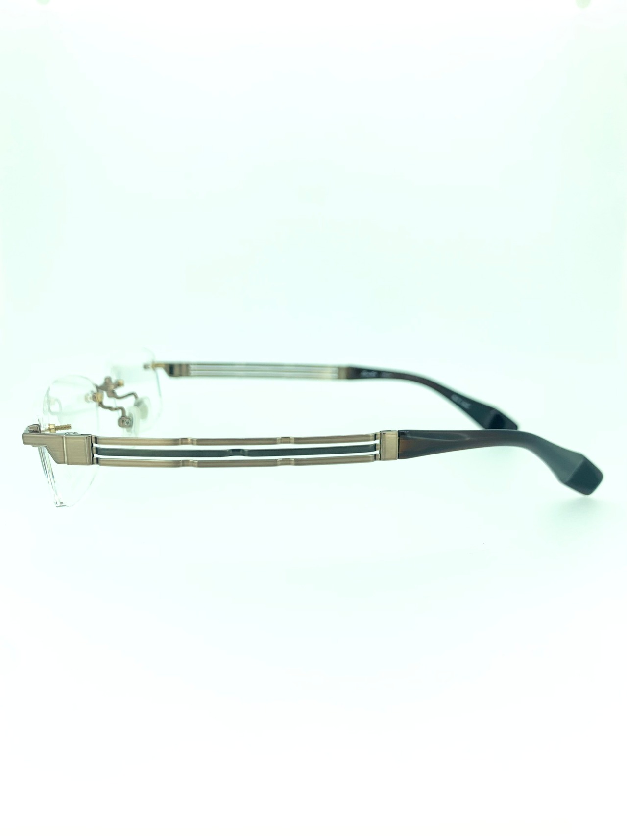 シンプルだからこそ一つ一つに質の高さを求められるスクエアシェイプのツーポイントフレーム。目頭と目尻でネジ受けを表裏逆にデザインすることでリムレスのフロントにも立体感を持たせたお洒落な作品です。堅くなりがちなスクエアシェイプを柔らかさとシャープさのバランスを緻密に共存させています。淡さのあるブラウンチタンも絶妙なカラーリングで、包み込むような安心感のある大人の余裕を感じる作品です。