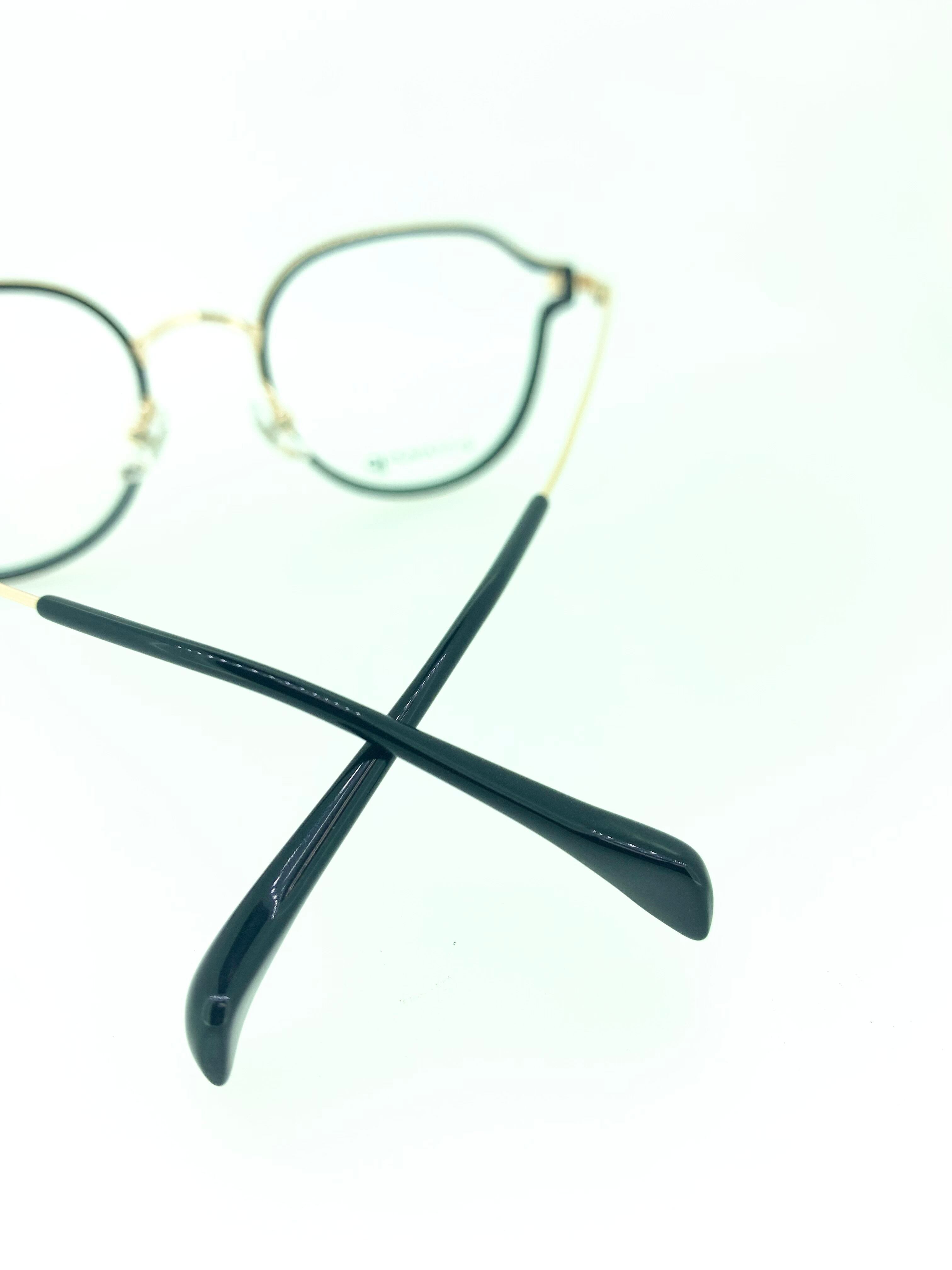 ブラック×ゴールドの失敗しないカラーリングに個性を出せるクラウンパントシェイプを合わせたメタルフレーム。セルリムを重ねた人気のワッパデザインの目尻をリムレス仕様にデザインすることで、プチプラとは思えないほどエレガントなデザインに仕上がっています。テンプルなどは細身でシンプルにまとめ、フロントデザインを際立たせた綺麗な作品です。