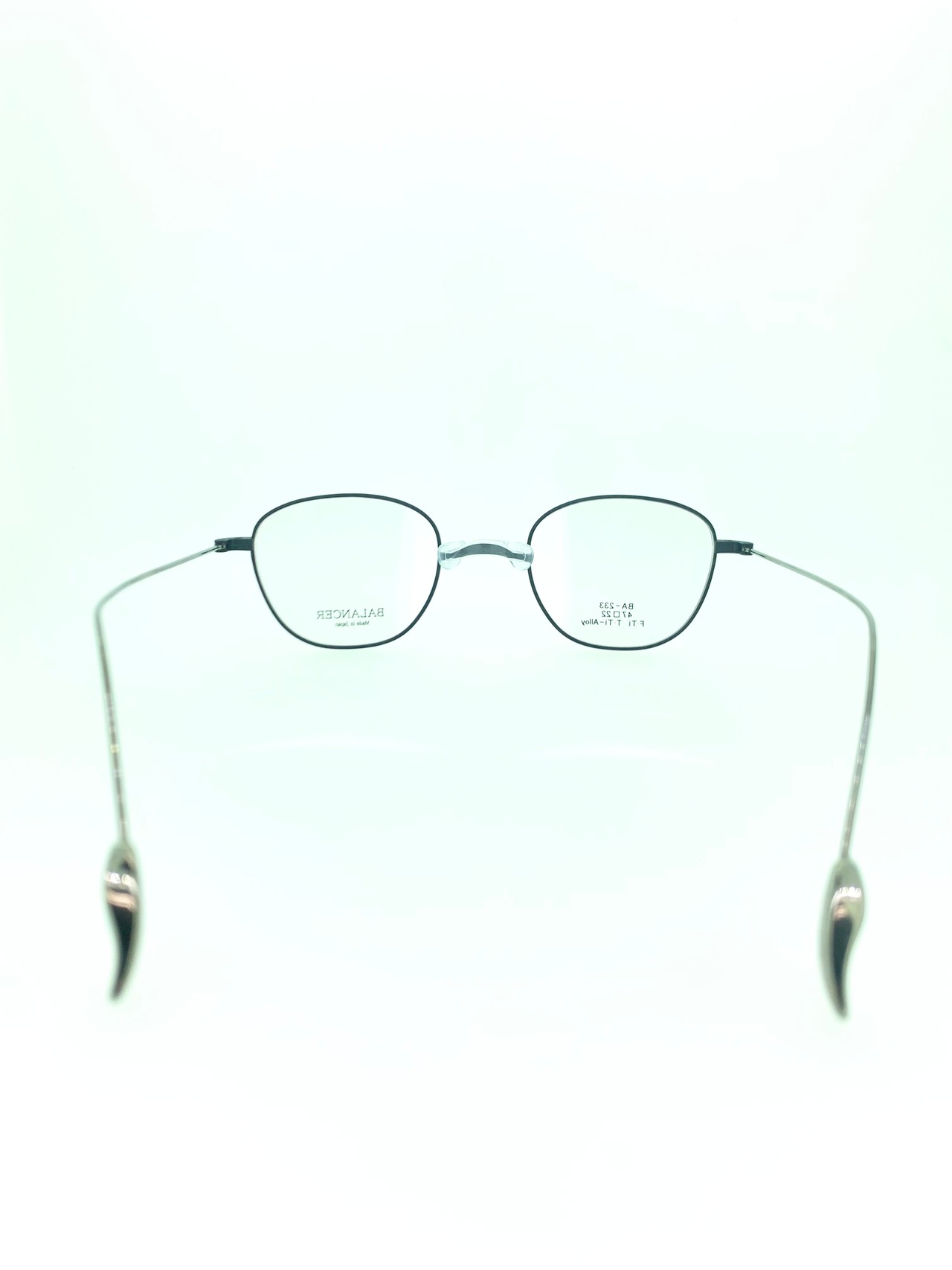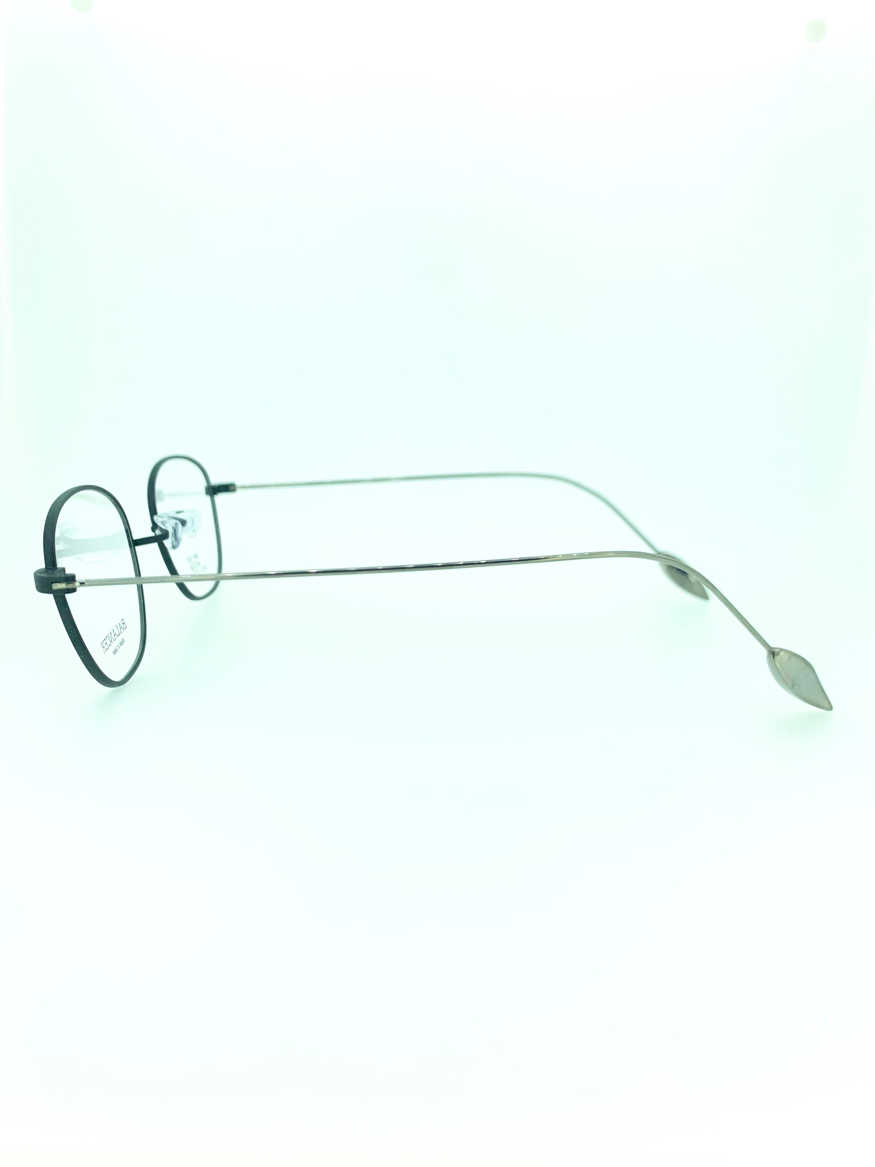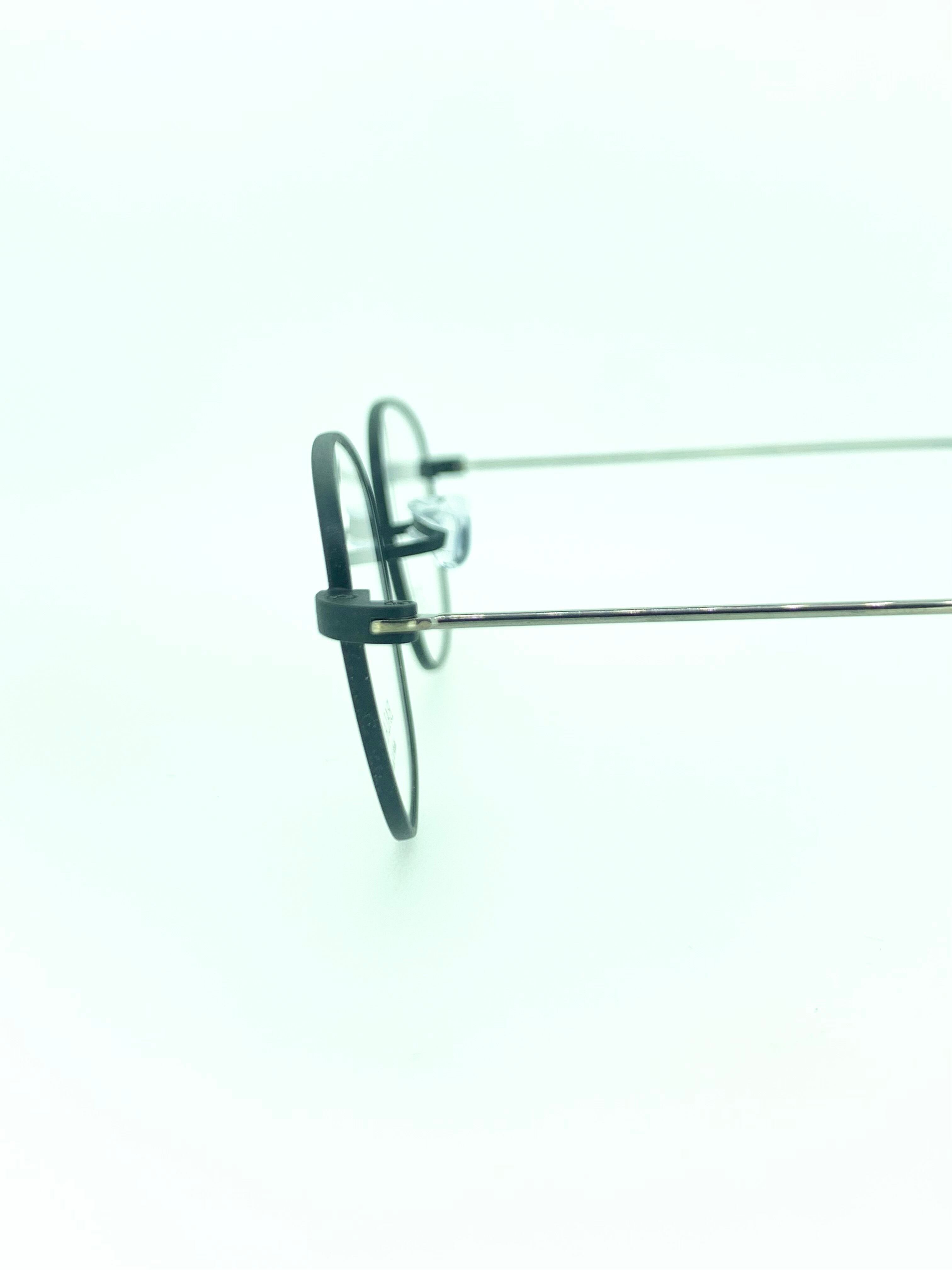 コンパクトなウェリントンシェイプにシルバーテンプルを合わせた綺麗なメタルフレーム。マットブラックのハッキリとしたカラーリングが小玉なフロントでもしっかりと印象つけてくれます。クラシカルな一山ブリッジを採用することで、レトロ×モダンなお洒落なデザインにまとまっています。ロングテンプルの先端にはティアドロップ型の錐が付いていて、儚い綺麗さを演出しているかのような素敵な作品です。