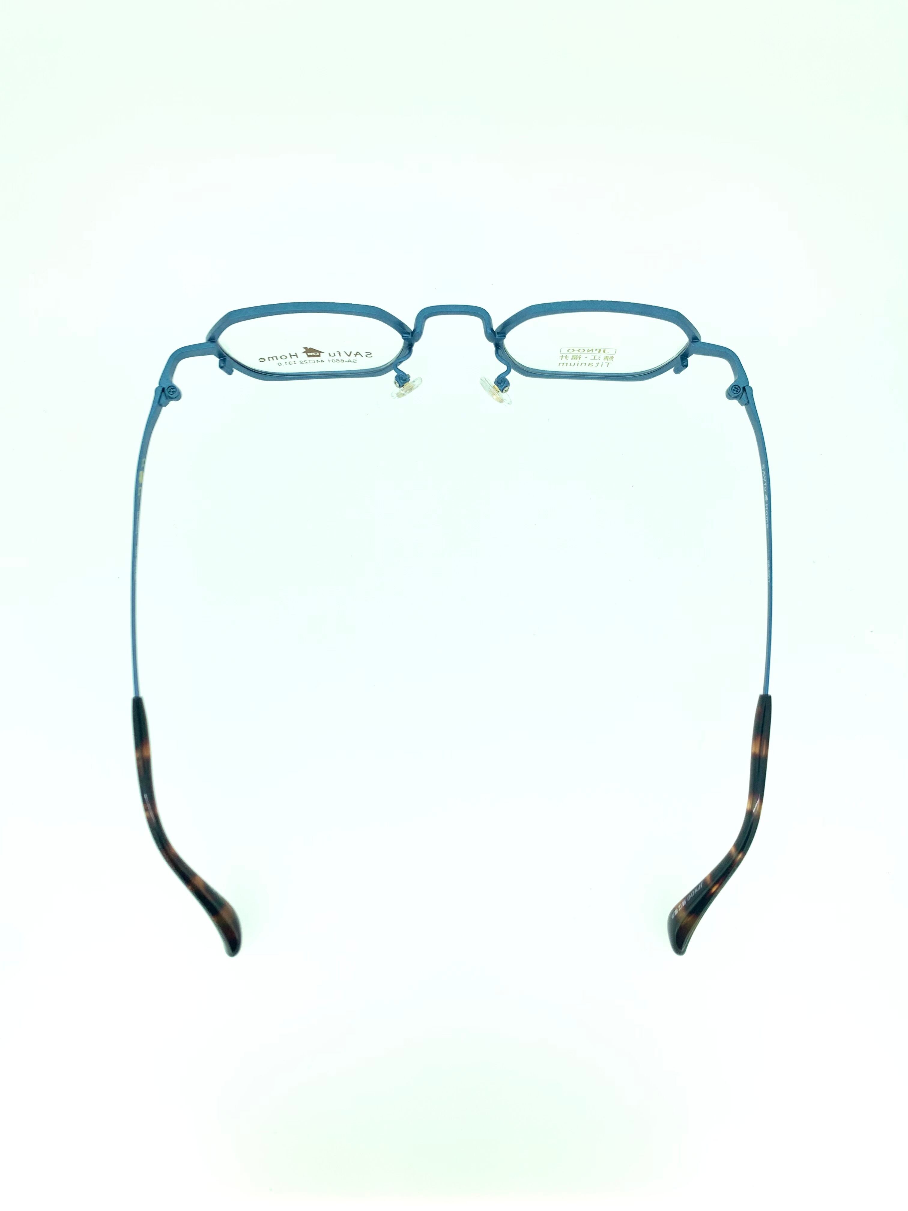 天地が浅くスクエアのようなオクタゴンシェイプが特徴的なメタルフレーム。鮮やかでありながら落ち着きのあるジェイブルーのメタルフレームには、ザラつきのある特殊加工が施されていて独特な質感を生み出しています。フロントリムはレンガ調の外壁のような凹凸のある迷彩柄デザインが採用され、特殊加工が施されたメタルと抜群にマッチしています。
