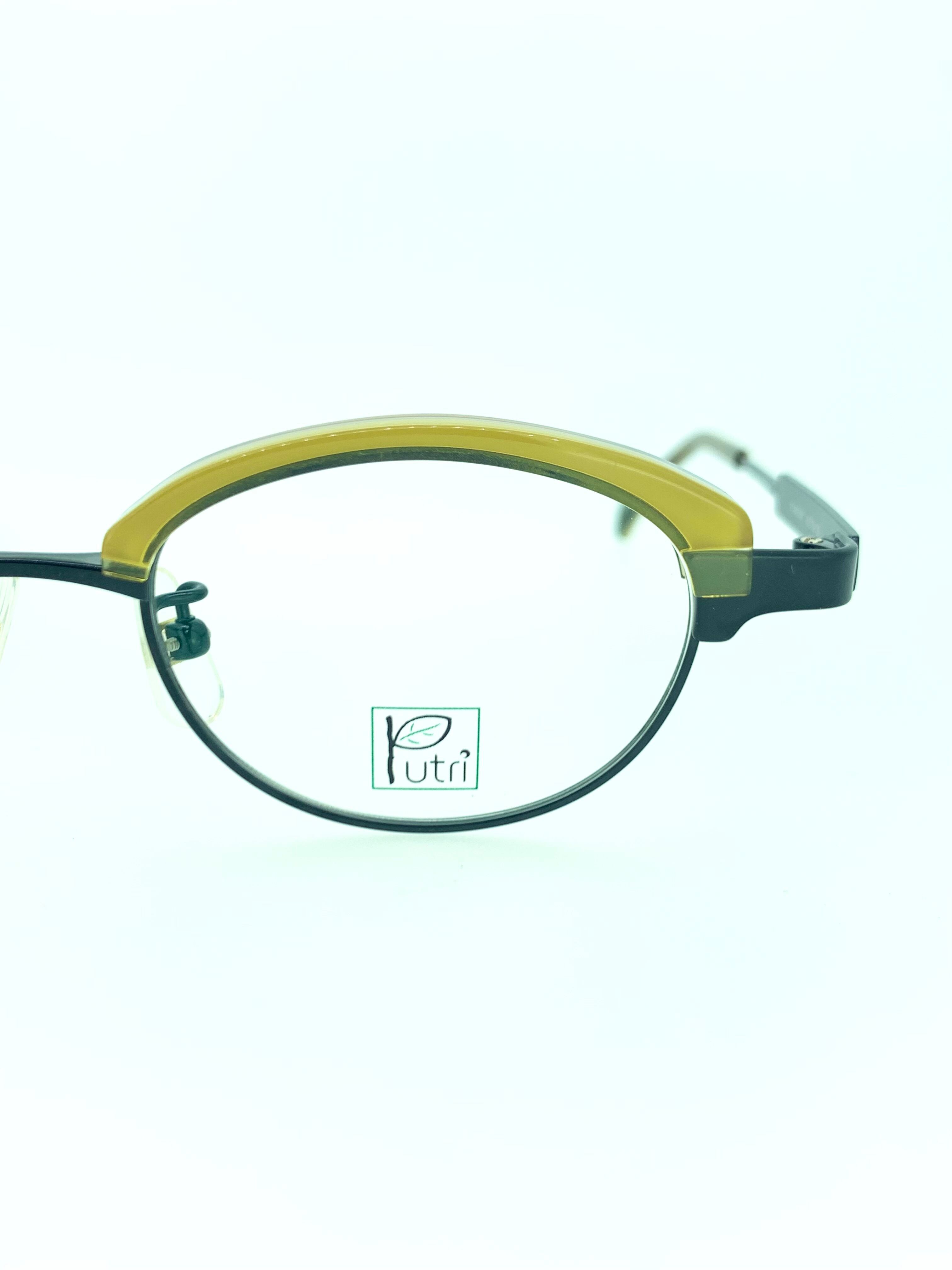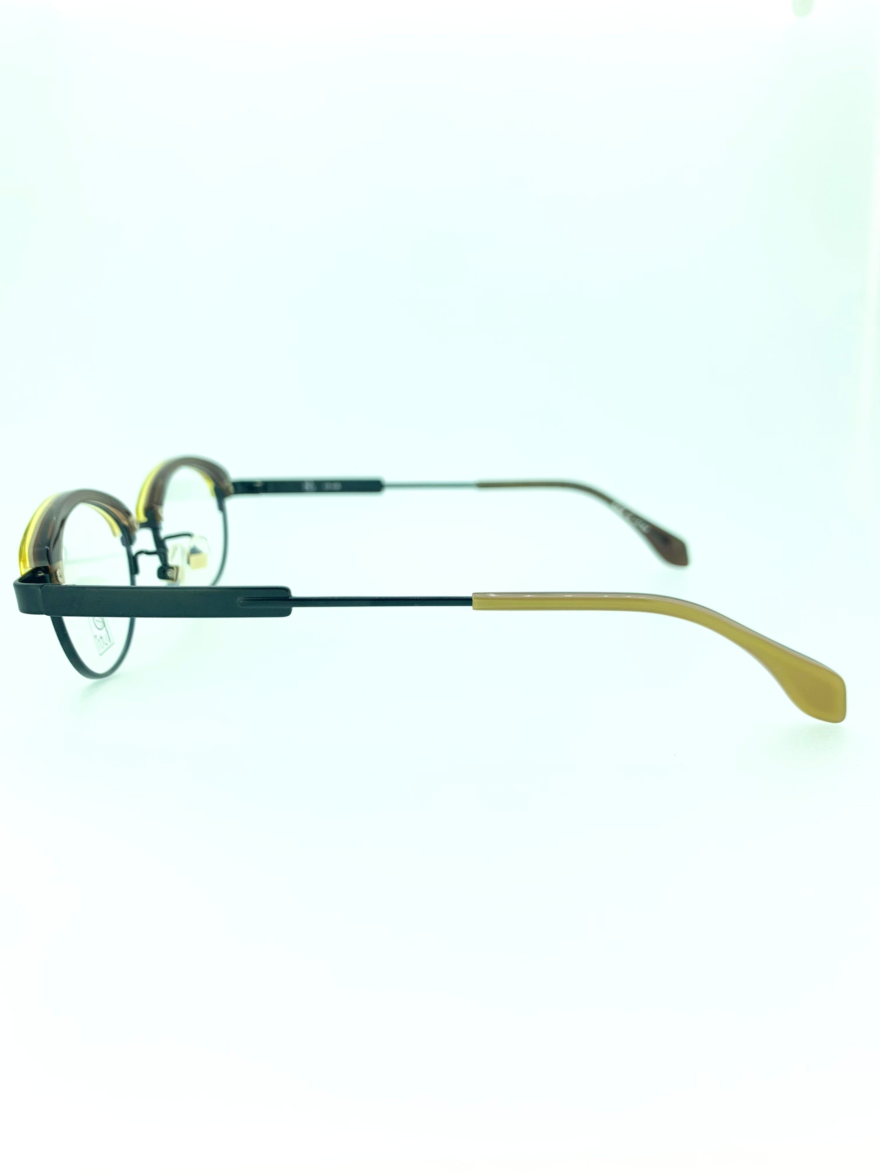 二層のセル生地を重ねたコンパクトなボストンシェイプが可愛らしいブローフレーム。メタル地は光沢の無いマットブラックを採用することで、イエローカラーのブロー部分とハッキリ分かれ、コントラストが綺麗なデザインとなっています。イエローカラーのセル生地が少しクリアになっているため、下地のブラックメタルで明るくなり過ぎないバランス感もポイントです。