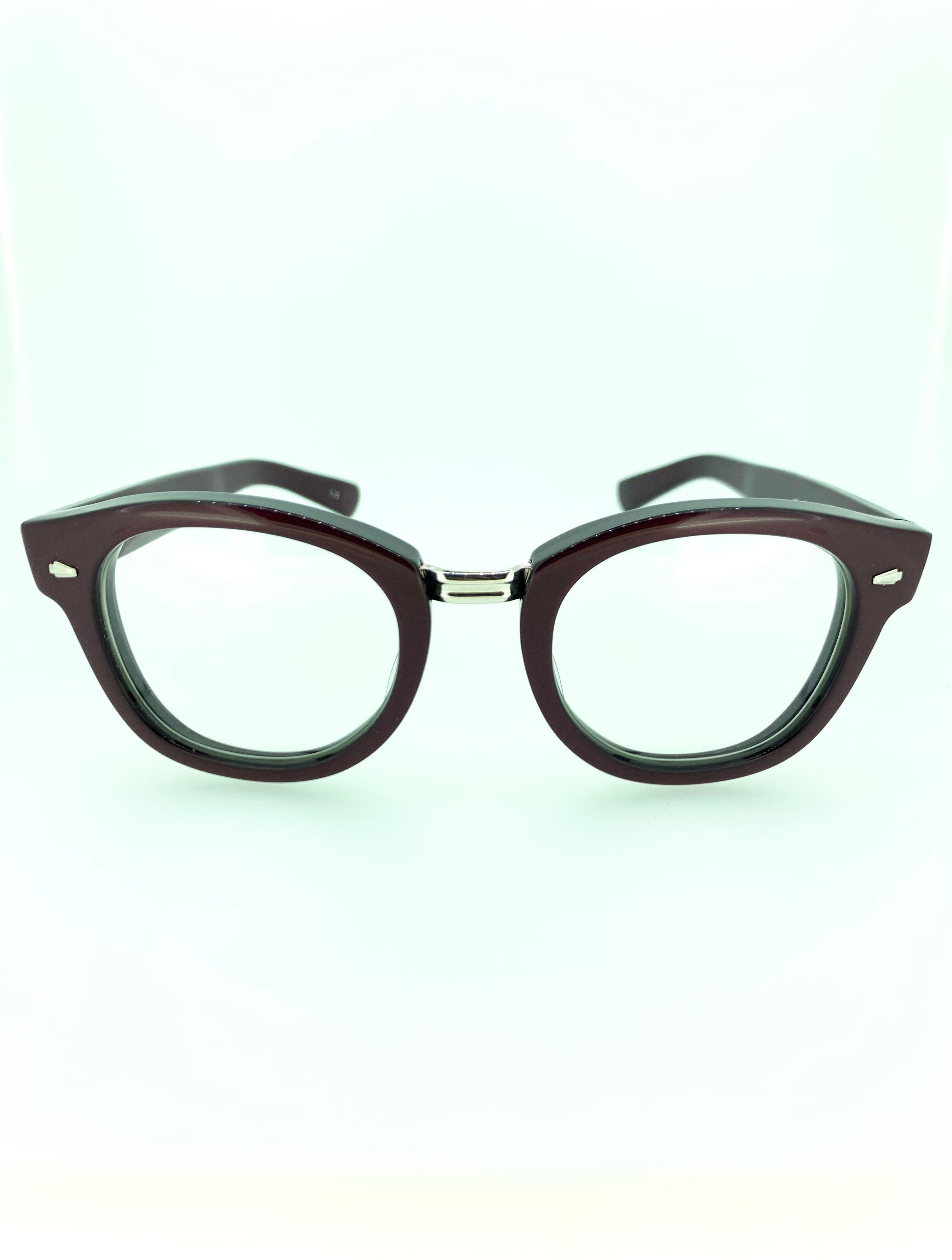 ワイドなフロントデザインの肉厚アセテートがインパクトありなボストンシェイプのコンビネーションフレーム。しっかりと幅のある無骨なメタルブリッジに対して、なめらかに目尻を下げつつもエッジを効かせたヨロイ部分がどこか中性的なシルエットになっています。バランスのとれた中性的なフレームワークに珍しいバーガンディーカラーは男性でもかけられるダークな雰囲気に仕上がりました。