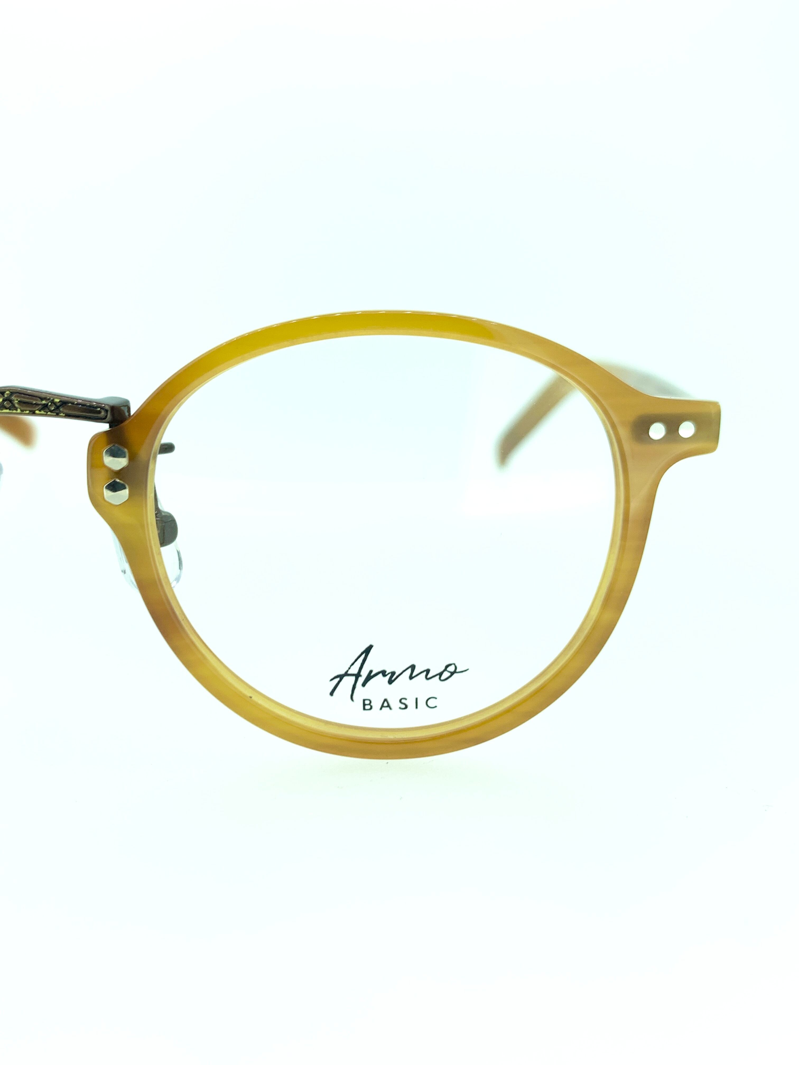 キャメルカラーにレトロ感のあるブラウンメタルを合わせたボストンシェイプのコンビネーションフレーム。クラウン型のブリッジには細かな装飾も施されていたり、テンプルメタルにもミル打ちという装飾技法が取り入れられ、細部まで手を抜かないデザイン性がうかがえる作品となっています。落ち着いたカラーリングにラウンドに近い丸みのあるレンズシェイプにうっとりしてしまうお洒落なプチプラアイテムです。