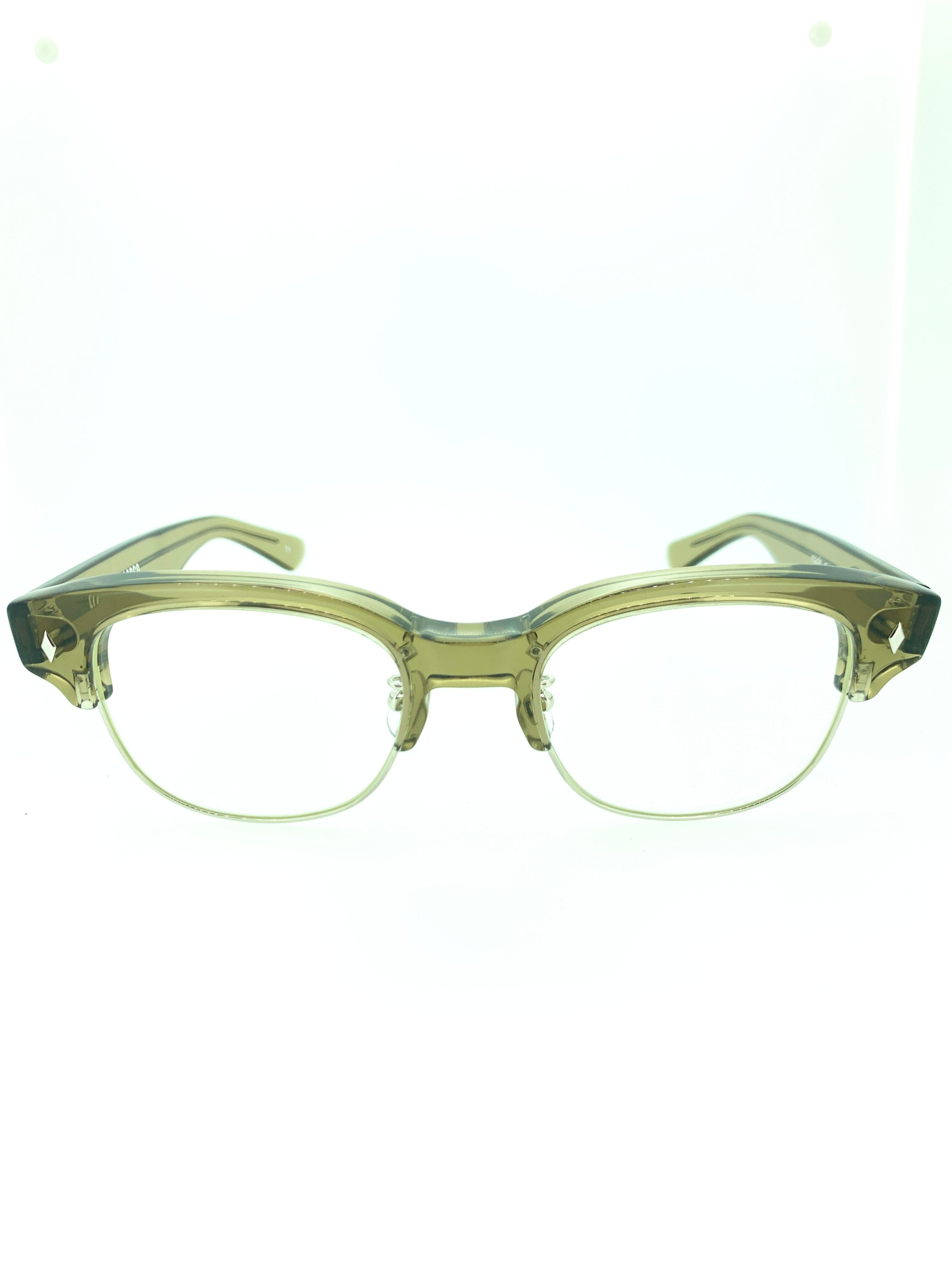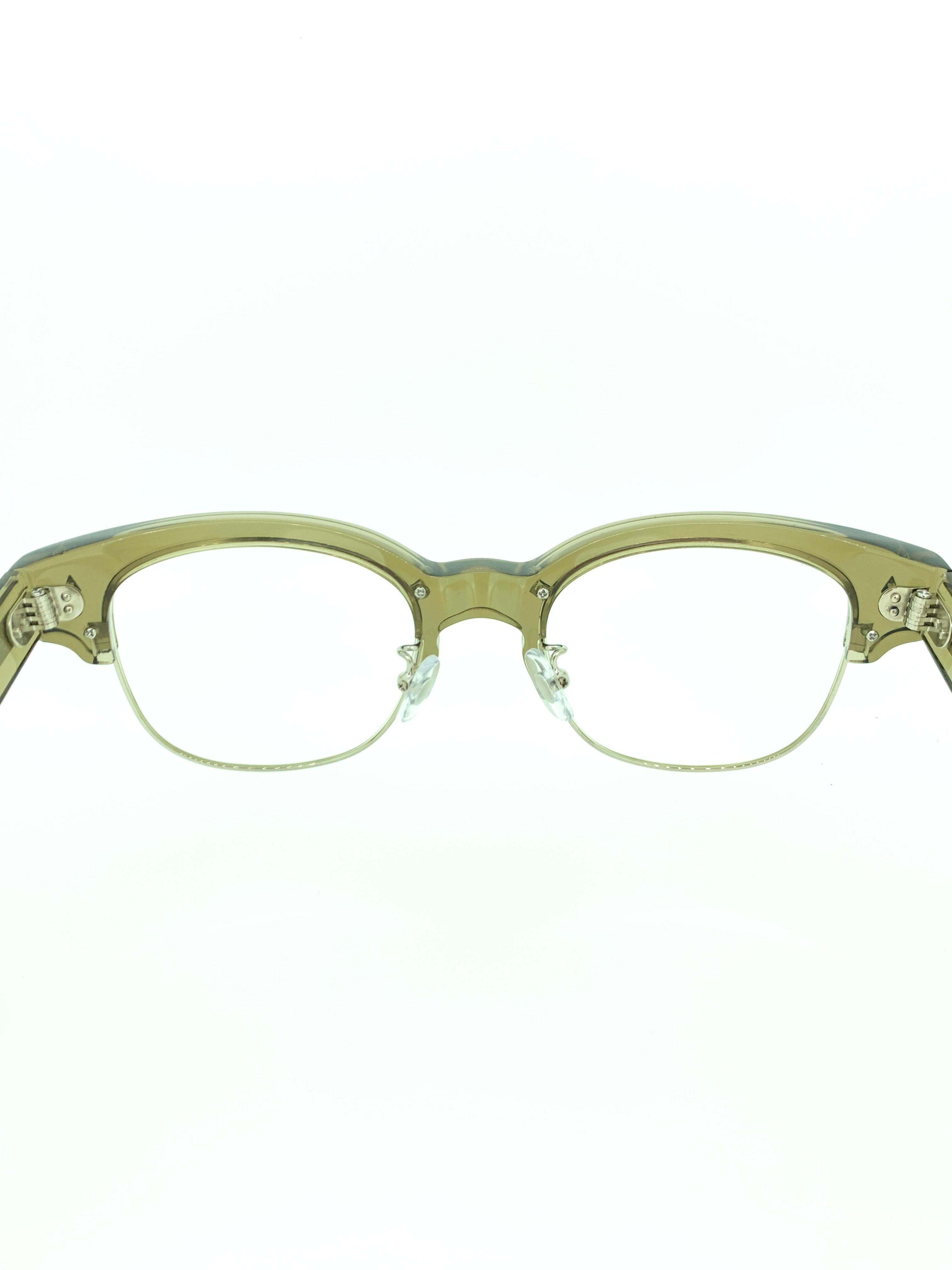 オールドスタイルのサーモントブローをEFFECTORらしい肉厚セルで再現したお洒落なブローフレーム。柔らかくカジュアルな印象のボストンと真面目でクールな雰囲気のウェリントンの良いとこ取りをした人気のボスリントンシェイプでまとめた作品です。肉厚ブローだけでも他と被らないが、クリアカーキのカラーリングは圧倒的な個性を誇ります。それでいてかけやすい落ち着いた色味に仕上げた秀逸な1本です。