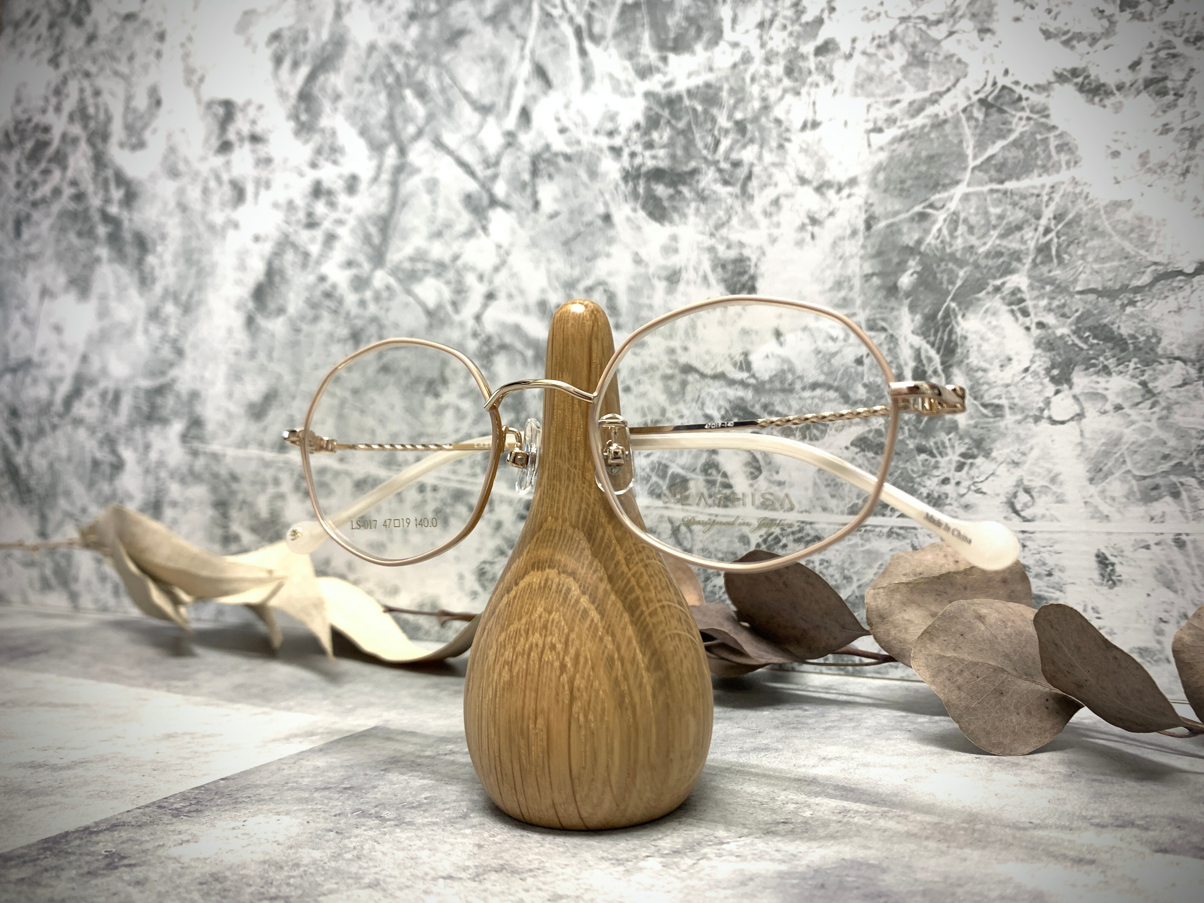 ラウンドっぽいオクタゴンシェイプのフロントに細身メタルの落ち着いた雰囲気が絶妙なメタルフレーム。フロントリムはコーラルピンクの柔らかなカラーリングで、先セル(耳当て)もシェルホワイトで雰囲気を合わせたお洒落な作品。テンプルメタルはらせん状のデザインになっており、フェミニンになり過ぎないモダンなアイテムです。