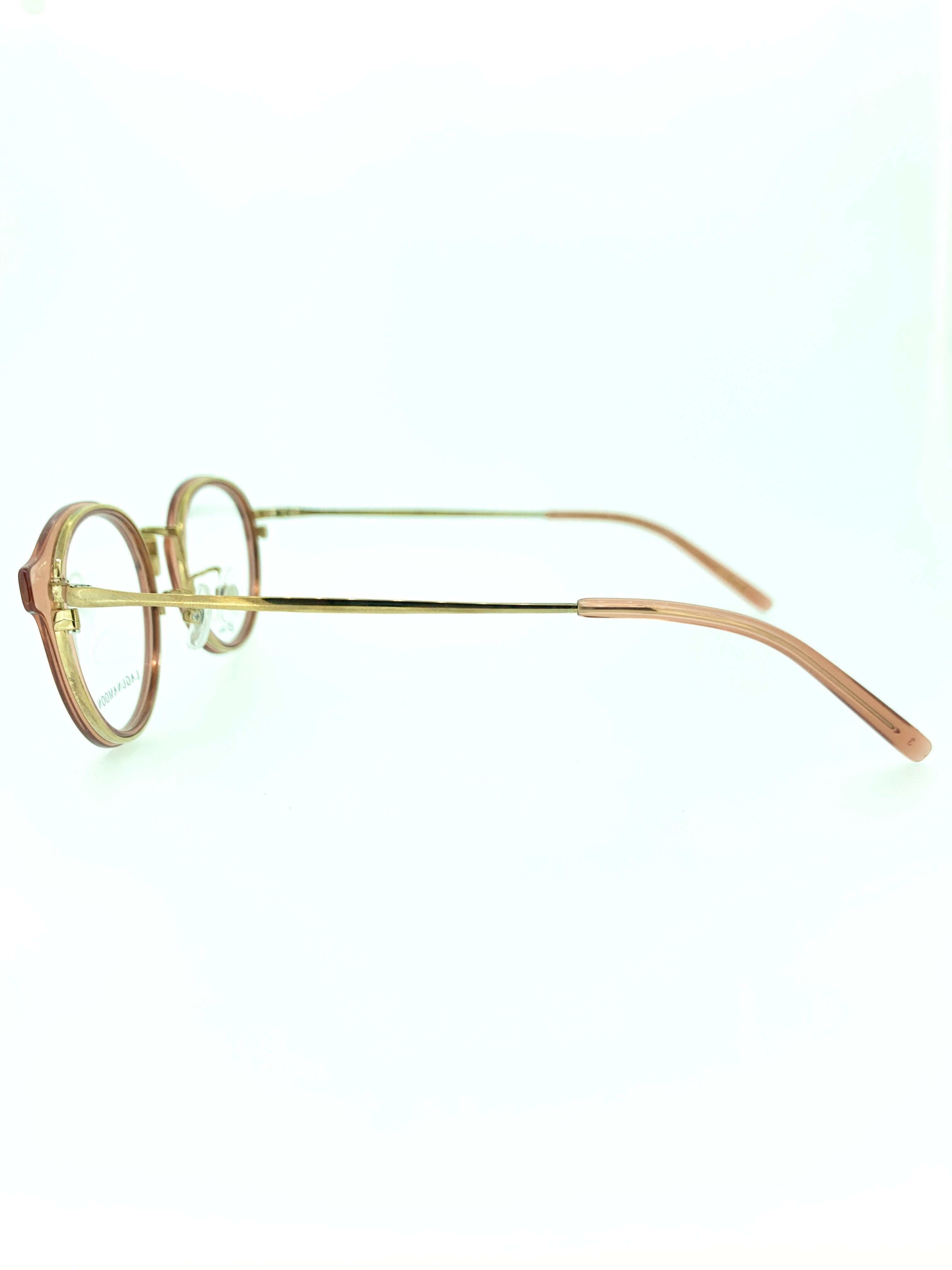 シックなゴールドメタルのフレームにアガットカラーのクリアセルを重ねたフロントデザインが特徴の作品。クリアセルを活かした奥行きと立体感のあるフレームワークは、シンプルながらほど良い遊び心を加えてくれて気分も上がるお洒落な仕上がりになっています。暖色系のカラーと相性の良い丸みのあるラウンドシェイプも可愛らしいですね。