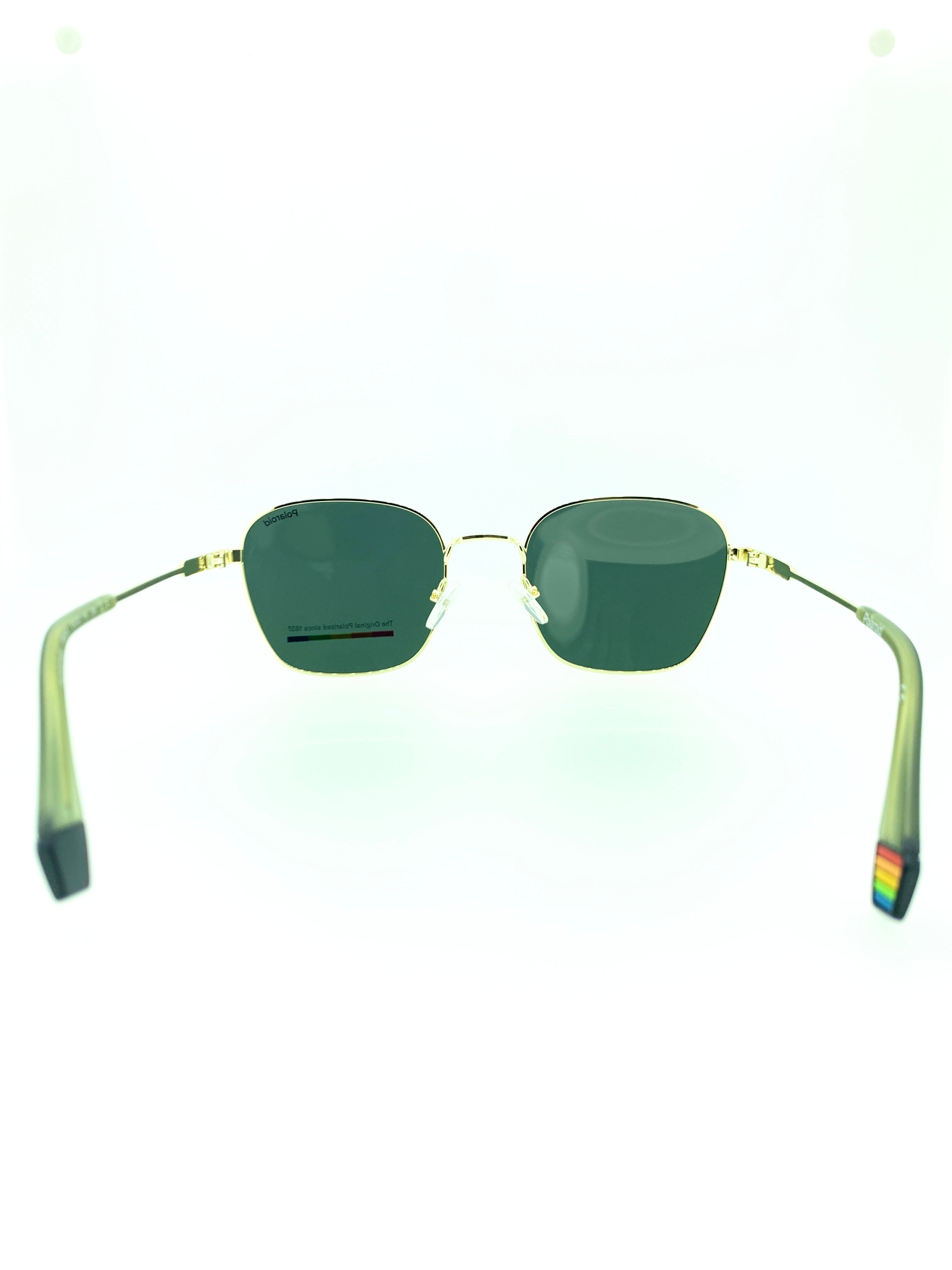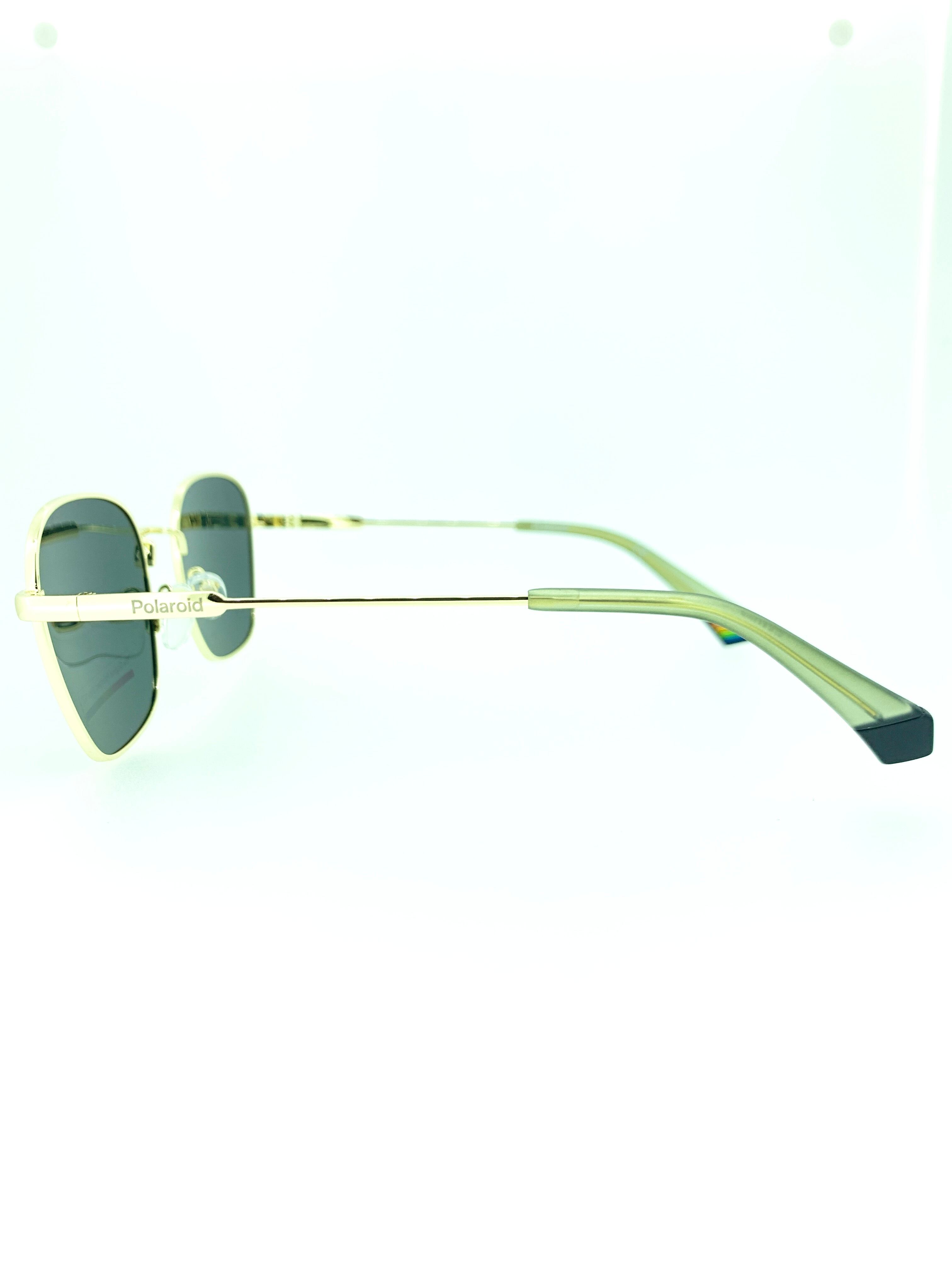 台形のような特徴的なシェイプデザインに細身のゴールドメタルにワイルドにまとめたお洒落な偏光サングラス。煌びやかなイエローゴールドのメタルとグリーンベースのカラーレンズの相性も抜群で、グッと雰囲気を引き立ててくれるカラーリングになっています。先セル(耳当て)は淡いクリアカラーにすることでカジュアルダウンしているので、かけやすくしているのも高ポイント。