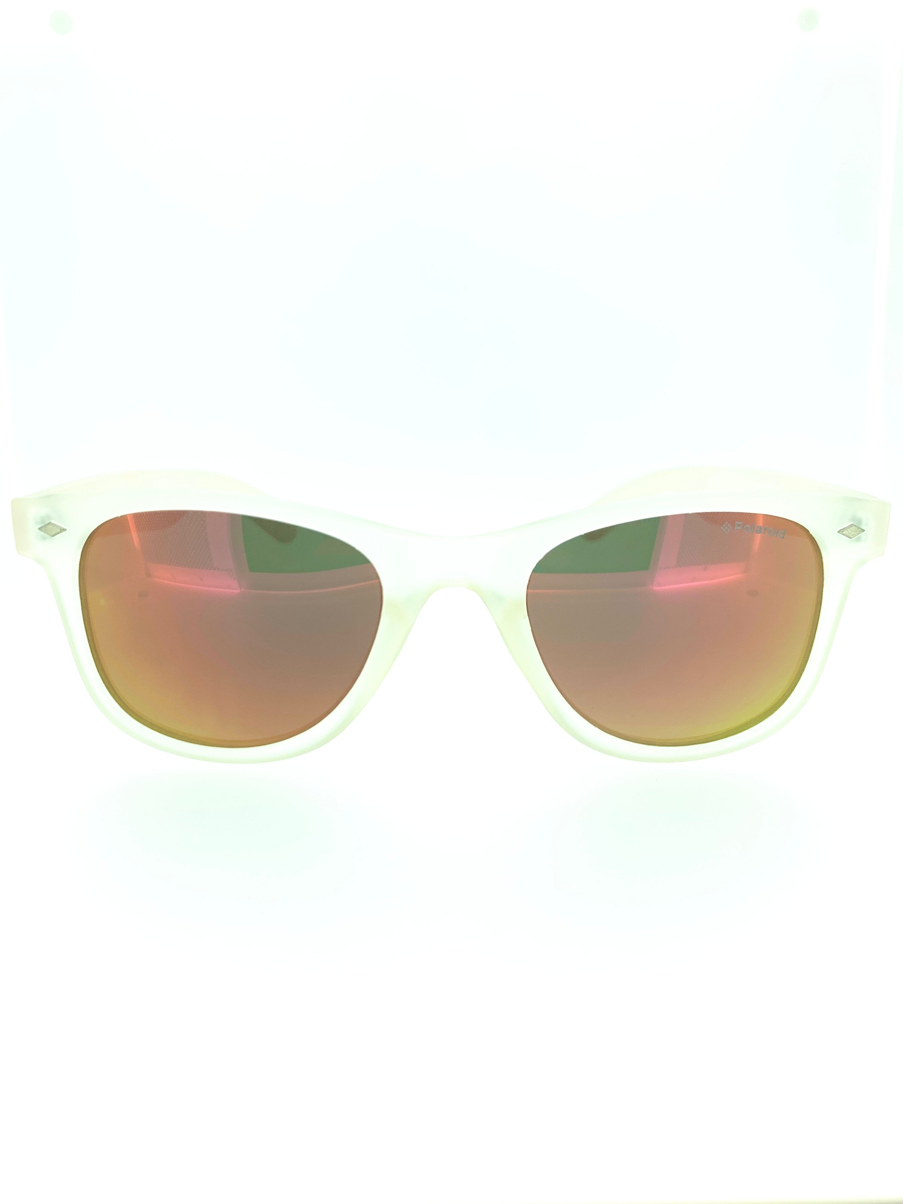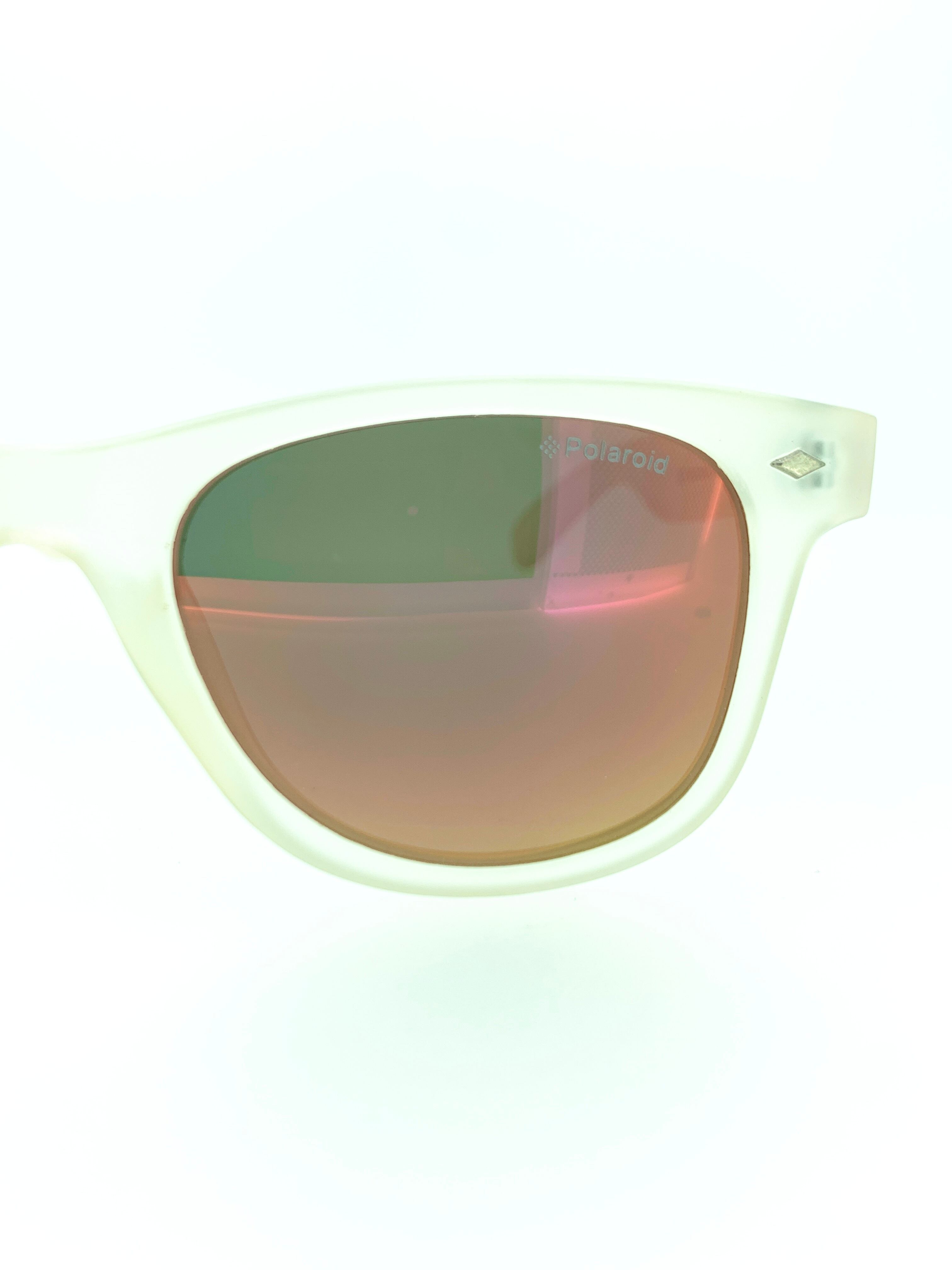 クリアホワイトの樹脂フレームにピンクのカモフラージュ柄を合わせたPOPな作品。ティアドロップのように目尻に若干の天地幅を持たせたシェイプデザインが、カラーリングと合わさってよりサングラスらしいシルエットにまとめられています。レンズはミラータイプの偏光レンズを採用し、アクティブなシーンにマッチするお洒落なデザインとなっています。