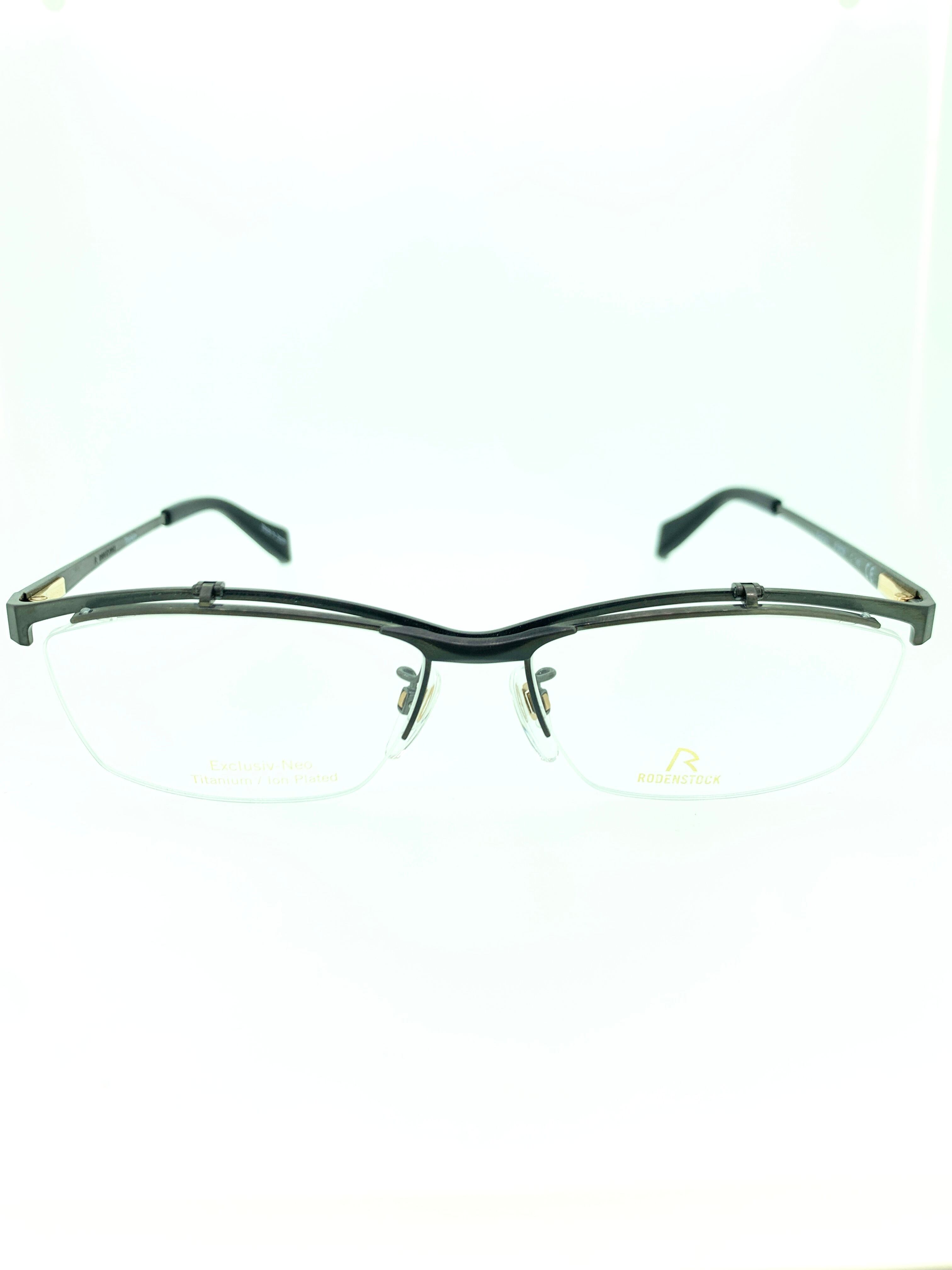 なだらかな曲線に角をしっかりと残したスクエアシェイプの跳ね上げ式ナイロールフレーム。重厚感のあるダークグレーのメタルフレームは軽量で丈夫なチタニウムを使っていて、存在感に対して軽やかなかけ心地を再現しています。テンプルにはバネ丁番を採用し、ほど良いフィット感と安定感があり、老舗メーカーの高い技術を集約した一品となっています。