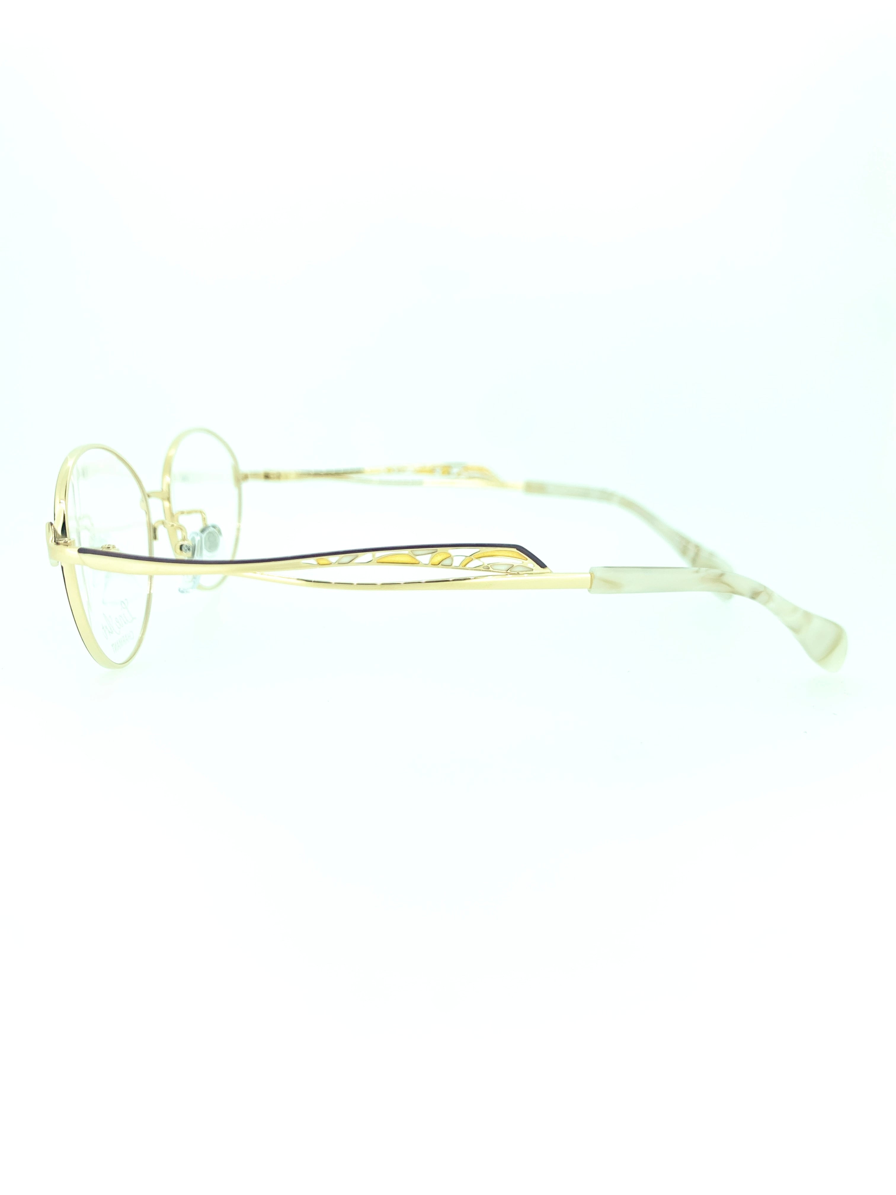 ボストン風オーバルシェイプにボルドーのリムカラーが力強くも清潔感のある雰囲気を醸し出すエクセレントチタンフレーム。煌びやかなイエローゴールドの下地にパールのような高級感のある先セル(耳当て)でバランスの取れたラインアートらしい美しさがあります。テンプルのステンドグラスのようなデザインも眺めていて美しい仕上がりです。