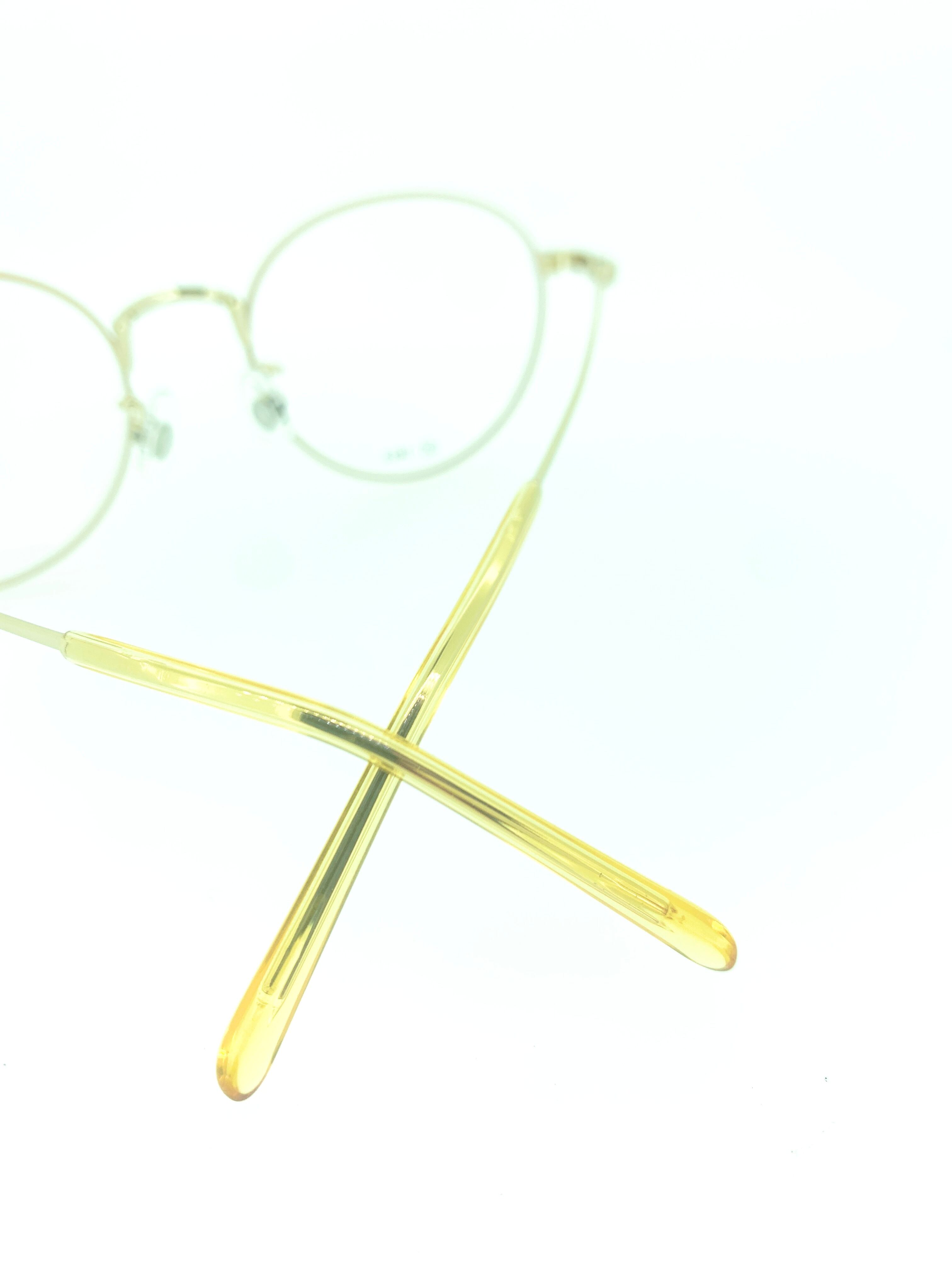クリームカラーのフロントリムにゴールドメタル×クリアイエローの先セル(耳当て)と色味を揃えたカラーリングがお洒落なメタルフレームです。癖は少ないが他とは被らないカラーリングで、しっかりと個性を主張できる顔馴染みの良いフレームとなっています。人気で王道のボストンシェイプになっている為、輪郭を選ばないのも嬉しいポイントです。