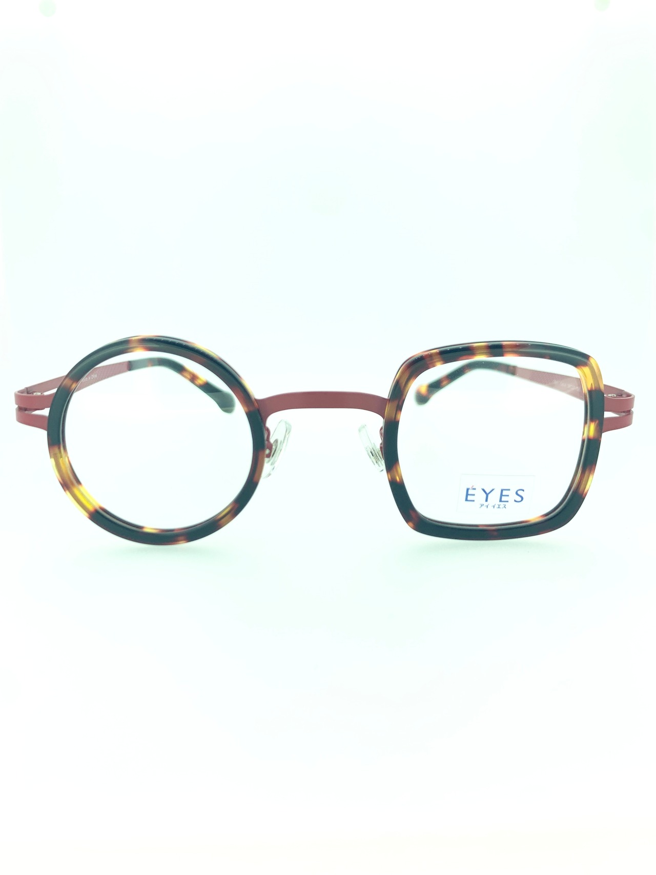 渋くも淡い色味のマリーアントワネットカラーが独創的で左右非対称のシェイプデザインのフロントが合わさって、圧倒的な個性とお洒落さのあるメタルフレーム。右側には優しくレトロな雰囲気のラウンドシェイプ、左側は少し丸みのある正方形に近いスクエアシェイプとなり、対照的なセルワッパデザインになっています。他と被らないお洒落なスタイルを演出できるオススメ作品です。