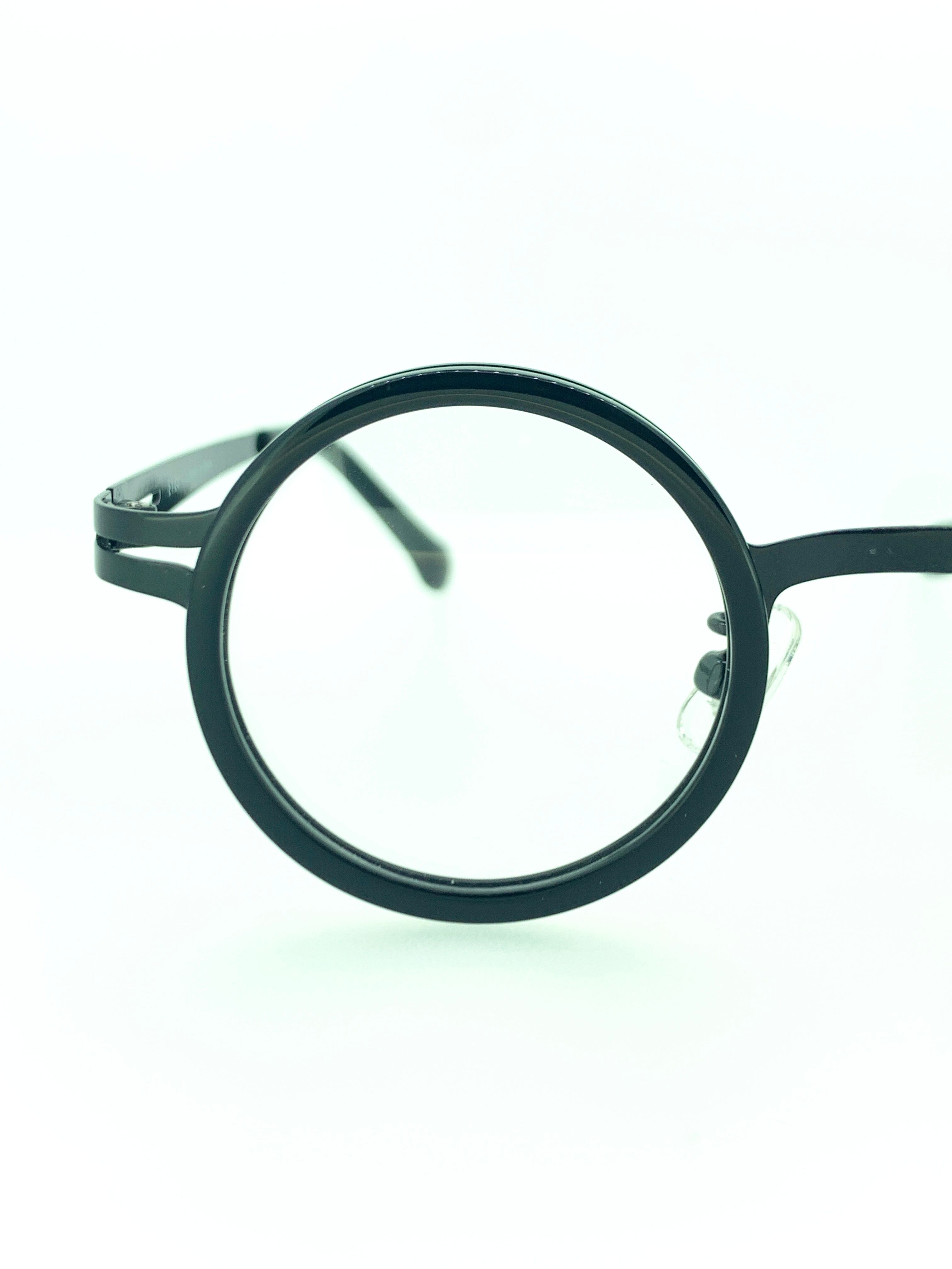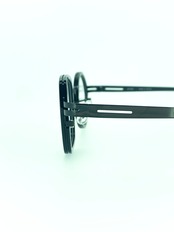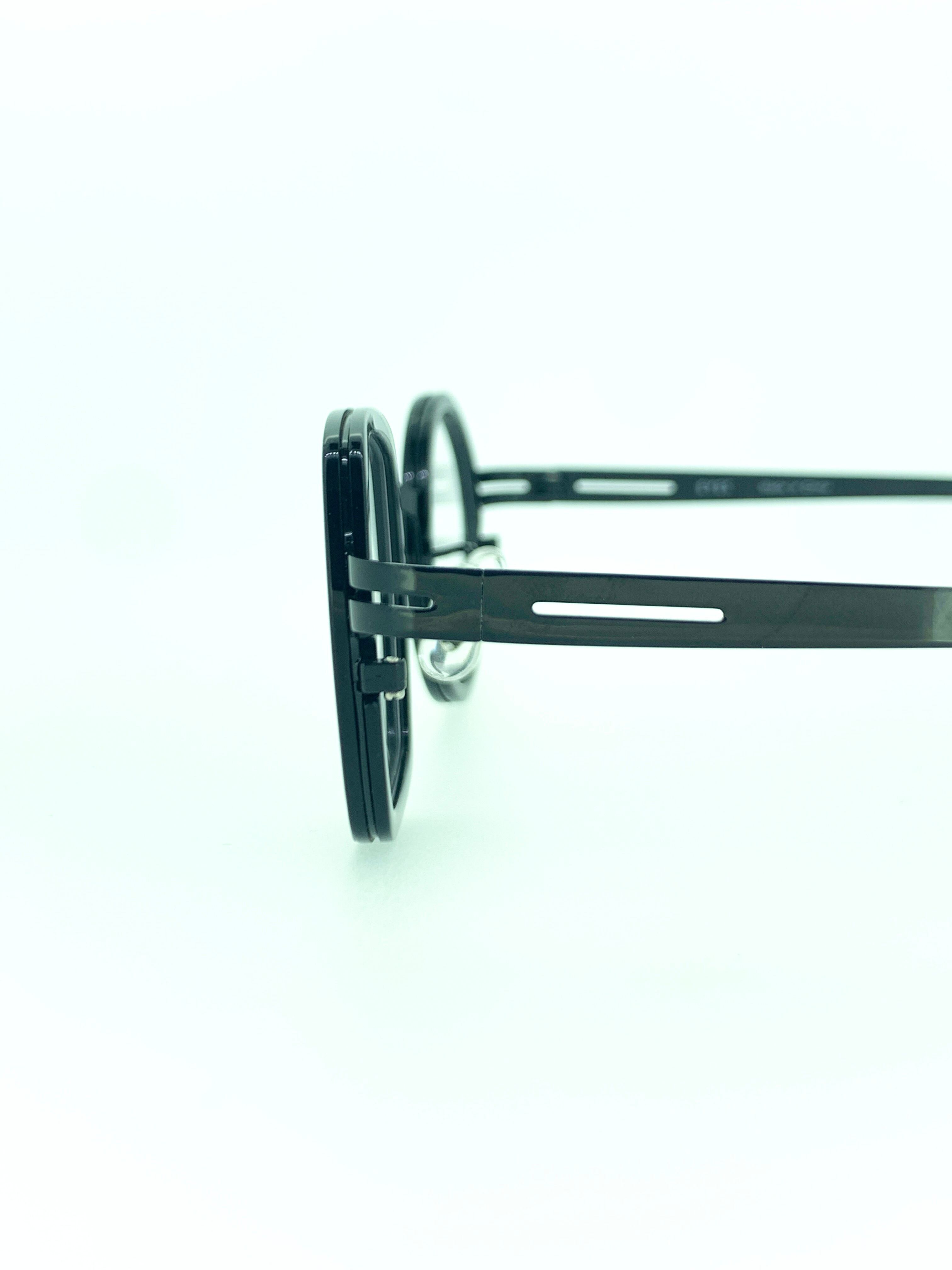 オールブラックのシックでスタイリッシュなカラーリングに左右非対称のシェイプデザインのPOPなフロントが、圧倒的な個性とお洒落さのあるコンビネーションフレーム。右側には優しくレトロな雰囲気のラウンドシェイプで、左側は少し丸みのある正方形に近いスクエアシェイプとなり、対照的な雰囲気のシェイプデザインになっています。他と被らないお洒落なスタイルを演出できるオススメ作品です。