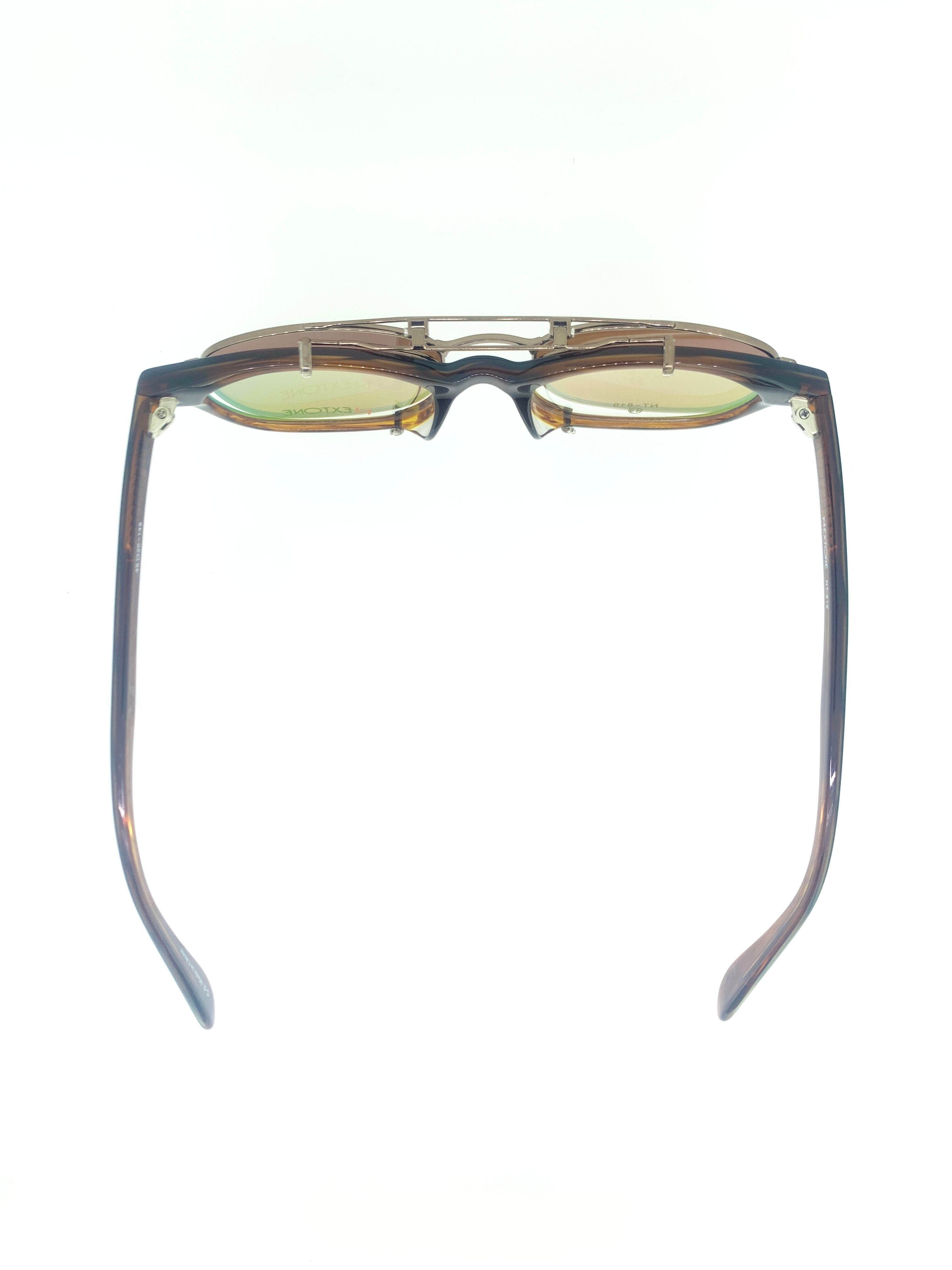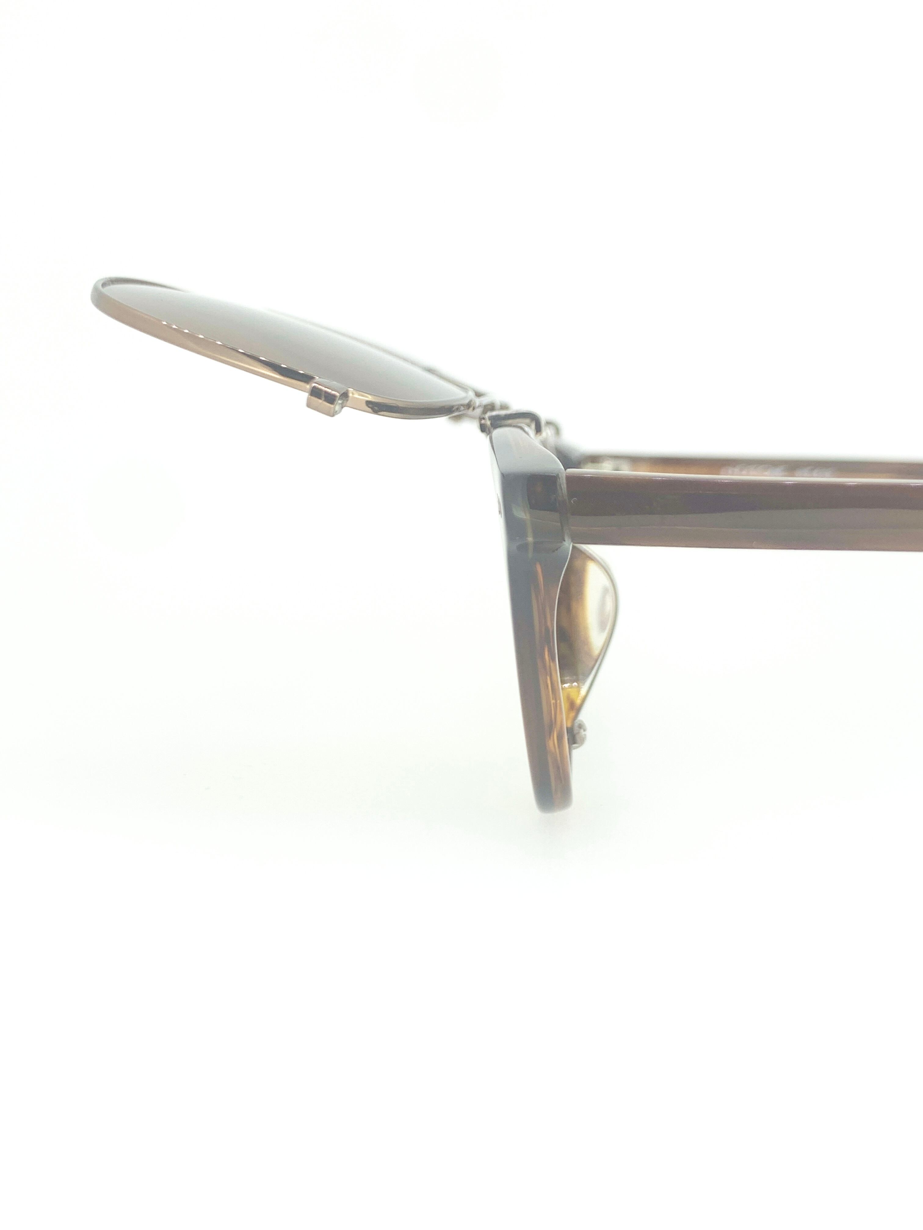 ブラウンセルのウェリントンシェイプに重厚なメタル感がレトロな雰囲気を醸し出す跳ね上げ式クリップ付きのセルフレーム。ほど良い天地幅で輪郭を選ばないクラシカルなセルフレームやクリップのメタル地に掘られたアンティーク調のデザインやミル打ちなど、随所に盛り込まれた味のあるデザインに目を惹かれます。コーデのアクセントにも抜群な至極の一品。