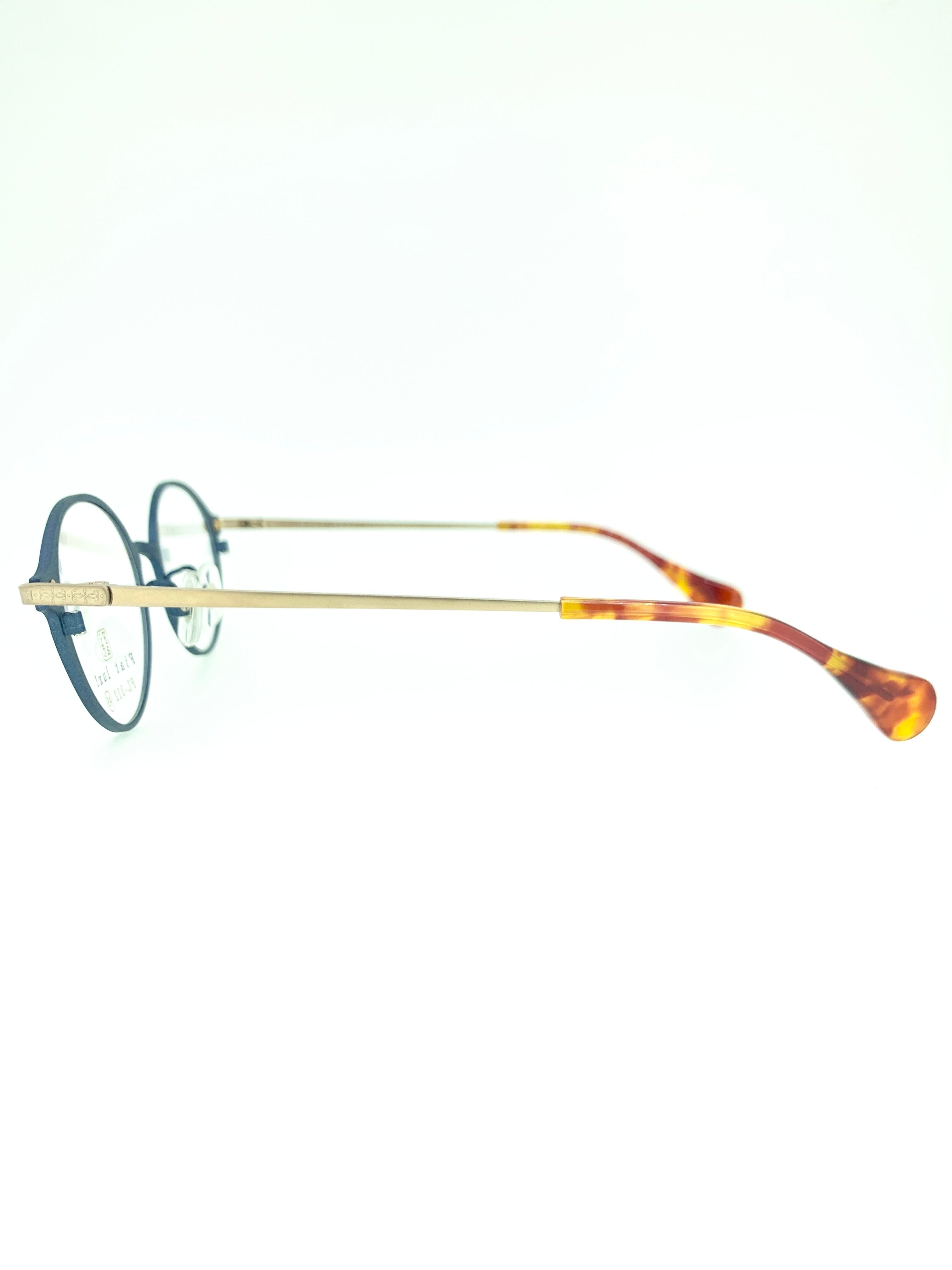 マットなダックブルーのフロントにマットなゴールドテンプルを合わせた色味と質感が特徴的なメタルフレーム。フロントメタルはメッキの上塗り感が無くナチュラルな仕上がりによって上品で綺麗な仕上がりとなっています。相対するオレンジベースのブラウンデミの先セル(耳当て)とのコントラストが抜群にお洒落です。顔馴染みが良くどんなスタイルにも合わせやすいボストンシェイプも嬉しいポイント。