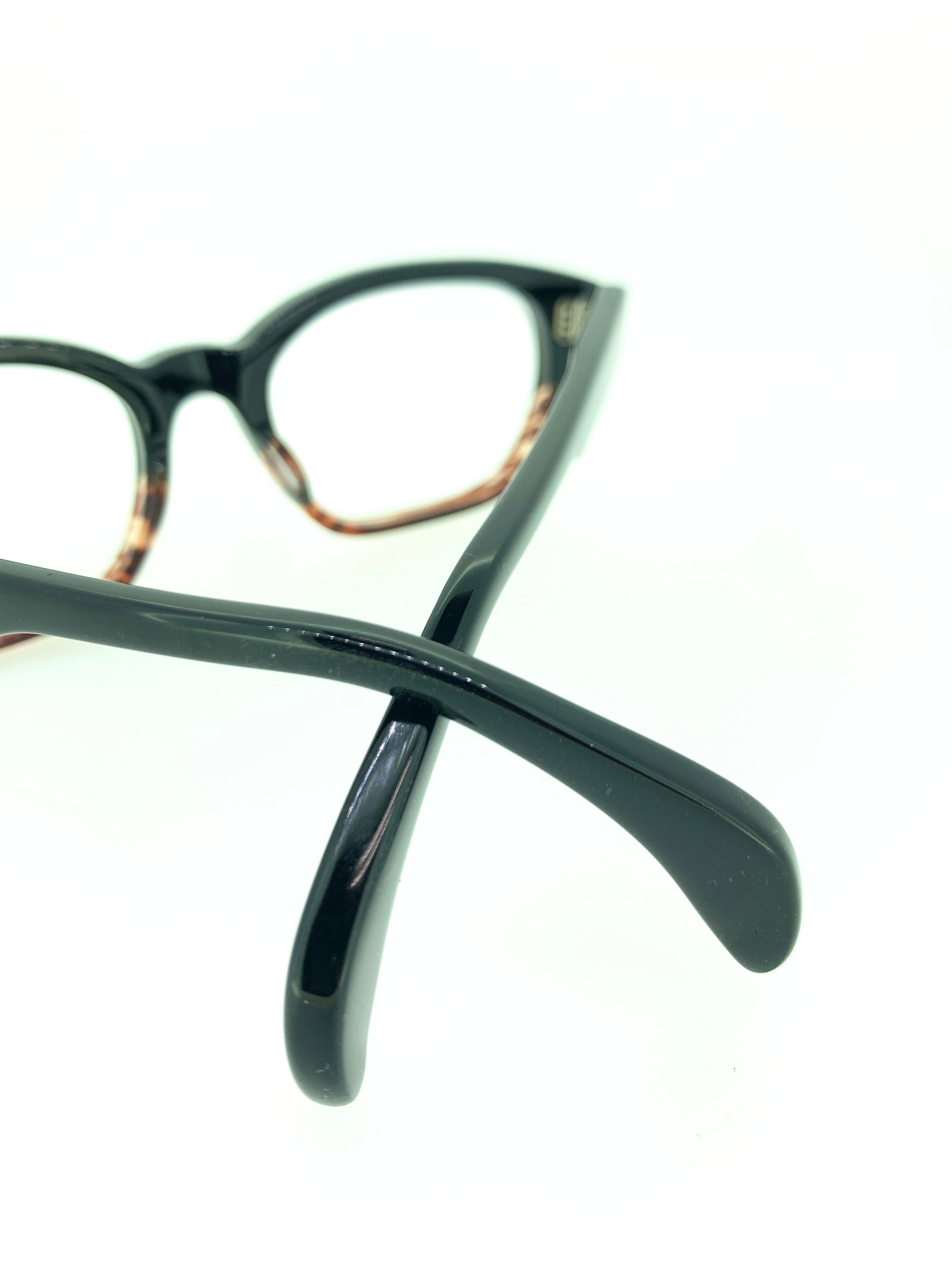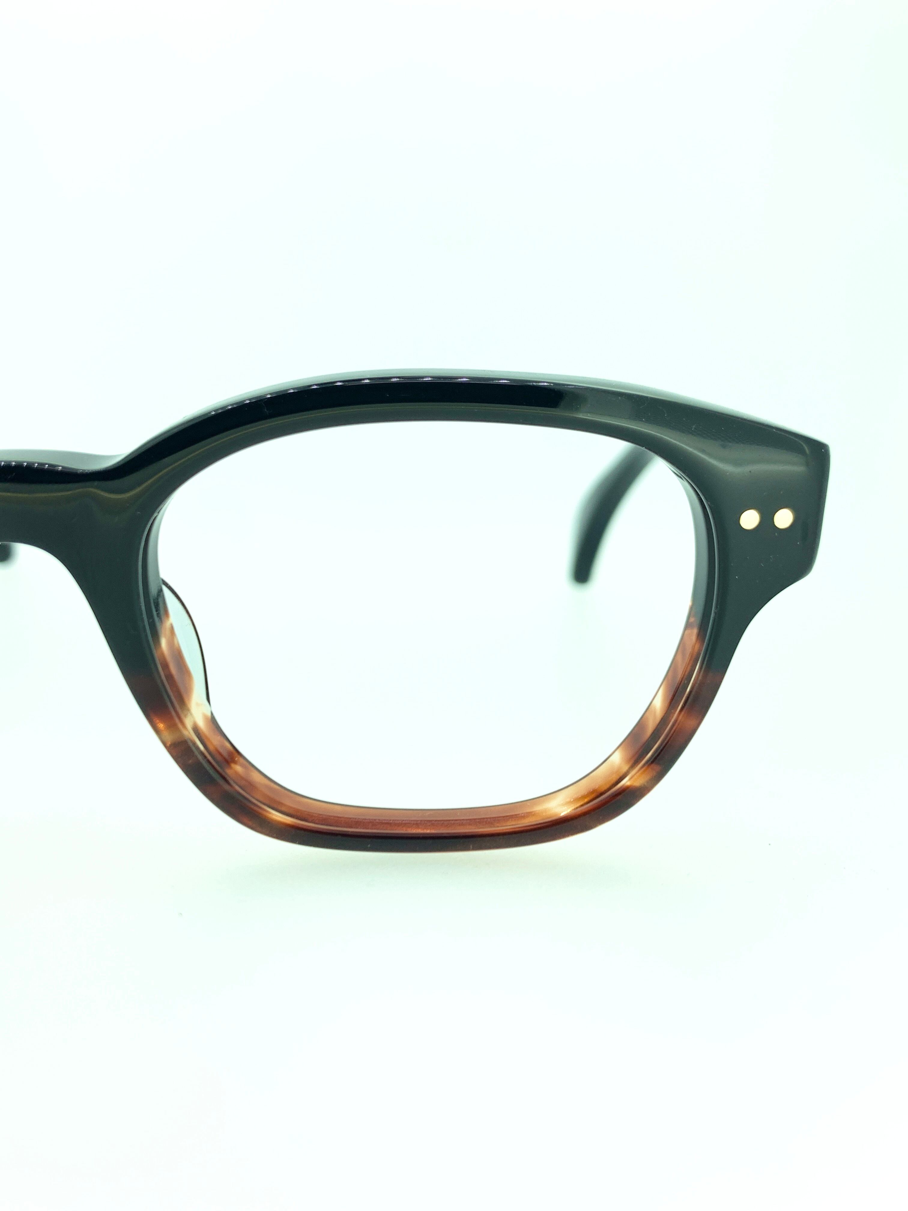 丈夫で型崩れしにくいセルロイドを使用し、ヨロイと丁番部分に10金飾りを施した美しいウェリントンフレーム。ほど良い厚みのフレームに角を落とした滑らかなフレームラインは日本の細やかな技術の光るデザインとなっています。フロントはブラック×ブラウンササのバイカラーになっていて、シックでカジュアルにかけられるお洒落な仕上がりです。