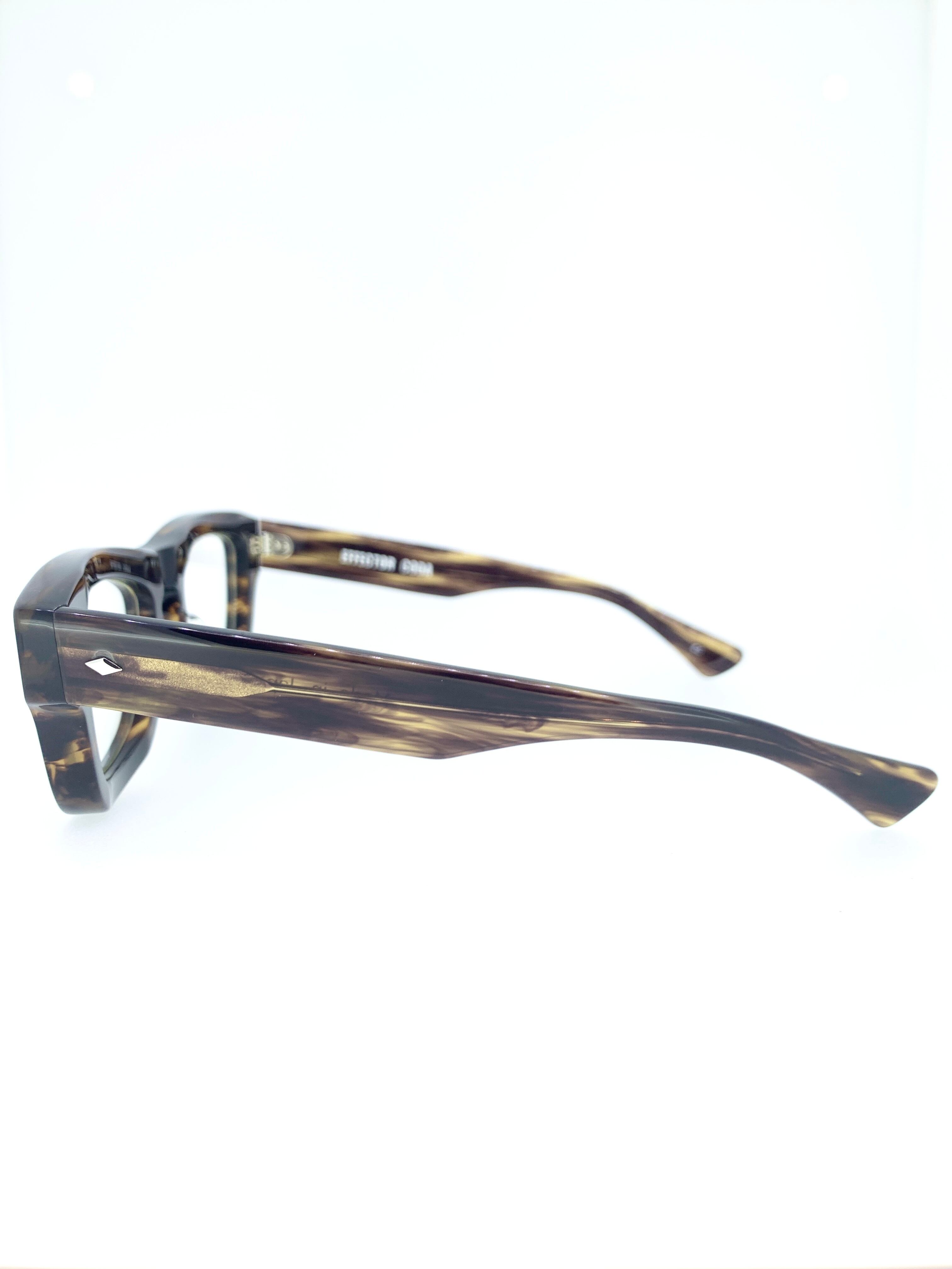 厚みのあるセル生地の面を立たせたエッジの効いたシルエットがキリッとした表情を魅せるウェリントンシェイプのセルフレーム。端正で誠実なフロントラインに広く深い色合いのブラウンササが良くマッチしています。テンプルはしっかりと幅を持たせ、カジュアルながらモードシックな装いで、様々なスタイリングにマッチした優秀な作品です。