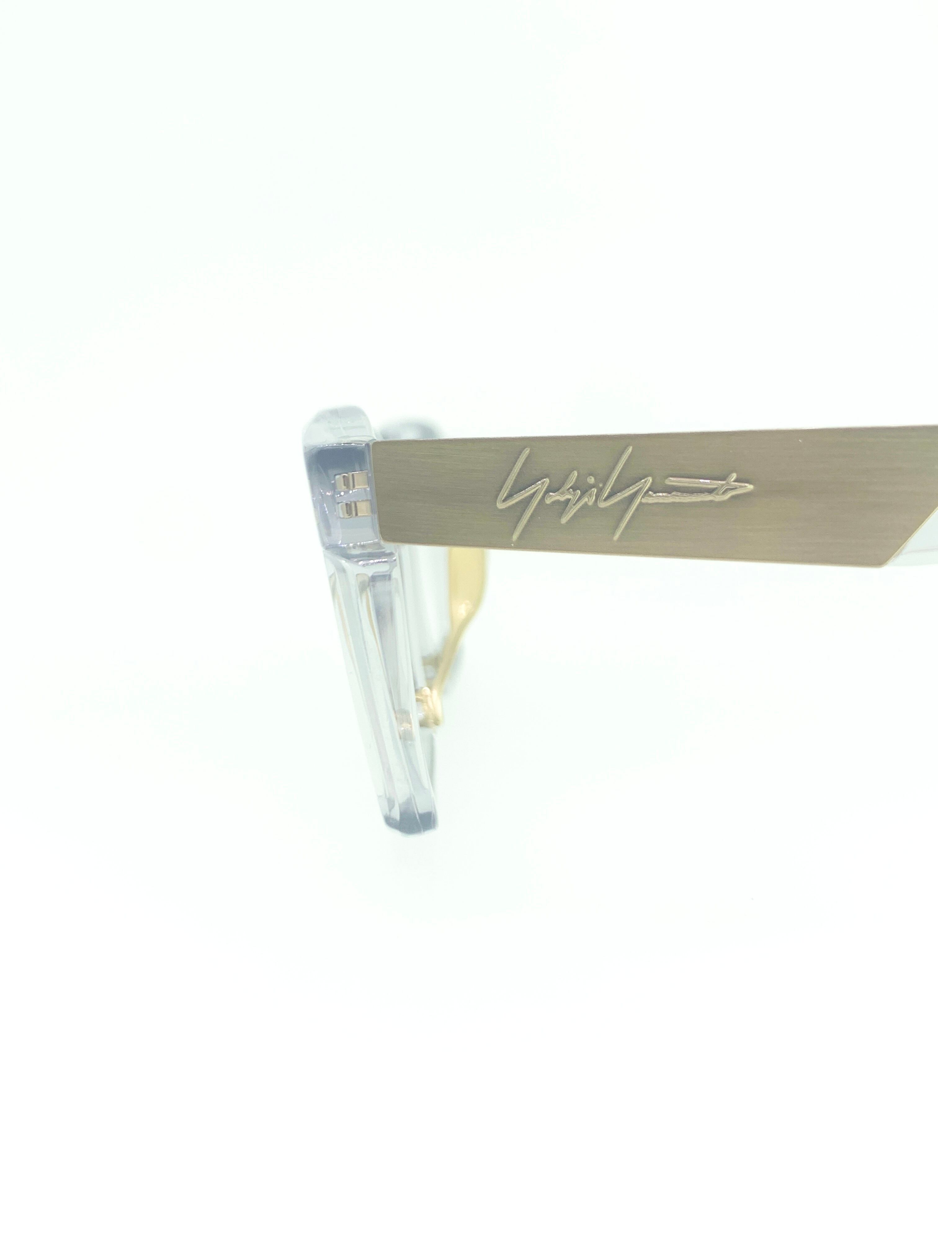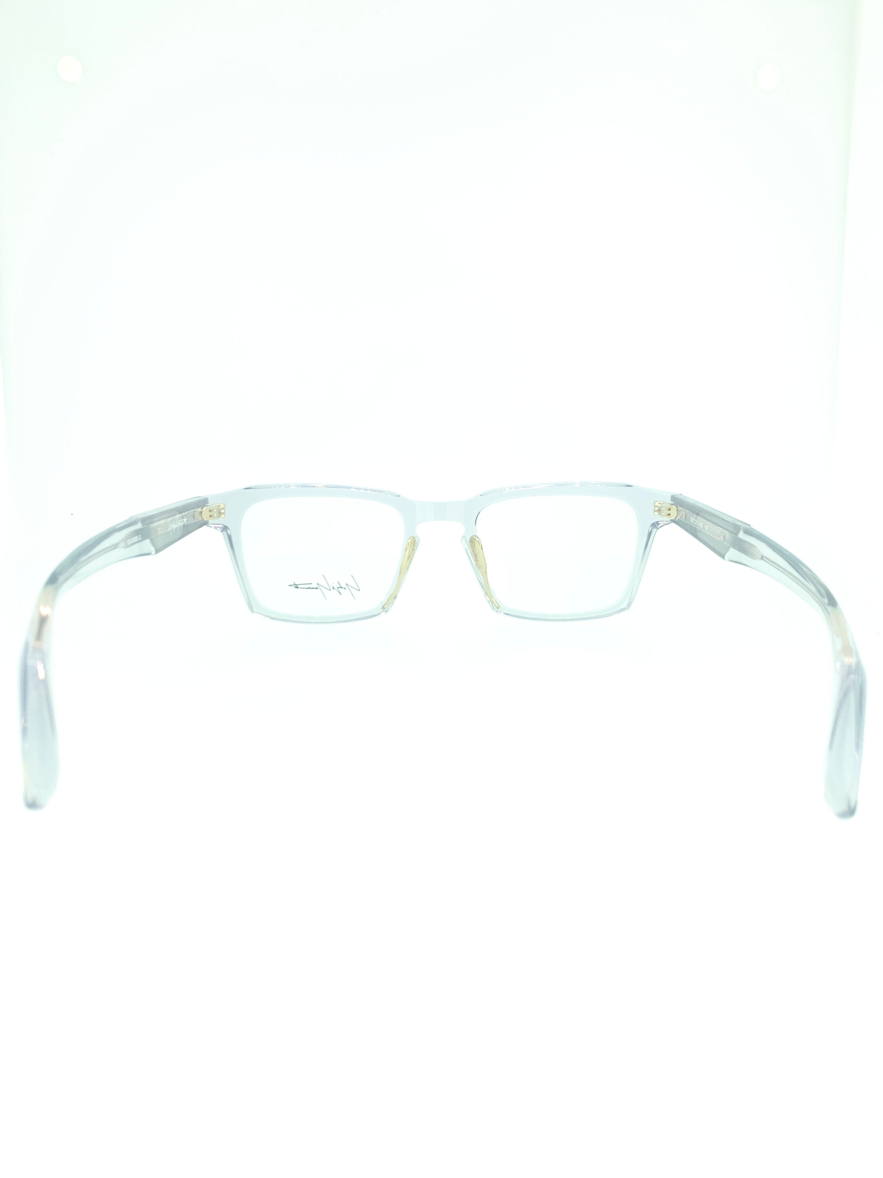 クリアグレーのセル生地にゴールドメタルの煌びやかさが光るウェリントンシェイプの格好良い作品。スクエアシェイプのようにシェイプラインにエッジを効かせることで、カジュアルになりやすいセルフレームでもしっかりとスタイルを引き締めます。テンプルにはゴールドのプレートにロゴが刻まれていて、メタル地の鼻パッドと合わせてアクセントを加えます。